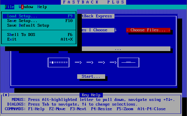 FastBack + Fastback Plus, by Fifth Generation Systems, Inc, is a backup utility for DOS.Its key feature is that it can read and write both a floppy disk and hard disk at the same time by making use of dual-channel DMA. Combined with speedy data compression, it can make a very fast backup of your hard disk to floppies.