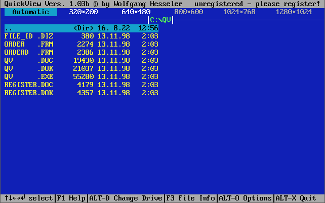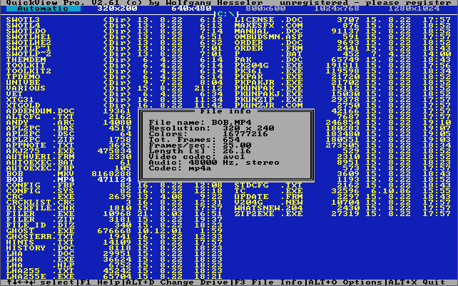 Quickview Pro QuickView Pro is a DOS-based multimedia viewer written by Wolfgang Hesseler. The product is shareware.It supports videos of type MP4, DIV, AVI, MPG, MOV, QT, VideoCD and more, music audio of type MP3, WAV, VOC and more, and pictures of type JPG, BMP, GIF, PCX, TGA and more.