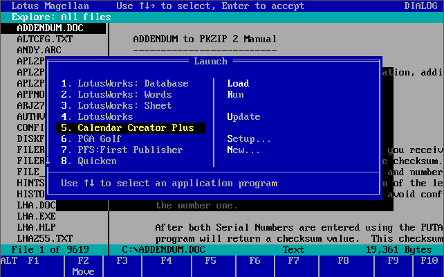 Lotus Magellan Magellan was a desktop file viewer and search tool. It indexes all files on your hard drive, and you can search for related information across file formats. The program comes with a demo to help you get up to speed quickly on its use.The download above is the full product. Click here to download the PC Magazine demo cover disk image.I have a dedicated Lotus Magellan page here at DOS Days. |