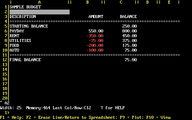 SuperCalc 2 followed in 1983 with a split-screen option where you could view and edit cells on the left side of the screen, and view graphs on the right. It ran on MS-DOS 1.1 as well as CP/M-80 and -86.