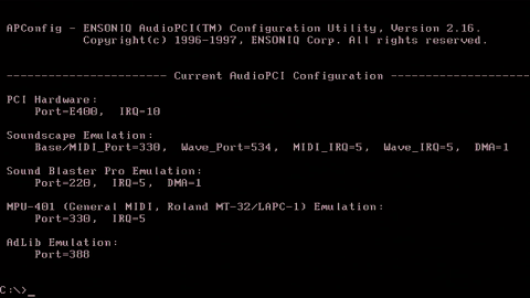 The Ensoniq AudioPCI DOS driver included Ensoniq Soundscape 16-bit digital audio and sample-based synthesis support, along with support for Sound Blaster Pro, AdLib Gold, General MIDI, and Roland MT-32. However, without actual hardware for FM synthesis, FM music and sound effects were simulated using samples, often with unacceptable results. Therefore, it was more practical to configure DOS games to utilize the General MIDI synthesizer and digital sound effects whenever possible for better sound quality.