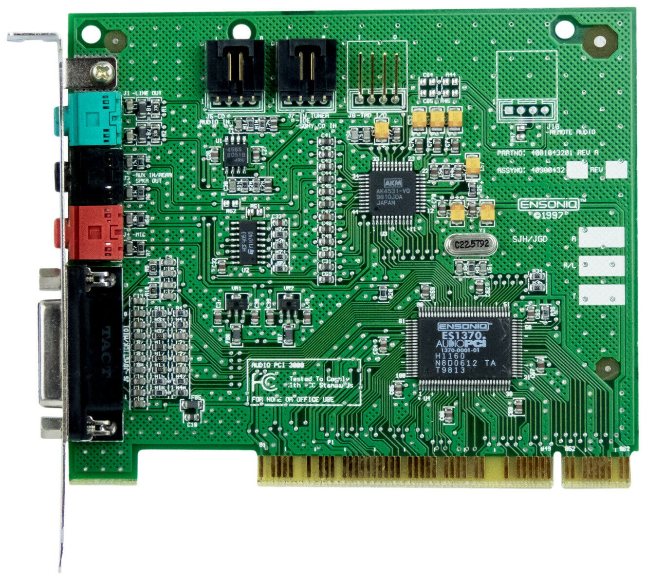At the heart of the first AudioPCI cards was Ensoniq's ES1370 chip. In order to keep the cost of manufacture and design way down, some of the handling of audio functions for this chip were handled by the host PC in software [the driver], not in the ES1370 chip. The ES1370 consisted of: