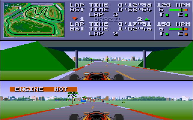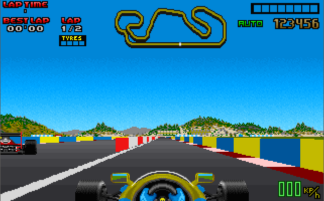 In Arcade mode, you race on a single circuit, Interlagos in Brazil. It's the quickest way to get behind the wheel for a short blat. Before starting the race you have the option of 1 Player or 1 Player Turbo. The 'Turbo' option here puts the game into a lower resolution (160 x 200?) so it runs super-fast! The non-turbo option is in 320 x 200 and runs slightly more pedestrian. You also get the option to select your wing height for more downforce (making your car slower but with better traction or faster with less traction), manual or automatic transmission, and the tyre compound. You're then into the race.