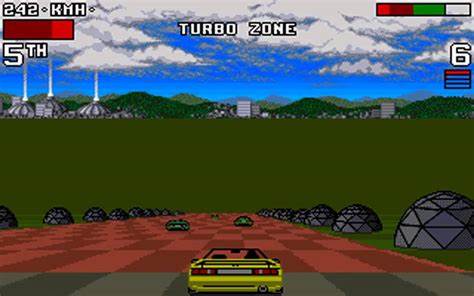 Race either against the clock or an opponent over numerous types of track including desert, mountain, windy, space(!), forest, and quite a few more. These can be laps around a circuit or point-to-point like a rally. You get to choose from three Lotus cars: the Esprit S4, Elan (which had the development code of M100), or the M200 prototype. Each race you complete opens up a code that you can write down and re-input later to jump to that race.