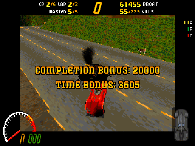 As you win races and/or cause carnage, you earn points which are instantly available to you to repair your car (with Backspace) or recover your car if you cannot get back on the road or onto four wheels (with Insert). At the end of the race all the points remaining get converted into a score that move you up or down in the ranking.