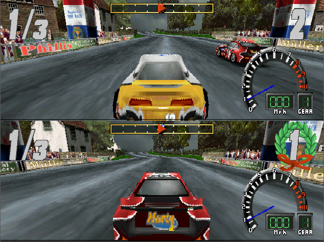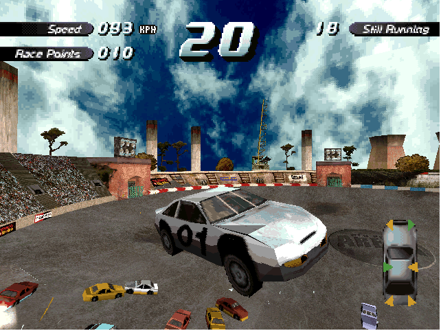 Gameplay: Despite the negative points I mentioned, I strangely kept going back to play this again and again. And it wasn't so much for the crashes - I love the fact that you can inadvertently go from middle of the pack to front runner purely because of the other drivers crashing and all you need to do is avoid the pile-up - it's fairly common. The championship layout is confusing, with different leagues you get promoted into or relegated from depending on your performance, but the points system doesn't make much sense - it's all rather disjointed as a game, like they added all these things at the 11th hour around a 3D driving game. The crazy destruction derby itself is highly disappointing compared to the track races - in 'Total Destruction' all the other cars aim straight for you - you really don't stand a chance, so what's the point in putting it into the game?! It's not clever or fun - having the ability to switch views so you could see to your sides or rear would have been a good idea, so you could plan your strategy a little more. 7/10