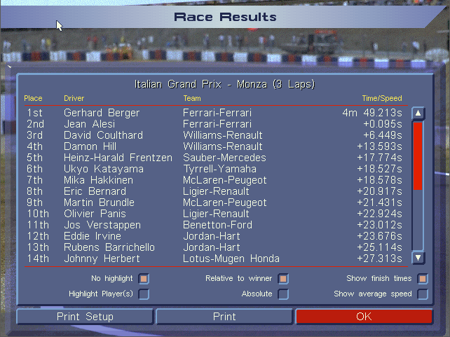 Grand Prix 2, like its predecessor, shines not only for its gameplay but also its attention to detail. Even doing a quick race of 3 laps provides you with a good amount of post-race analysis so you can check your lap times against the other drivers for the race, as well as against the historical records set on that track. There is a tremendous amount of detail in the car setup portion of the game if you want to delve more deeply in the car physics aspect, and any car setup can be saved and restored. This is especially useful in the Championship, where you would have a different car setup for each track.