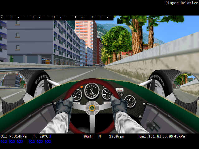 GPL was the pinnacle of graphical fidelity in a racing simulation for 1998, supporting resolutions up to 800 x 600 (though the main menus are all in 640 x 480). Later aftermarket improvements enhanced this up to 1600 x 1200. The trees really look like trees and cast shadows on the track, the view in your wing mirrors is as photorealistic as what you see out in front, the track edges are lined with spectators, period-correct advertising billboards, gantries and bridges adorn the track and there are even homes with cars in the driveway.