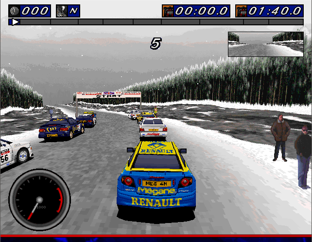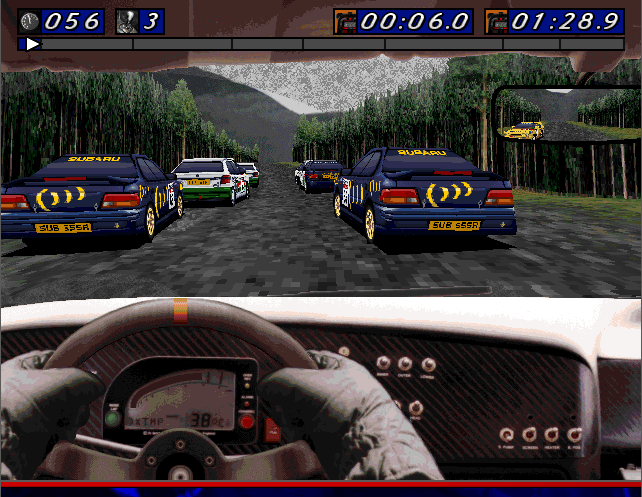You get to choose from one of six rally teams and their cars: the Subaru Impreza, Ford Escort RS Cosworth, Renault Maxi Megane, VW Golf GTi 16V, Skoda Felicia, and Proton Wira, all of which are displayed in lovely detail. The game contains all of the 1995 Network Q RAC Rally's 28 segments. These are all based in the UK and range from forest and gravel tracks to tarmac roads, some of which are snow-covered!