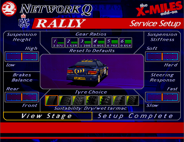 The AI of computer-controlled drivers can also be adjusted from a skill level of 1 through 4. This changes the drivers' aggressiveness and overall intelligence. There's also a lot of car setup you can perform between rally stages, including suspension settings, brake balance, gear ratios, tyre selection and the amount of fuel to carry.