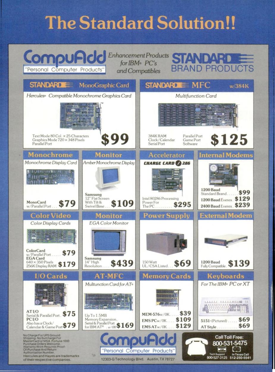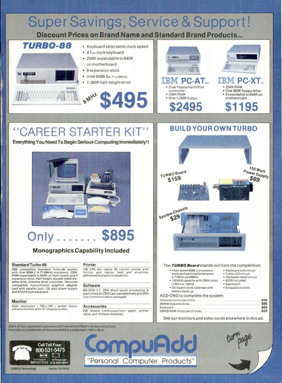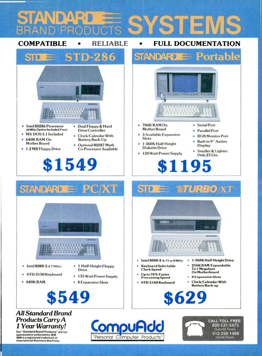This is the period in which CompuAdd began putting together their own desktop PCs under their 'Standard Brand Products' line which comprised the low-end Standard PC/XT (4.77 MHz), the Standard Turbo/XT (8 MHz), STD-286 (8 MHz), and the Standard Portable XT machine. These were advertised with a base unit price, upon which you could then pick the graphics card and monitor of your choice/price point. In parallel with their own range, they were also authorised resellers for IBM and Compaq, and as you can see in their adverts below, a cost saving was easy to see.