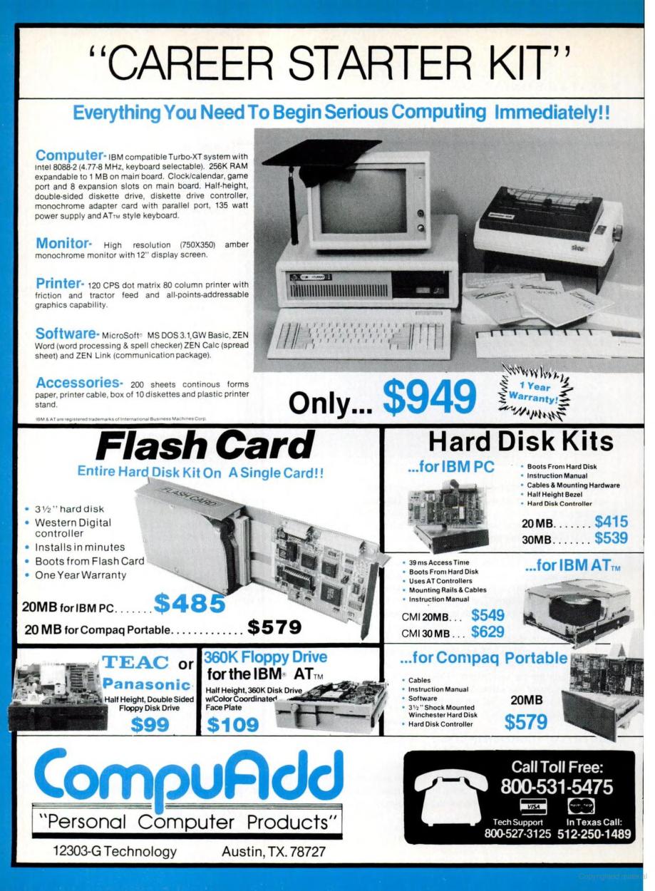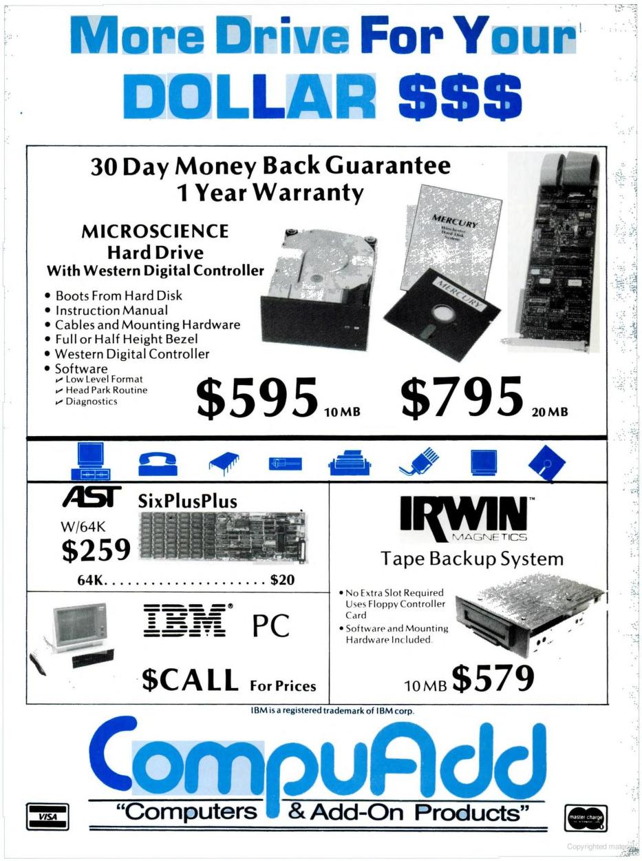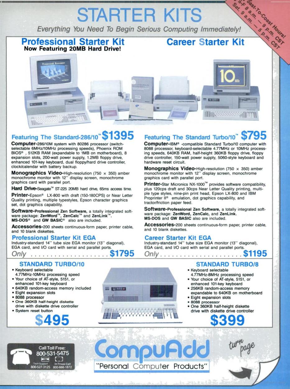 This is the period in which CompuAdd began putting together their own desktop PCs under their 'Standard Brand Products' line which comprised the low-end Standard PC/XT (4.77 MHz), the Standard Turbo/XT (8 MHz), STD-286 (8 MHz), and the Standard Portable XT machine. These were advertised with a base unit price, upon which you could then pick the graphics card and monitor of your choice/price point. In parallel with their own range, they were also authorised resellers for IBM and Compaq, and as you can see in their adverts below, a cost saving was easy to see.