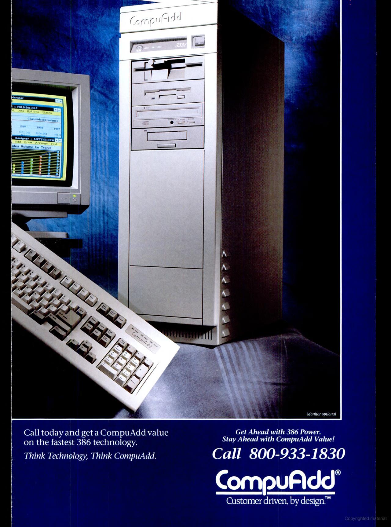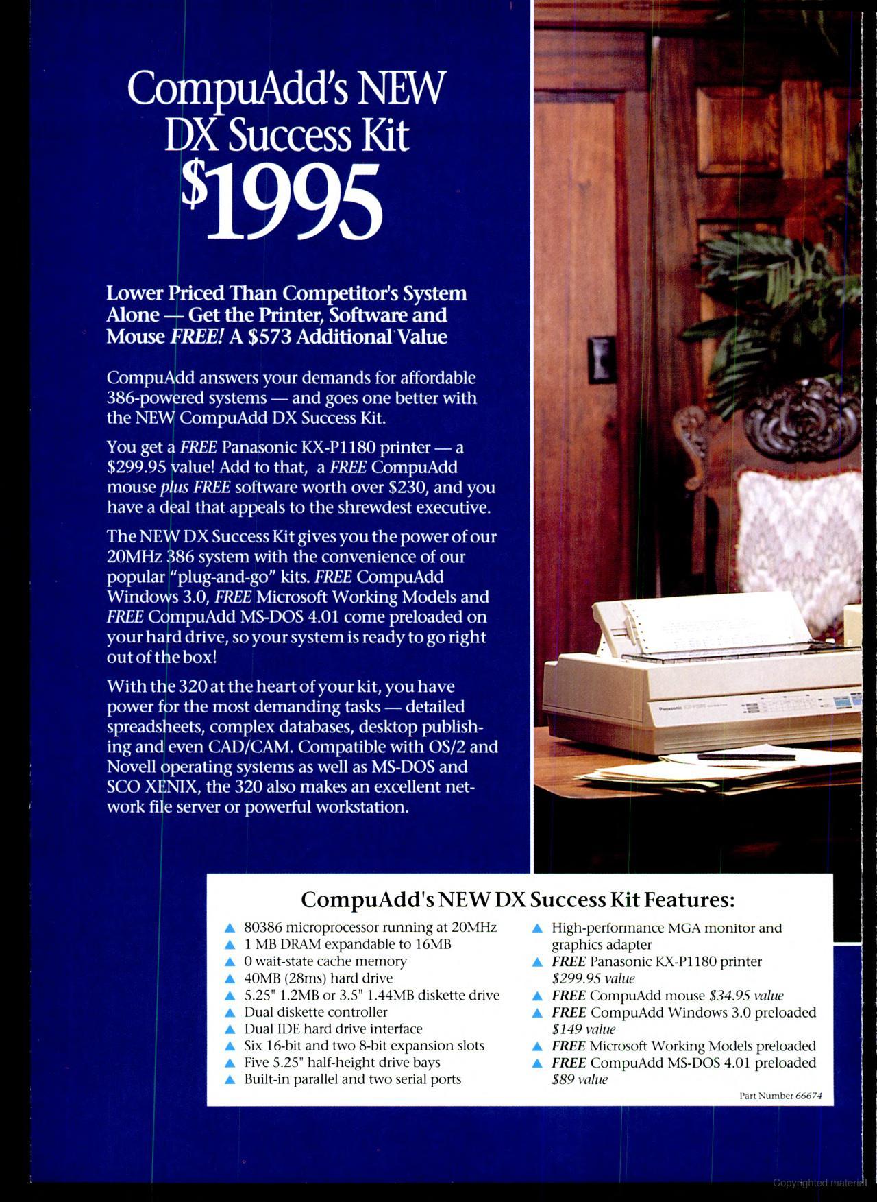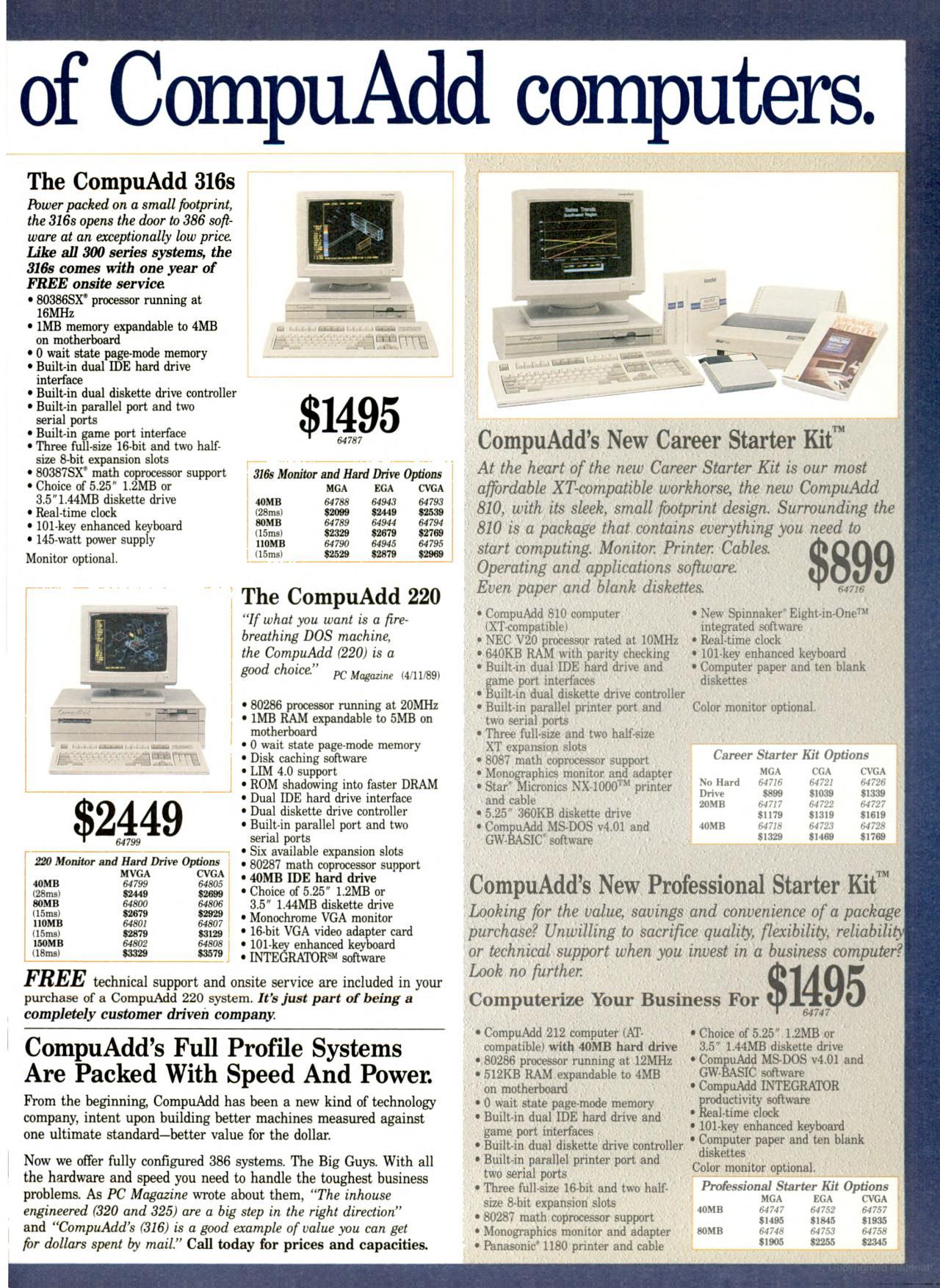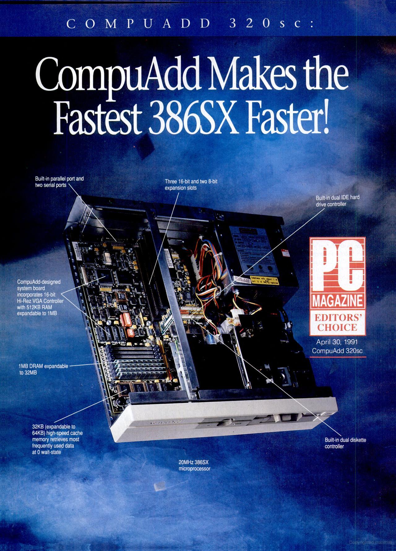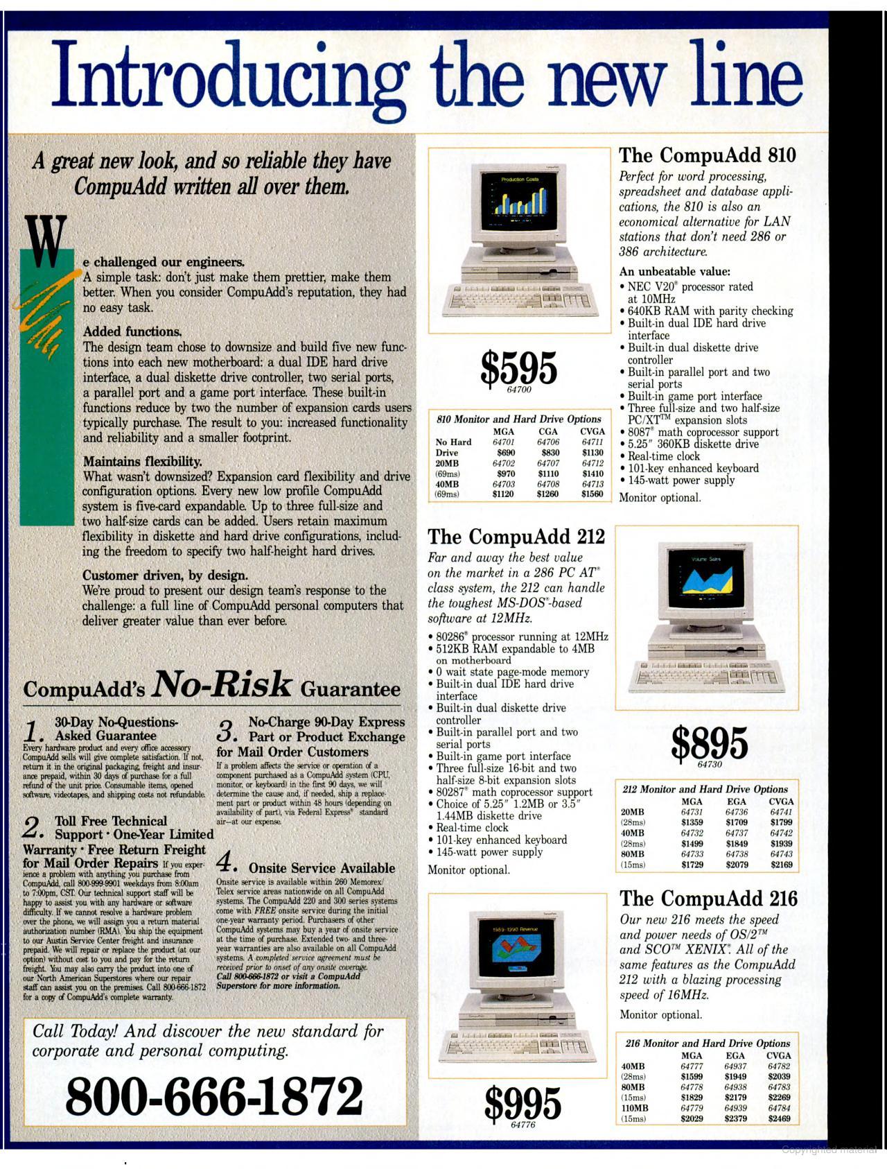 Again, the 286 range only came with 512 KB of RAM despite the fact the lesser NEC V20-based CompuAdd 810 came with 640 KB. The adverts aren't clear, but it's likely all the 386DX-based PCs came with 1 MB of RAM.