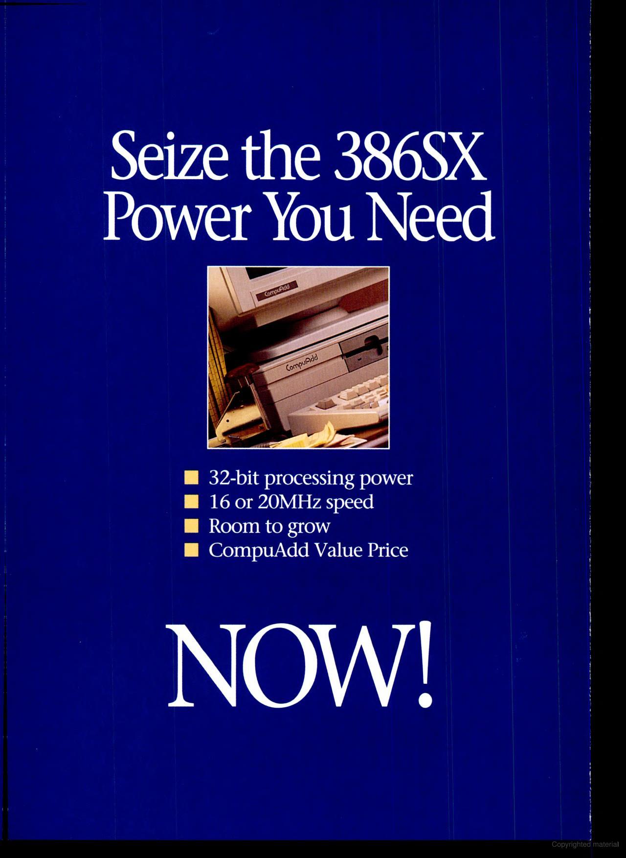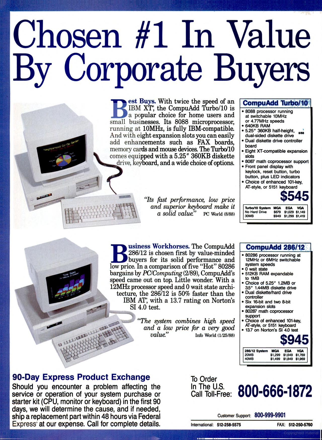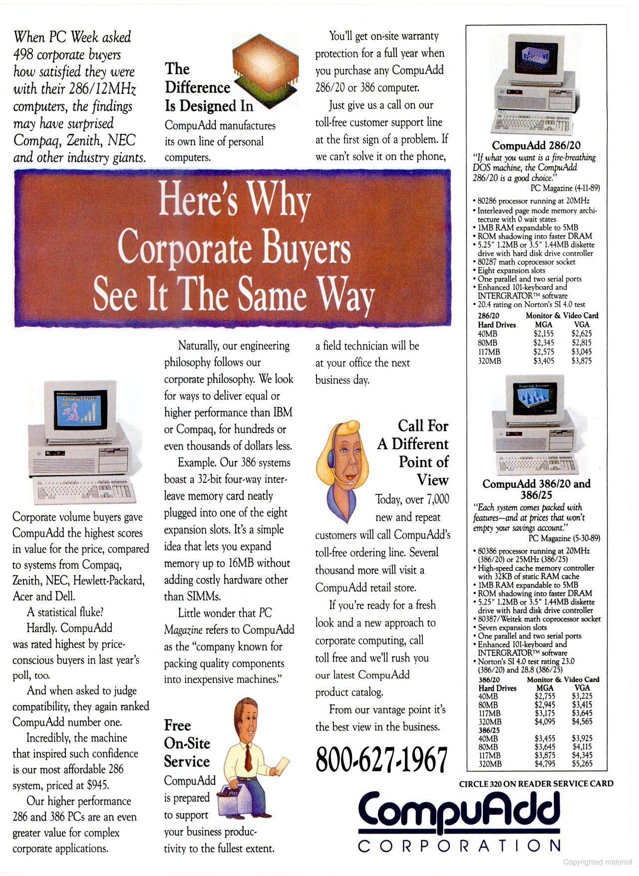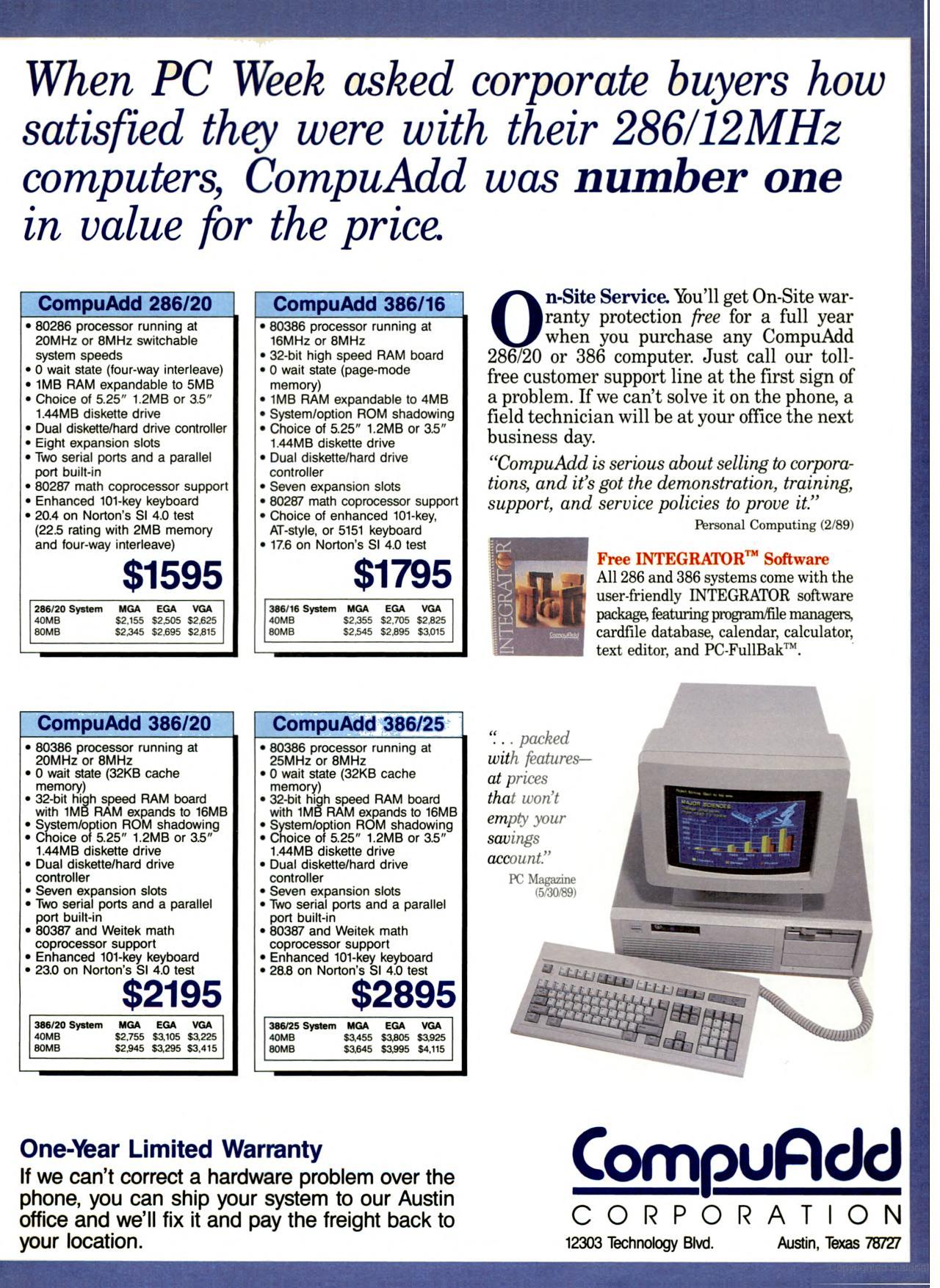 Again, the 286 range only came with 512 KB of RAM despite the fact the lesser NEC V20-based CompuAdd 810 came with 640 KB. The adverts aren't clear, but it's likely all the 386DX-based PCs came with 1 MB of RAM.