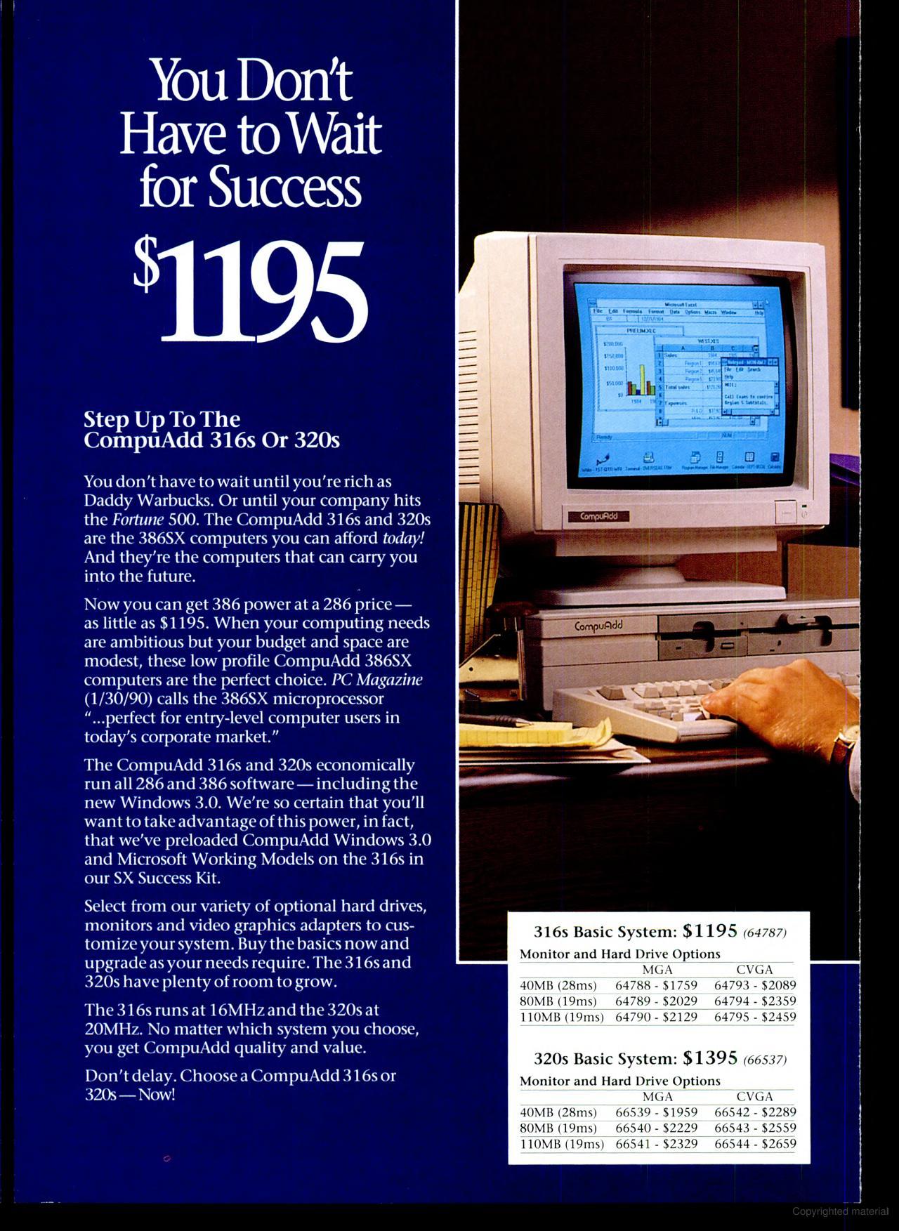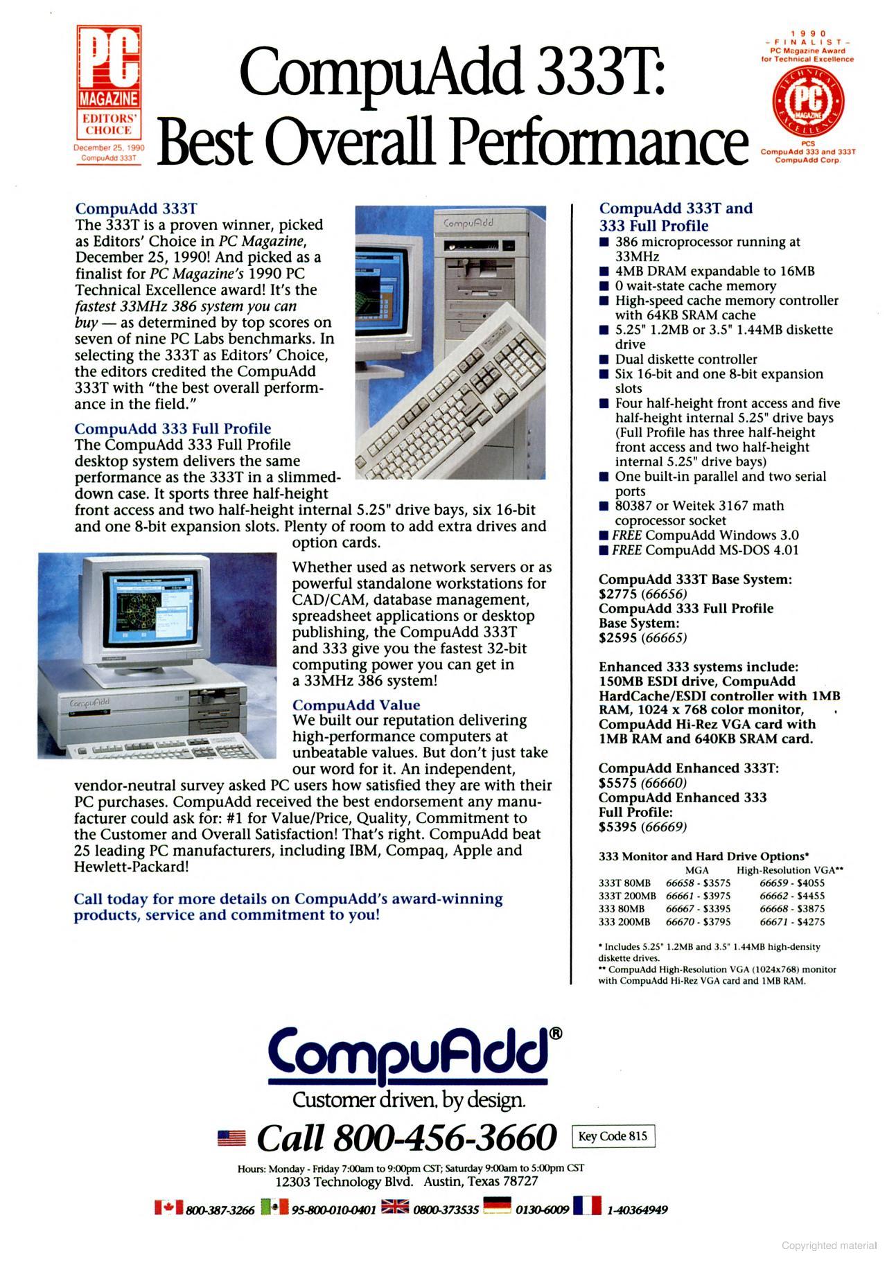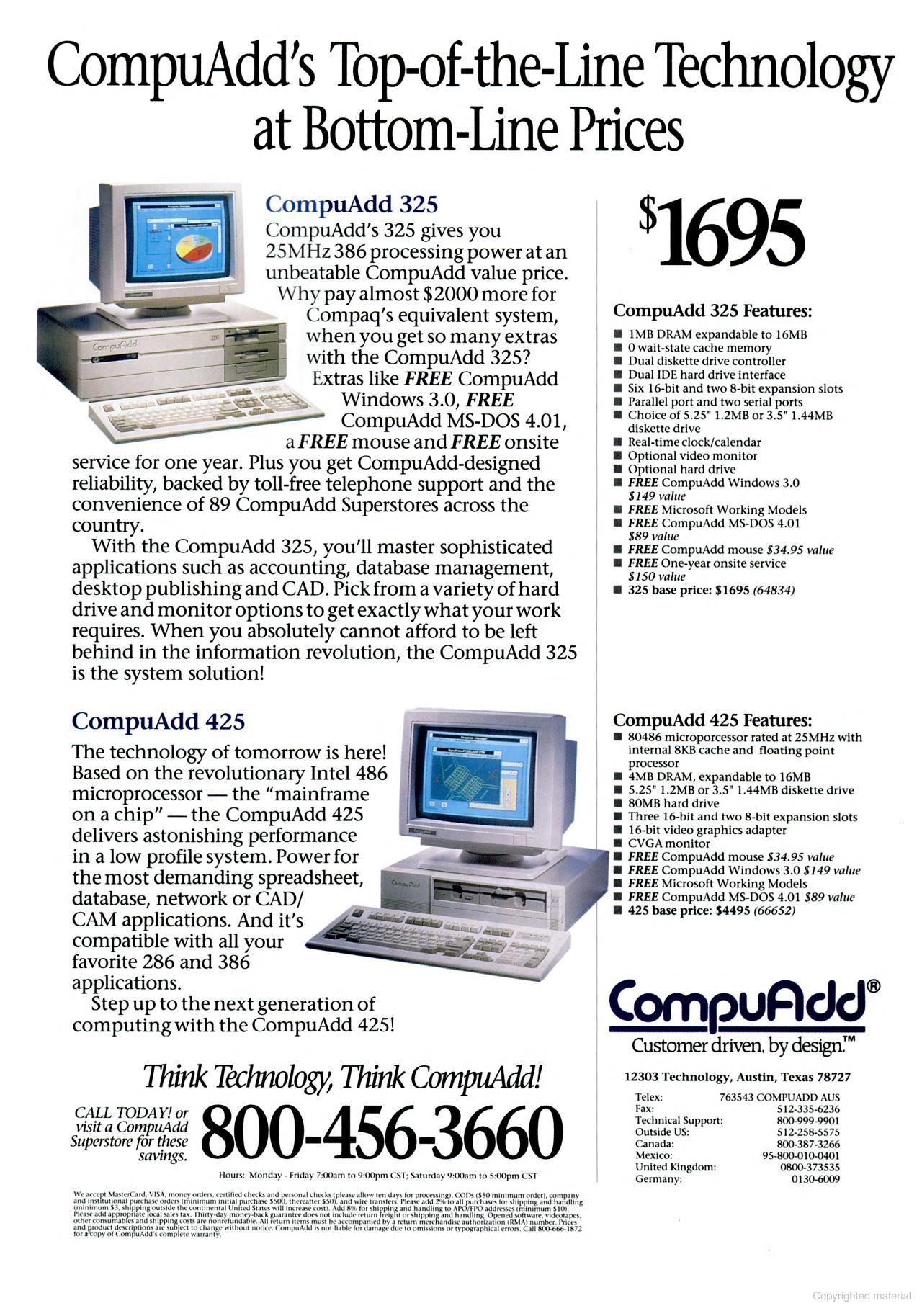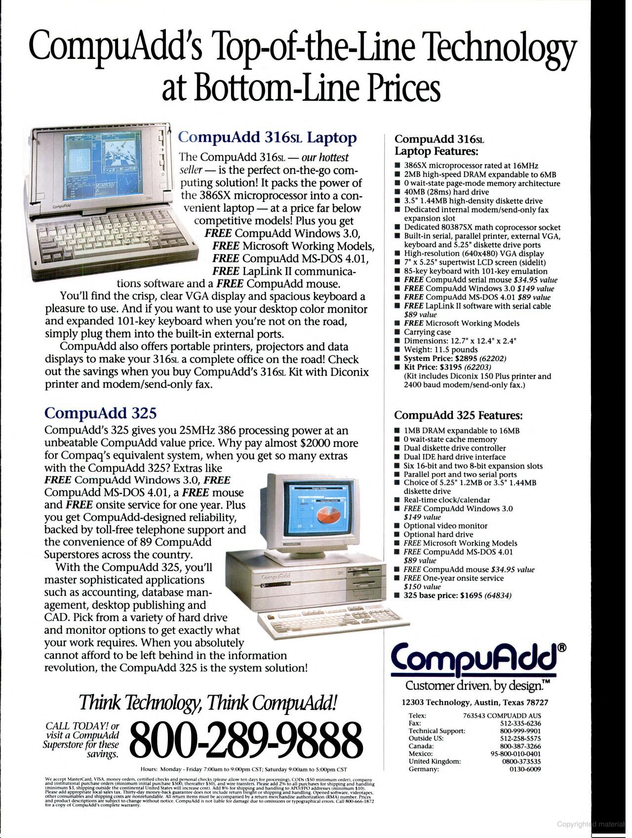 At the end of 1990, we saw the reintroduction of a portable, or rather, a laptop being sold by CompuAdd in the form of the 316SL laptop, bundled with Windows 3.0, MS-DOS 4.01 and more. The 325 was now complemented with the top-of-the-line 425 model (a 486DX-25 desktop), the 333T (386DX-33 in a tower case), and the 333FP "Full Profile" (slimmed down desktop case version of the 333T).