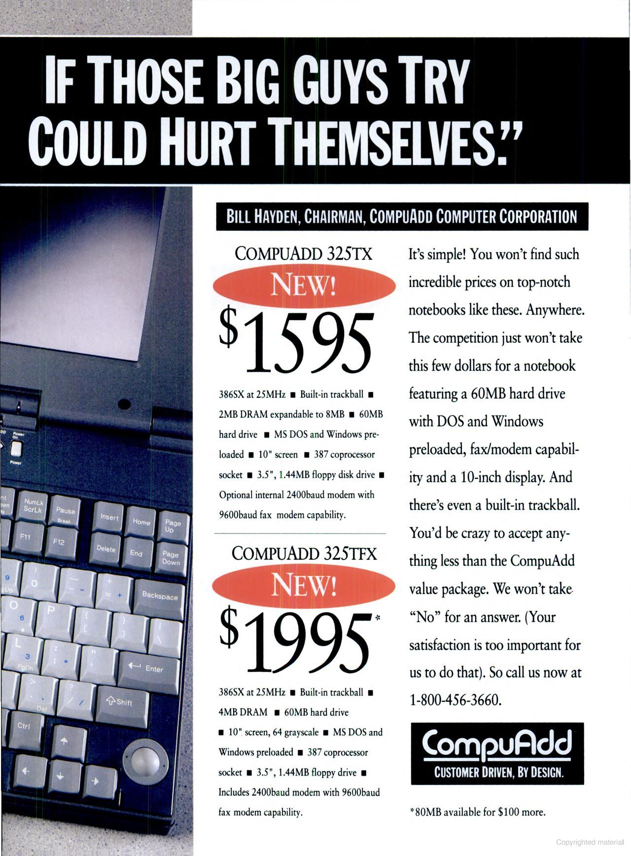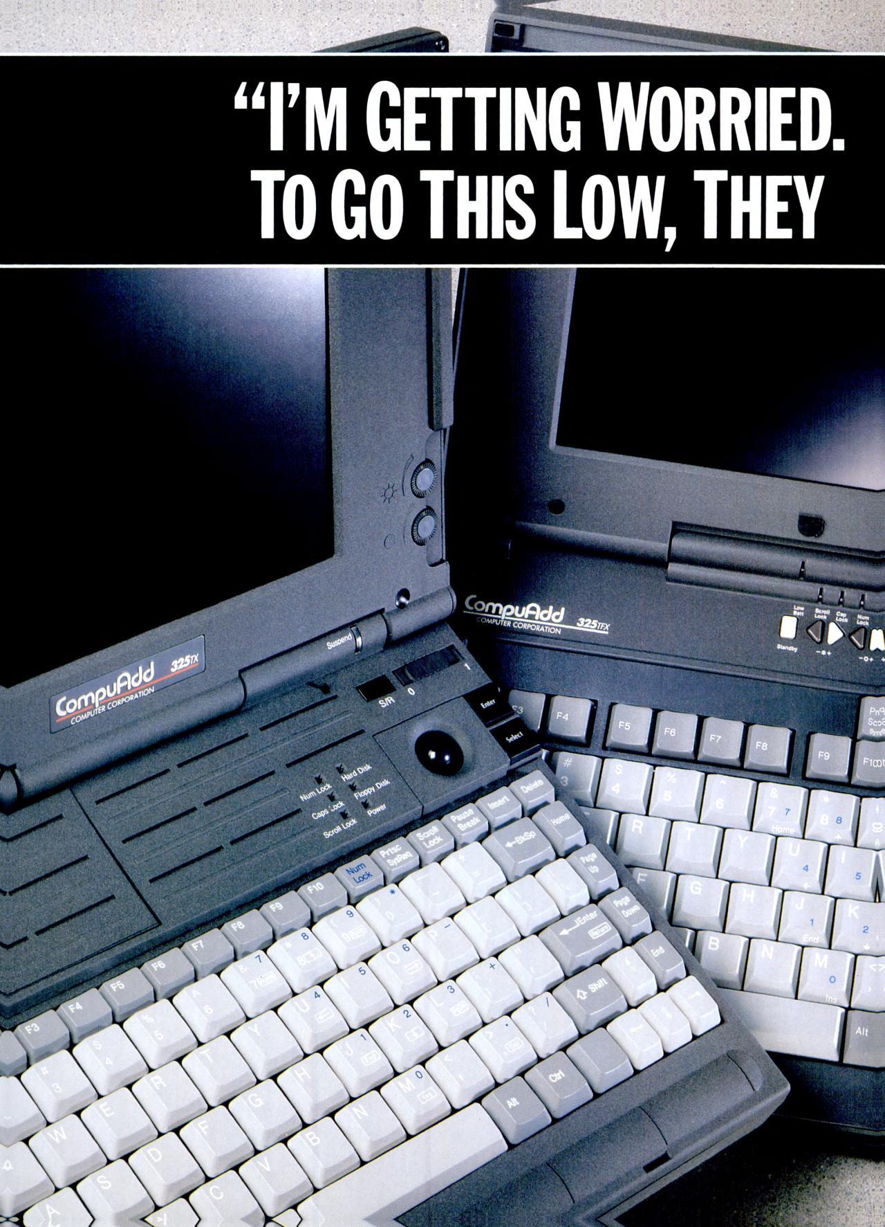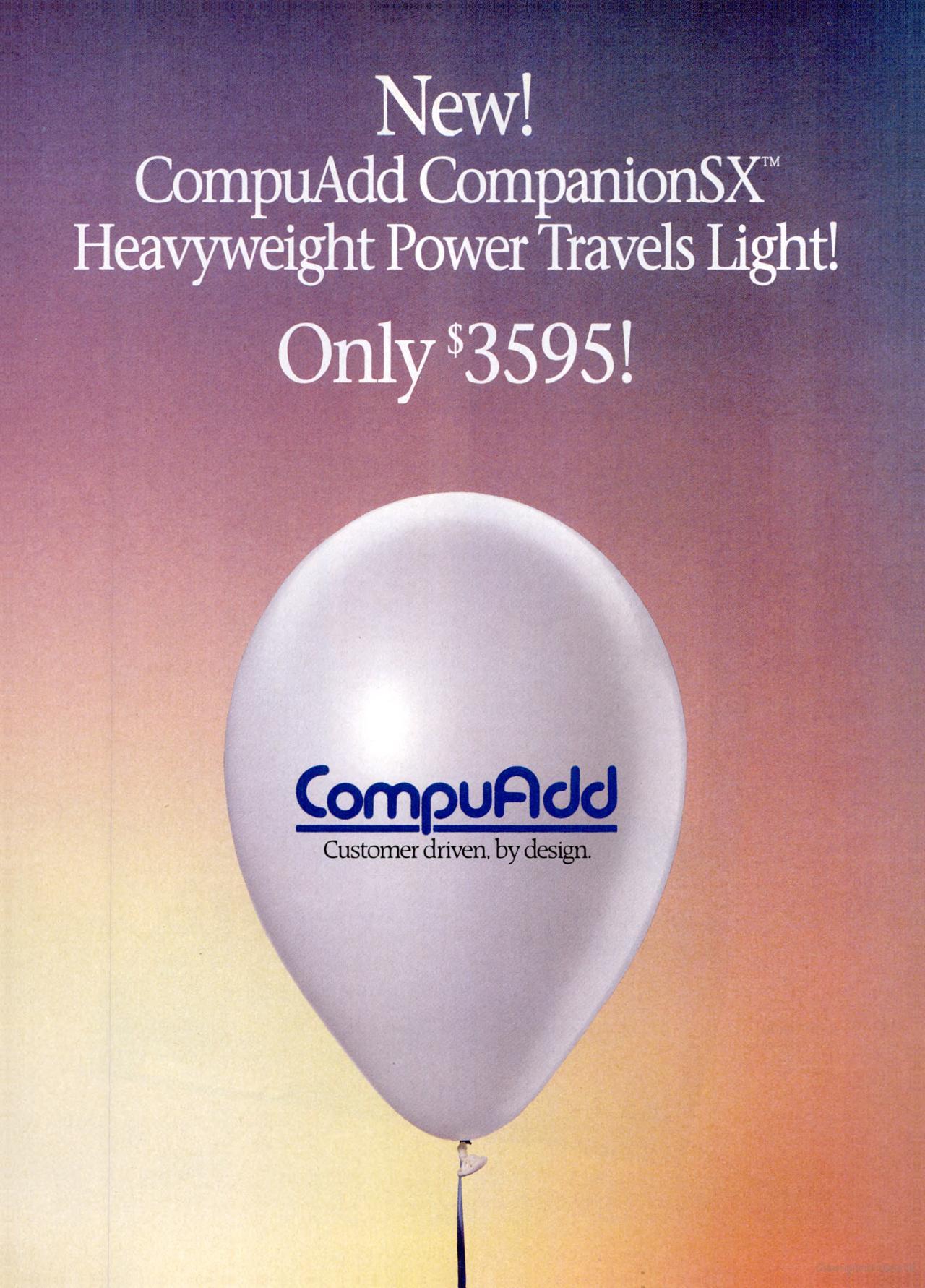 In mid-1992, CompuAdd still sold both desktop and notebook computers, though the latter was the bigger sales push. Their notebook range comprised the 325TX and 325TFX, both of which ran a 386SX-25 CPU. The 325TX came with 2 MB of RAM and a 10" [gas plasma?] screen while the 325TFX came with 4 MB of RAM, a 10" LCD display capable of 64 greyscales, and a built-in 2400 baud modem. Another advert in the same period showed off their new CompuAdd 486DX2/50 with its 4 MB of RAM and 64 KB cache.
