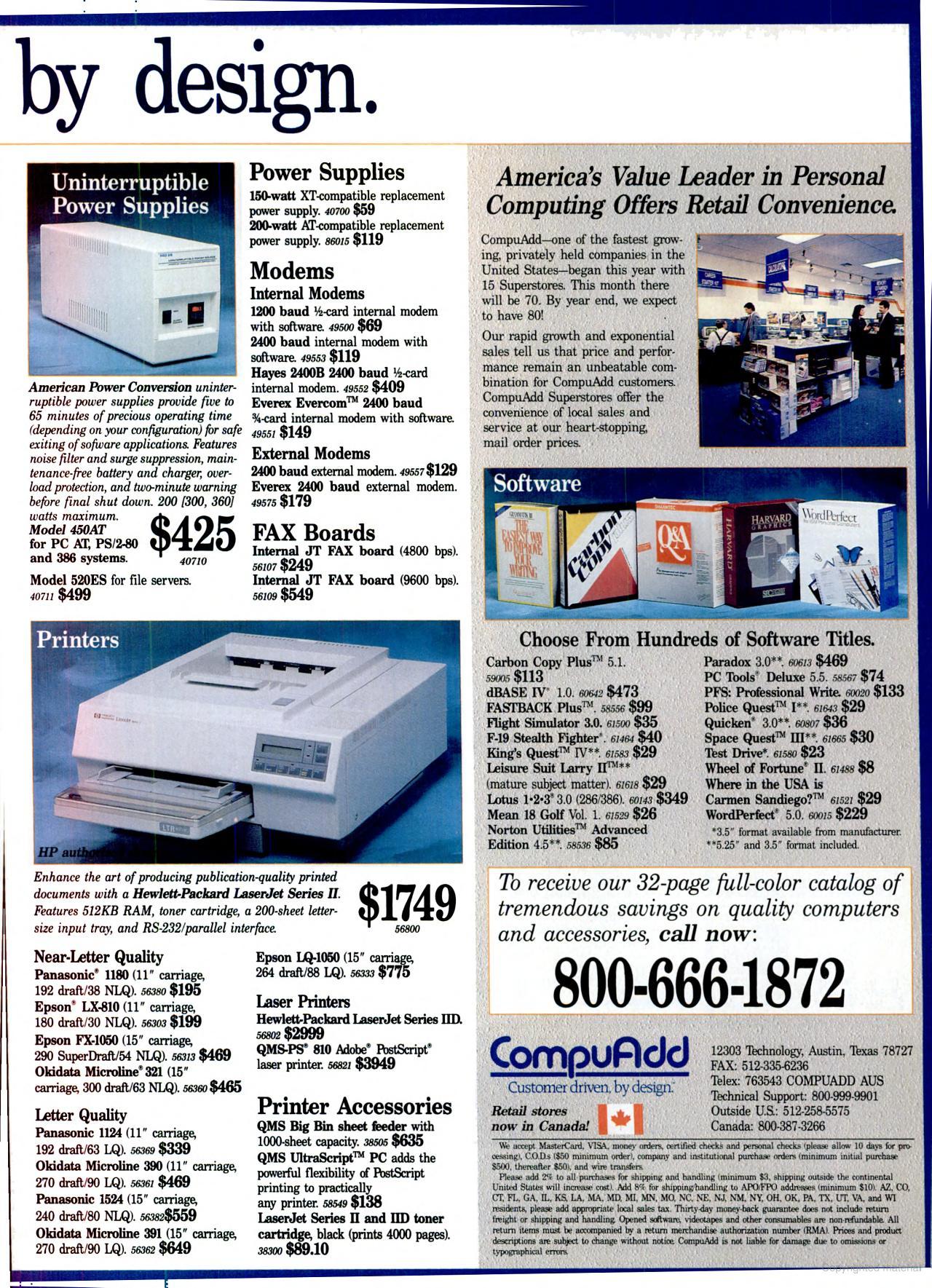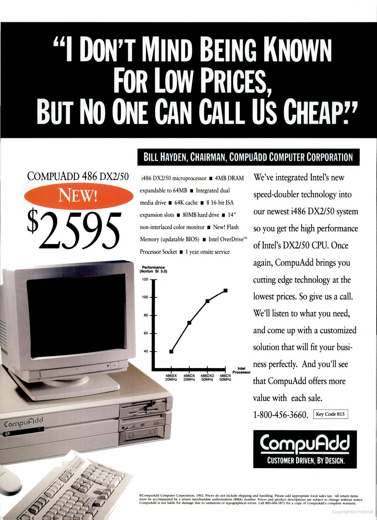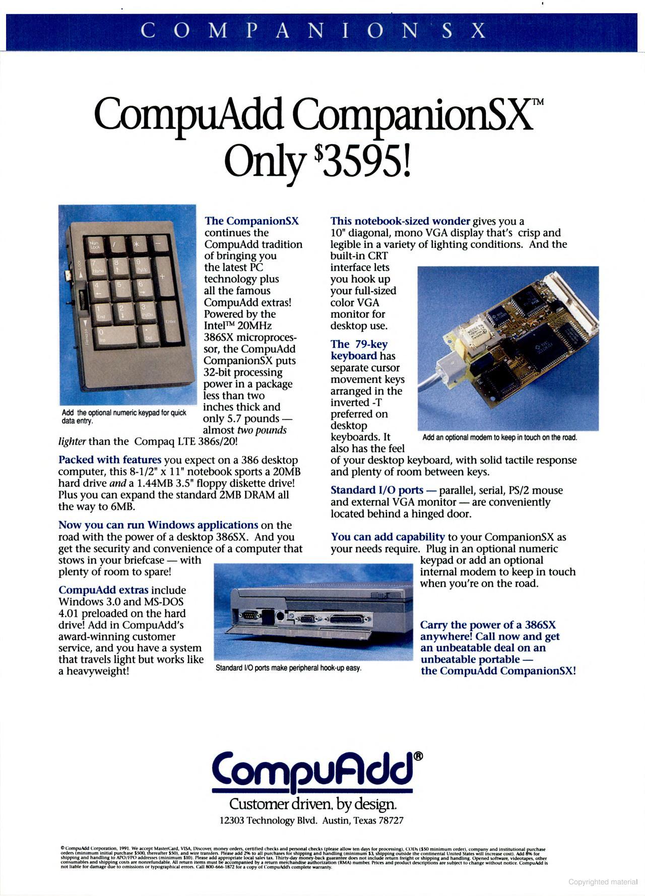 In mid-1992, CompuAdd still sold both desktop and notebook computers, though the latter was the bigger sales push. Their notebook range comprised the 325TX and 325TFX, both of which ran a 386SX-25 CPU. The 325TX came with 2 MB of RAM and a 10" [gas plasma?] screen while the 325TFX came with 4 MB of RAM, a 10" LCD display capable of 64 greyscales, and a built-in 2400 baud modem. Another advert in the same period showed off their new CompuAdd 486DX2/50 with its 4 MB of RAM and 64 KB cache.
