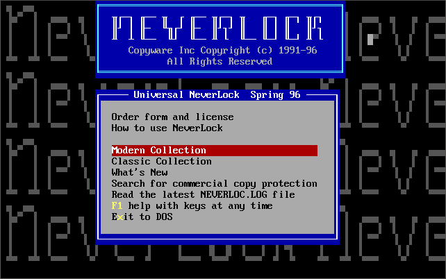 Neverlock came out in Spring 1996, and comprises 264 games title cracks in its 'Classic Collection' menu, and a further 290 games title cracks in its 'Modern Collection' menu, making the total 554!
