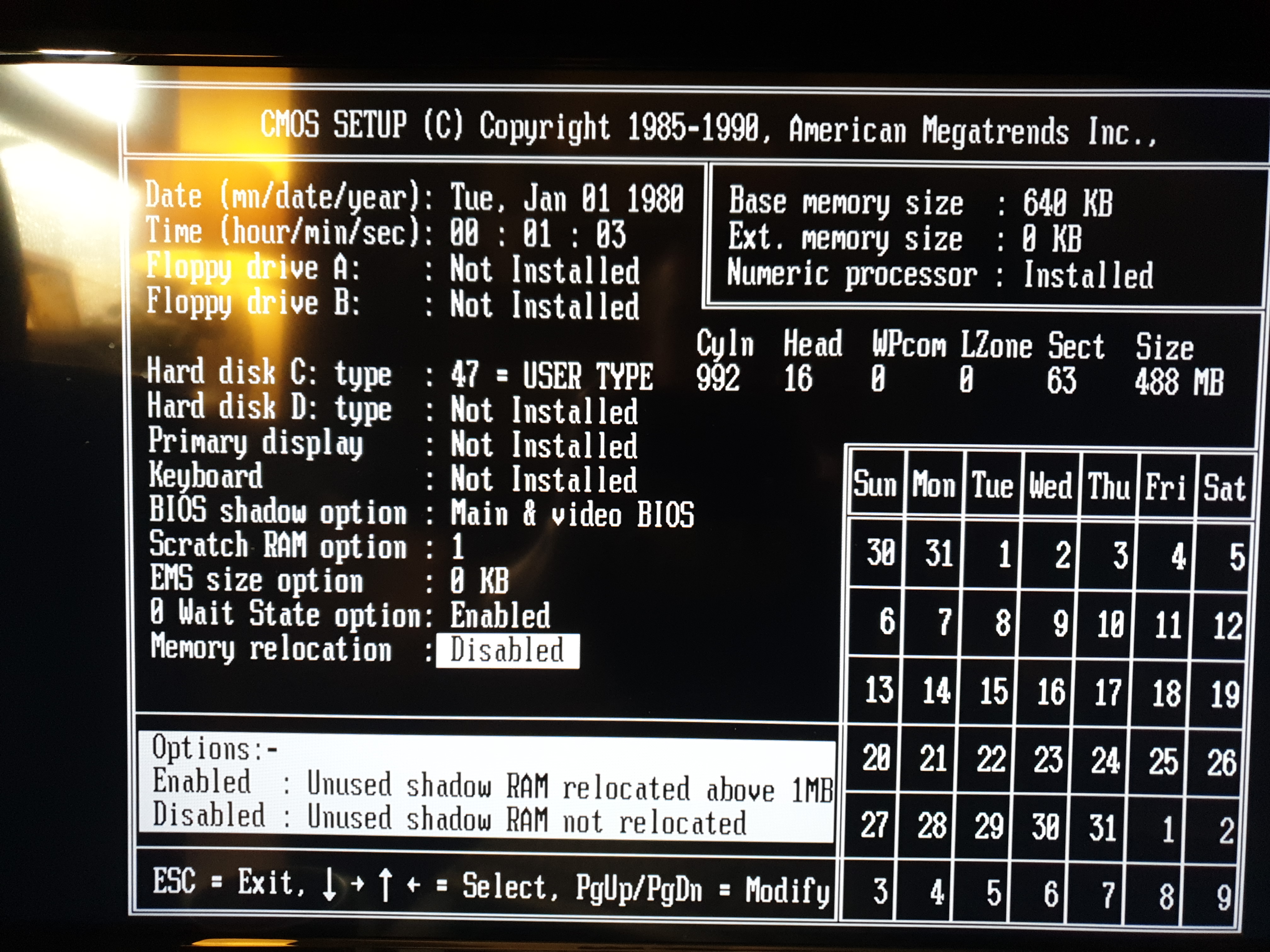 With this in place and a FAT16-formatted CF card, all that was needed was to re-enter the CMOS Setup and input the hard disk geometry values as a 'Type 47' drive, which means "user-defined". I had the CF card set up as a single 500 MB partition, with CHS (Cylinder/Head/Sectors per Track) configuration of 992/16/63.