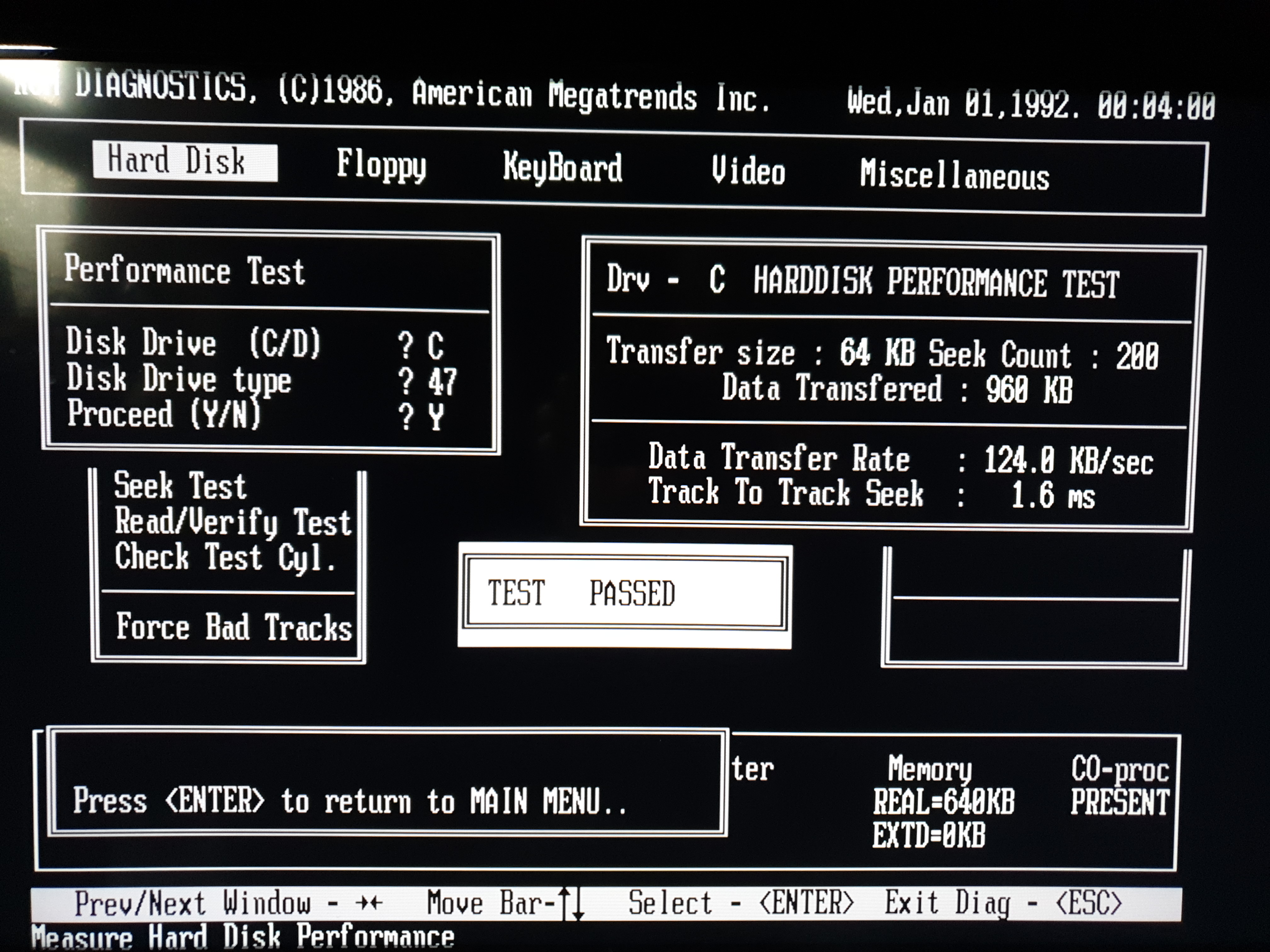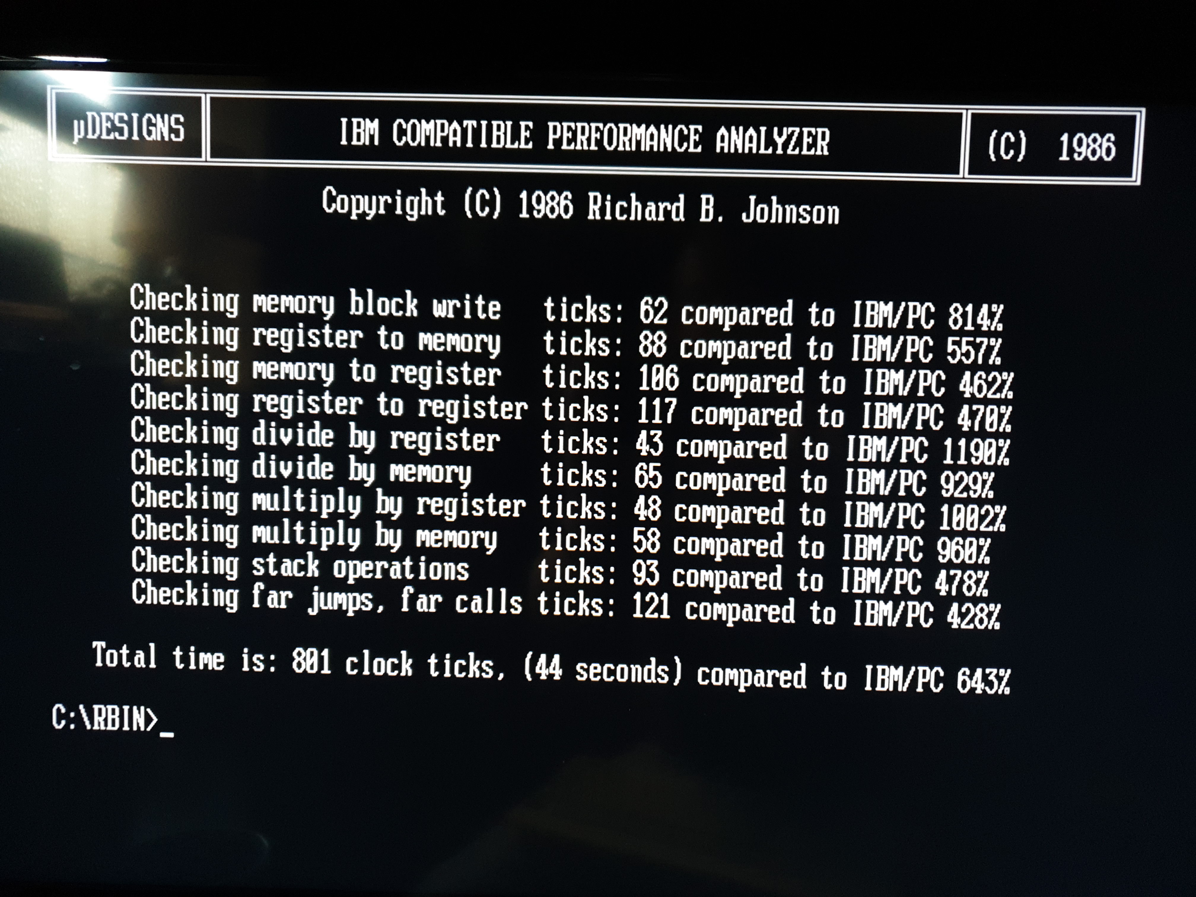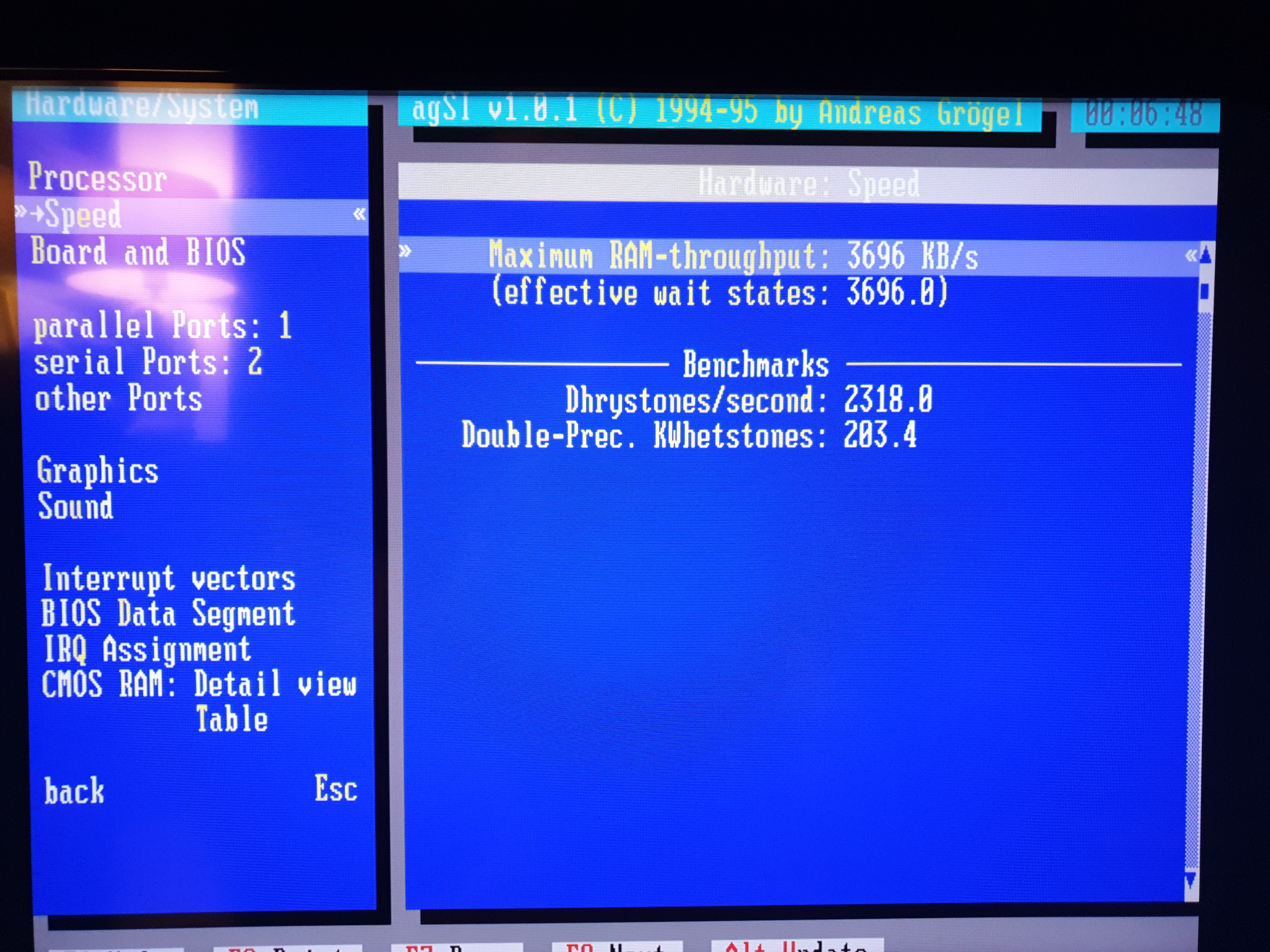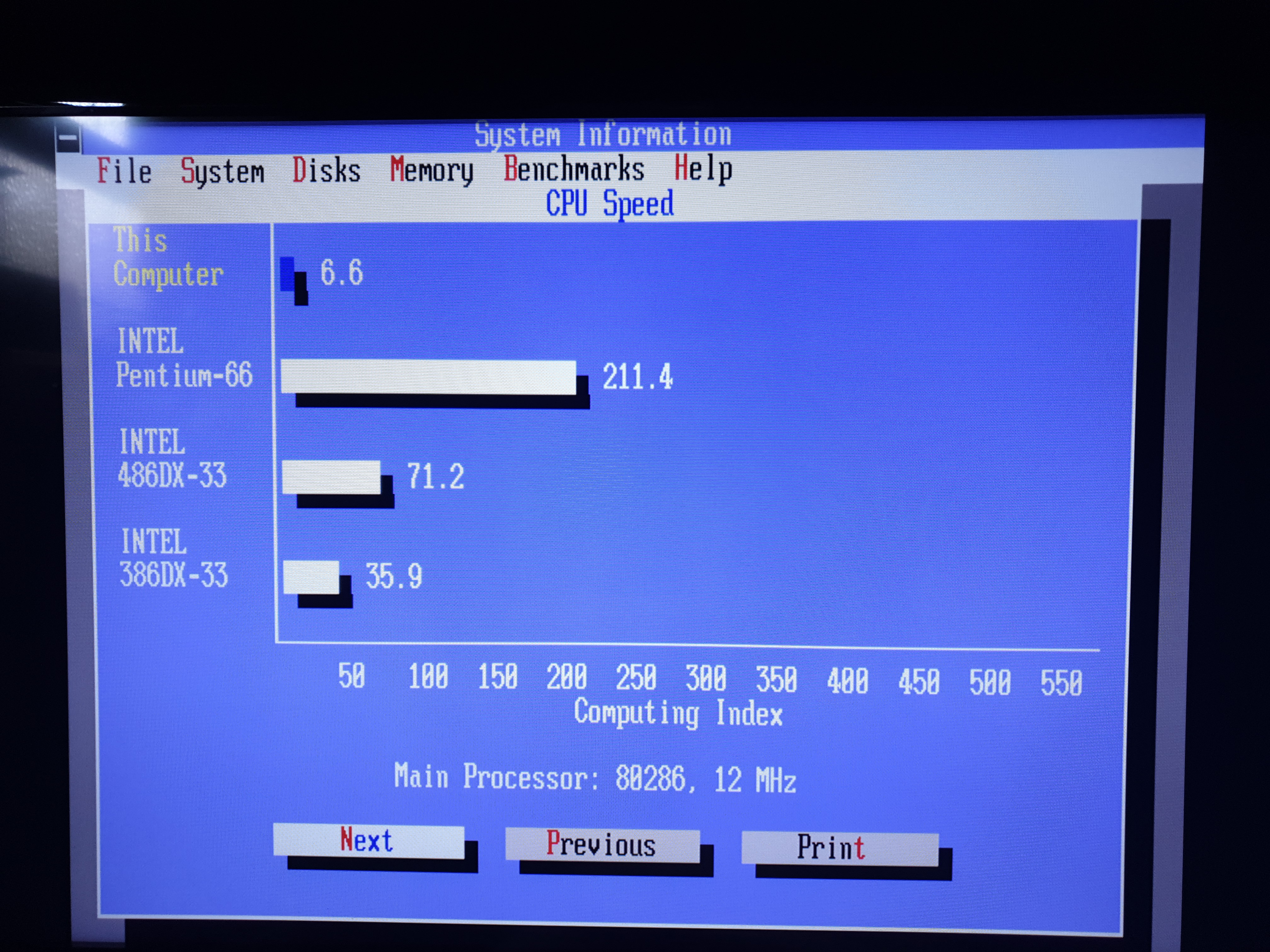 Good stuff, it booted to a C: prompt. By the way, ignore the 0 KB Extended memory size here - I am playing with some BIOS settings, and it seems these old AMI BIOSes show memory information in a weird way compared to more modern PCs. OK, now onto some synthetic benchmarks: