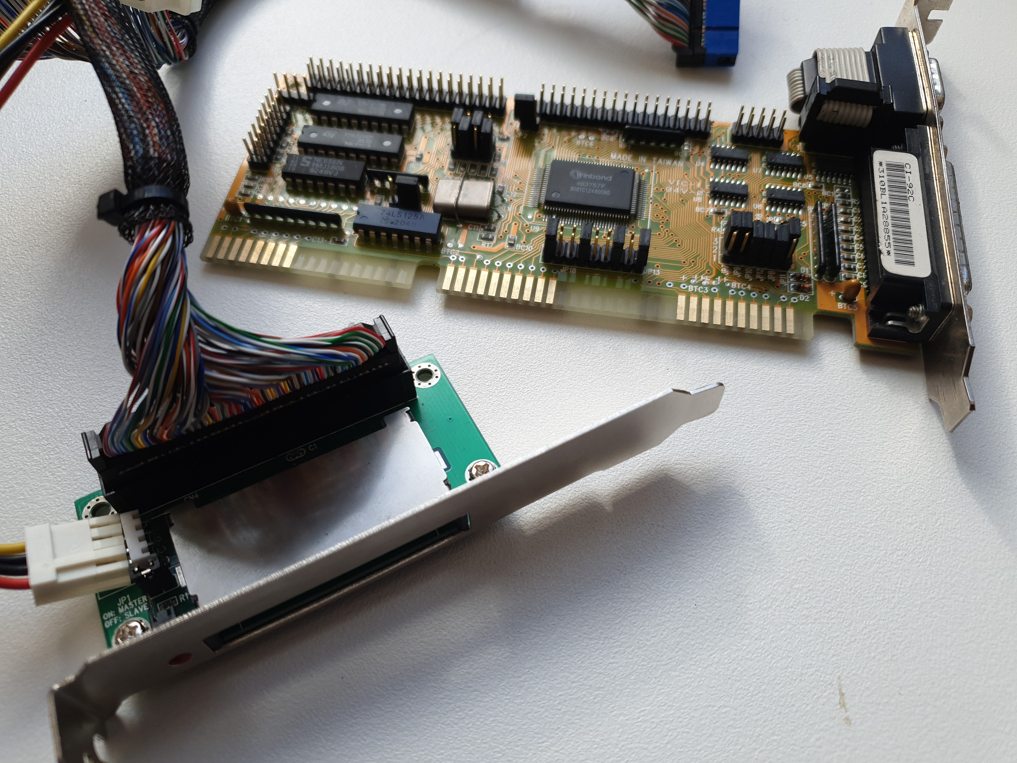 I initially tried the XT-IDE card from my XT restoration review but after installing and starting the 286, the expected Universal IDE boot menu failed to appear. Maybe you know why, but my understanding is that during the POST process there is a search made for other ROM BIOS' in a specific address range, and the Universal IDE one takes over at some point to give you your boot options when it's been detected. Anyway, out with that card and onto something more regular - I grabbed one of my 16-bit ISA "multi I/O" expansion cards and a CF card reader: