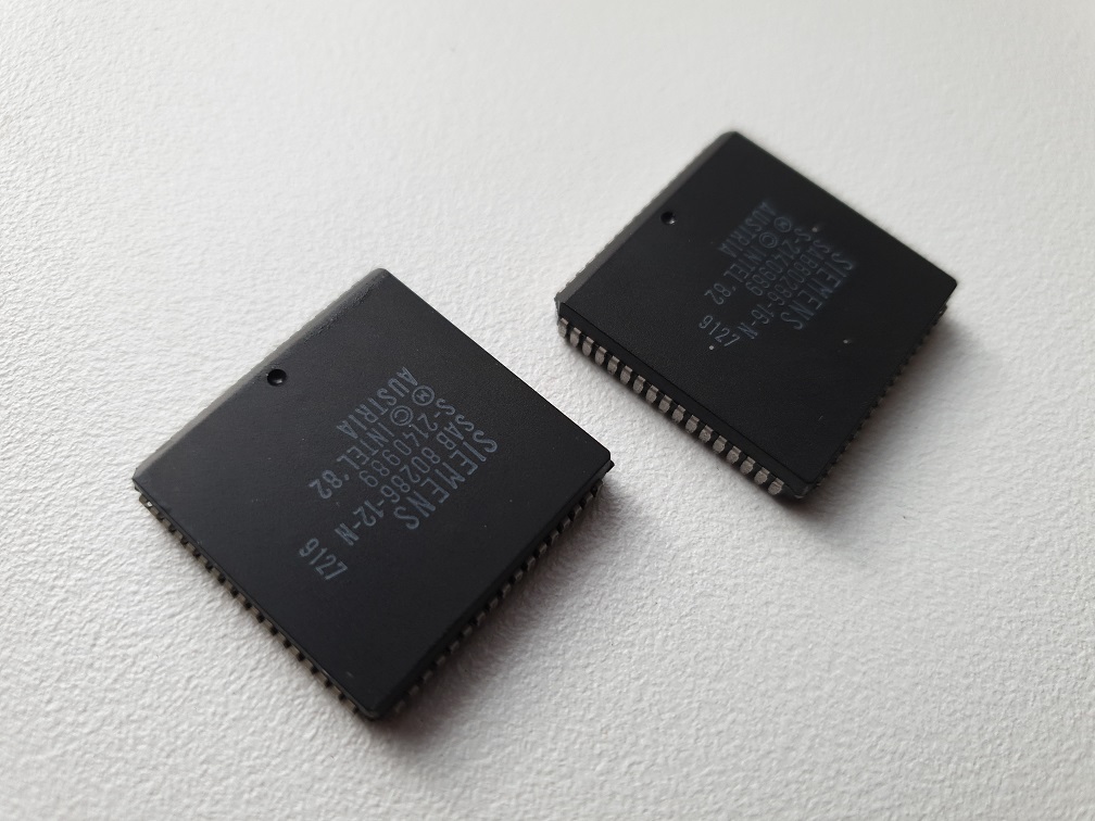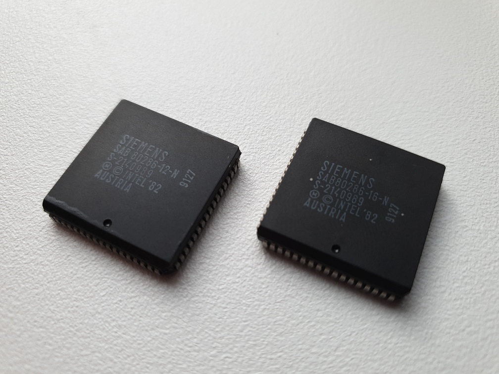 One important note: Do not assume all 286 chips are equal! The etched lettering on 286 chips can be the wrong way up. From what I have seen, Siemens-branded 286 CPUs have a slope along the bottom edge when looking at the logo and text the right way up, as do AMD and Intel. However, Harris-branded ones have the slope along the top edge. The top-left corner of this slope on all 286 CPUs is Pin #1, so be sure to align this to Pin #1 of the socket.