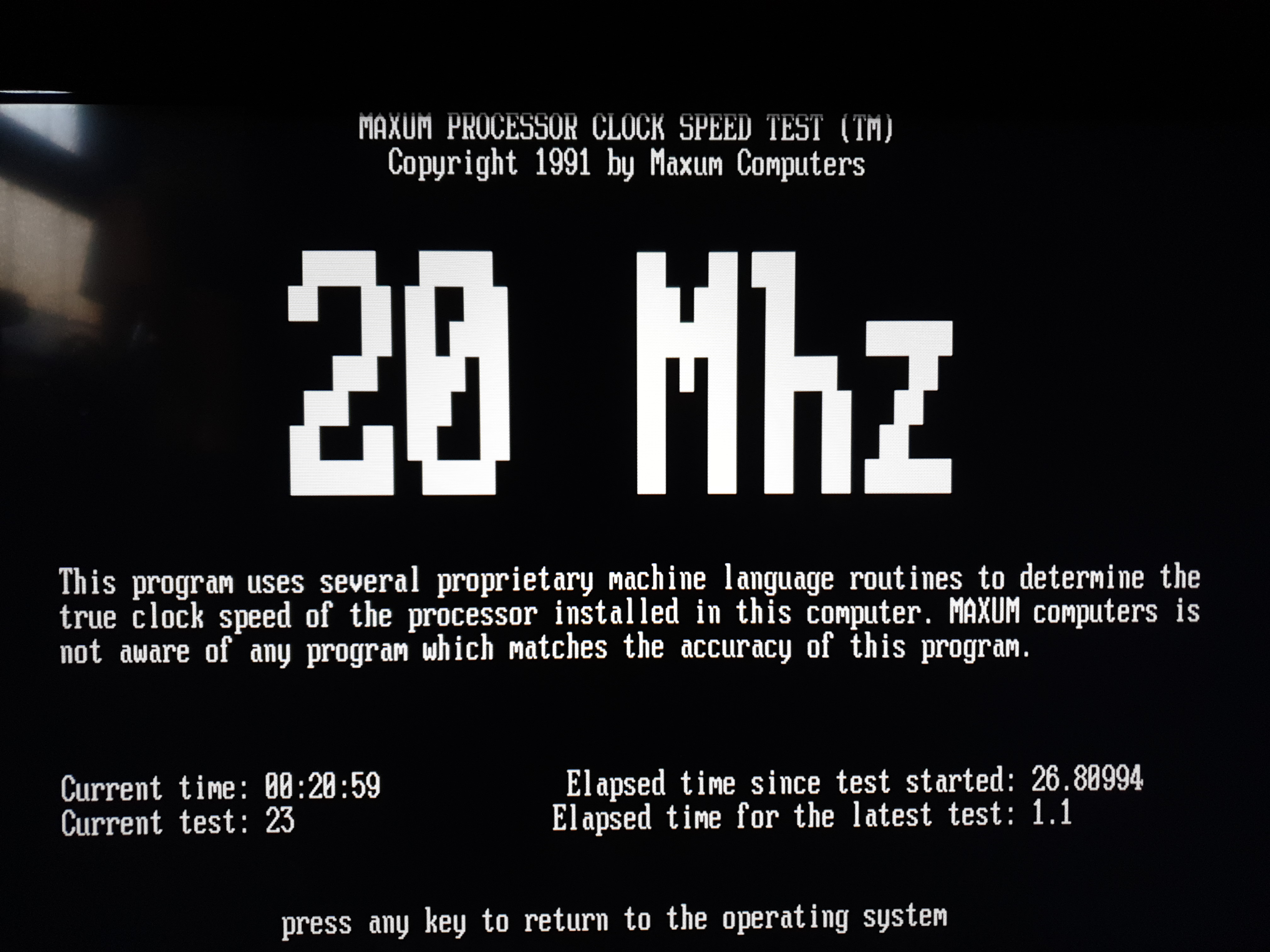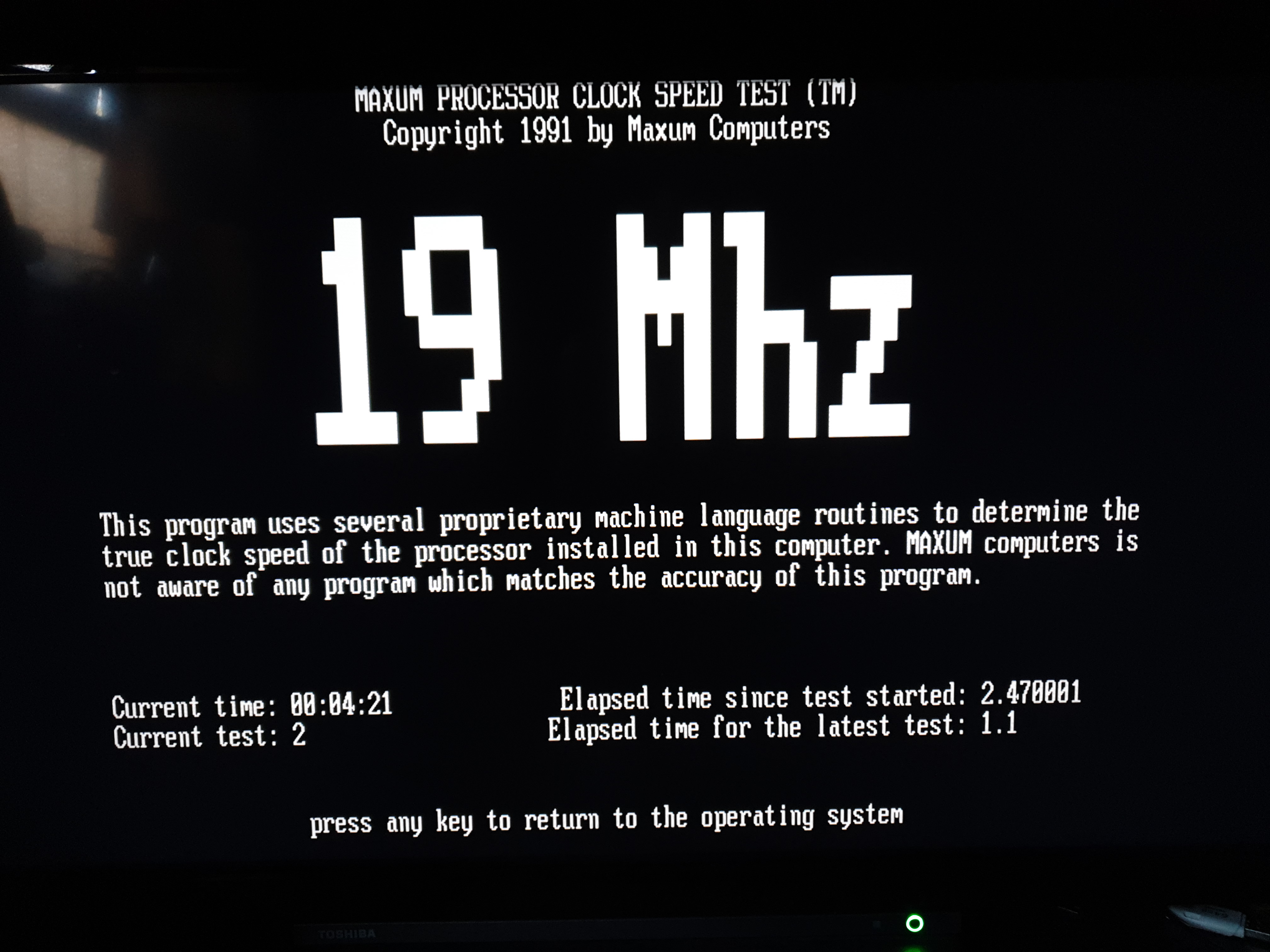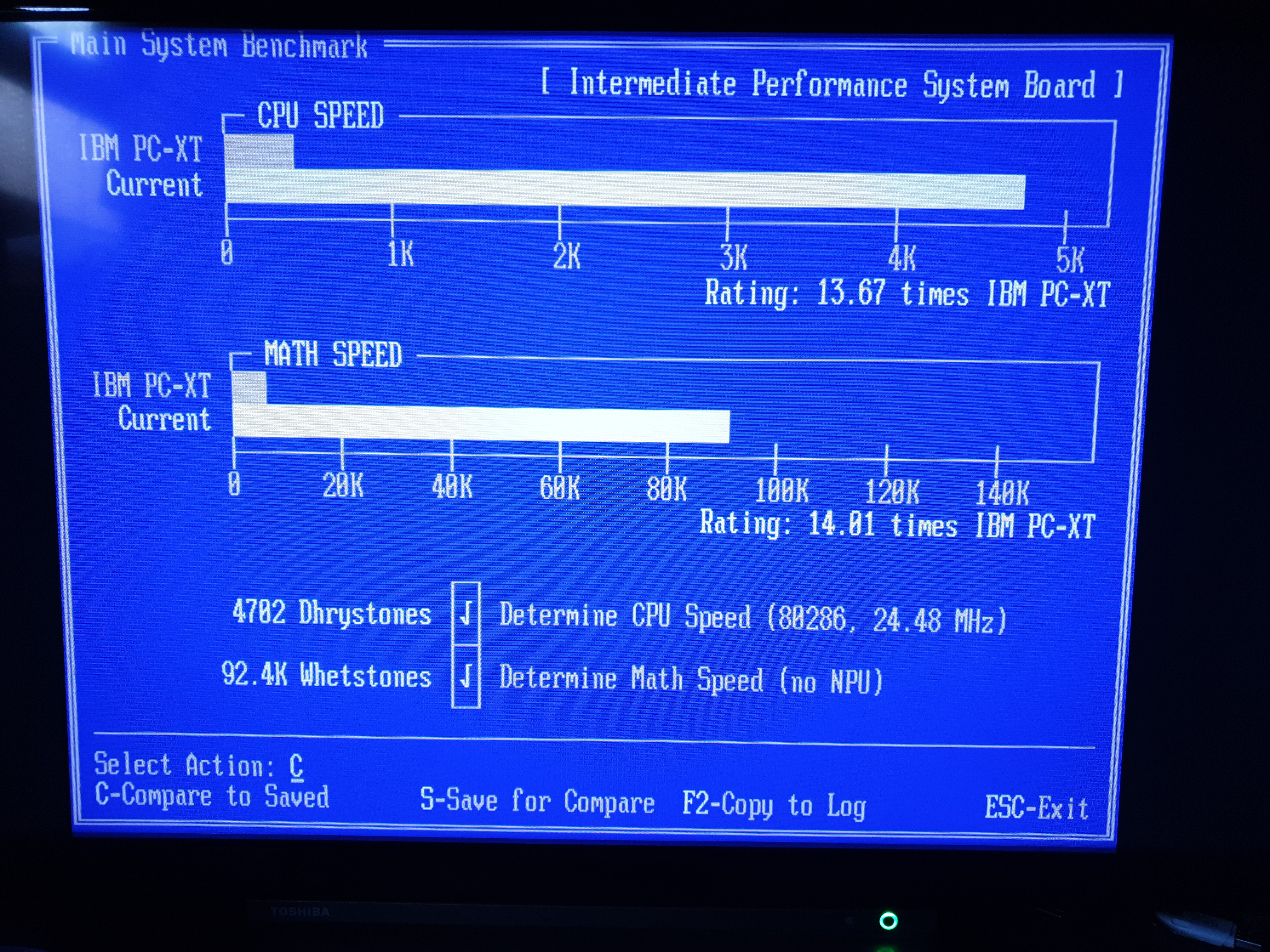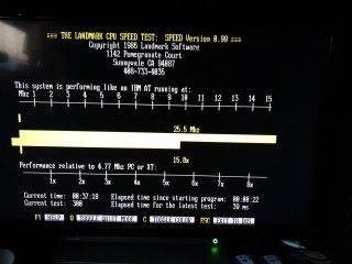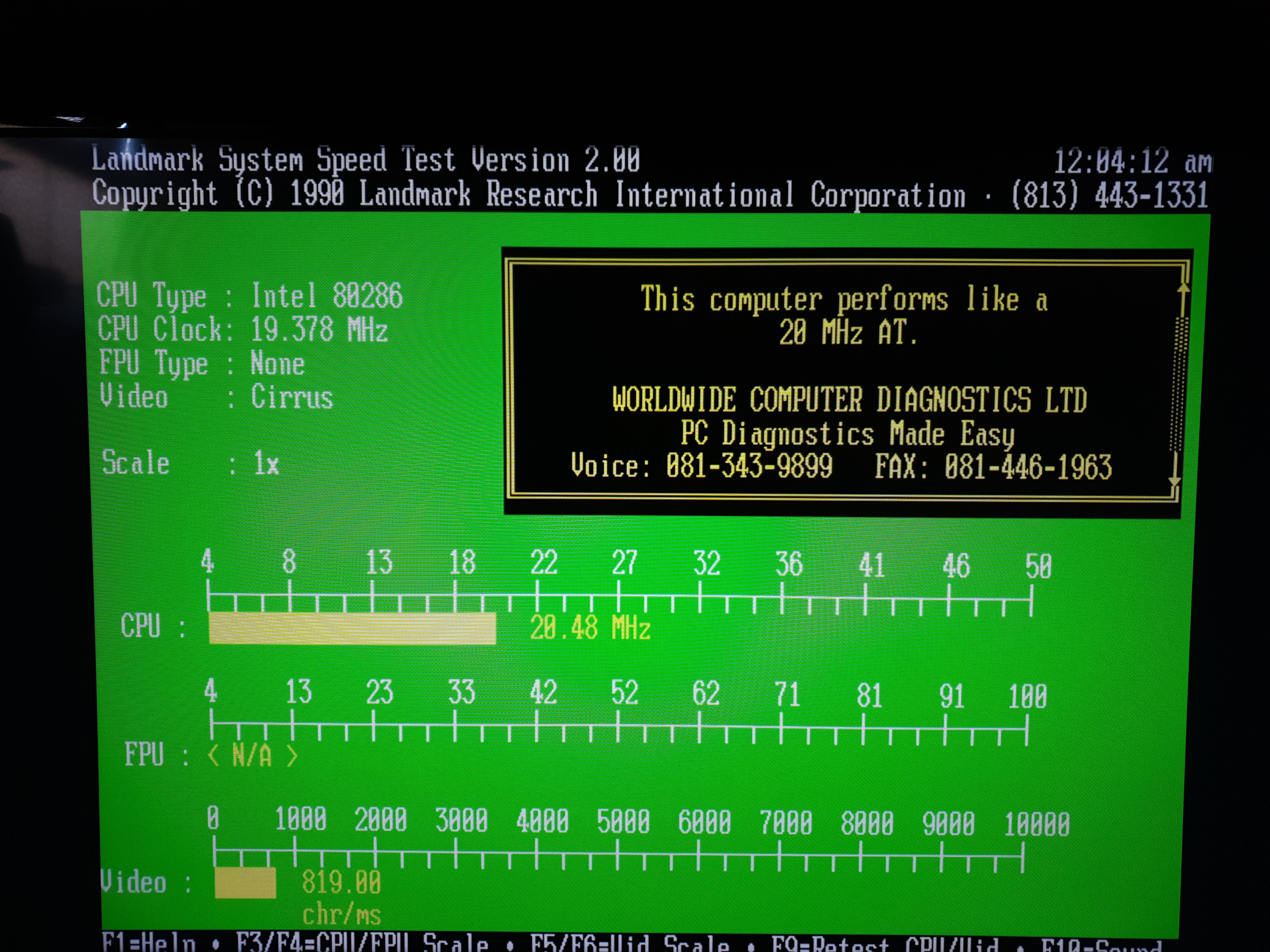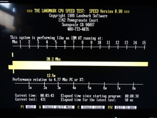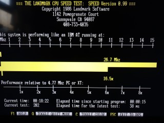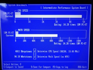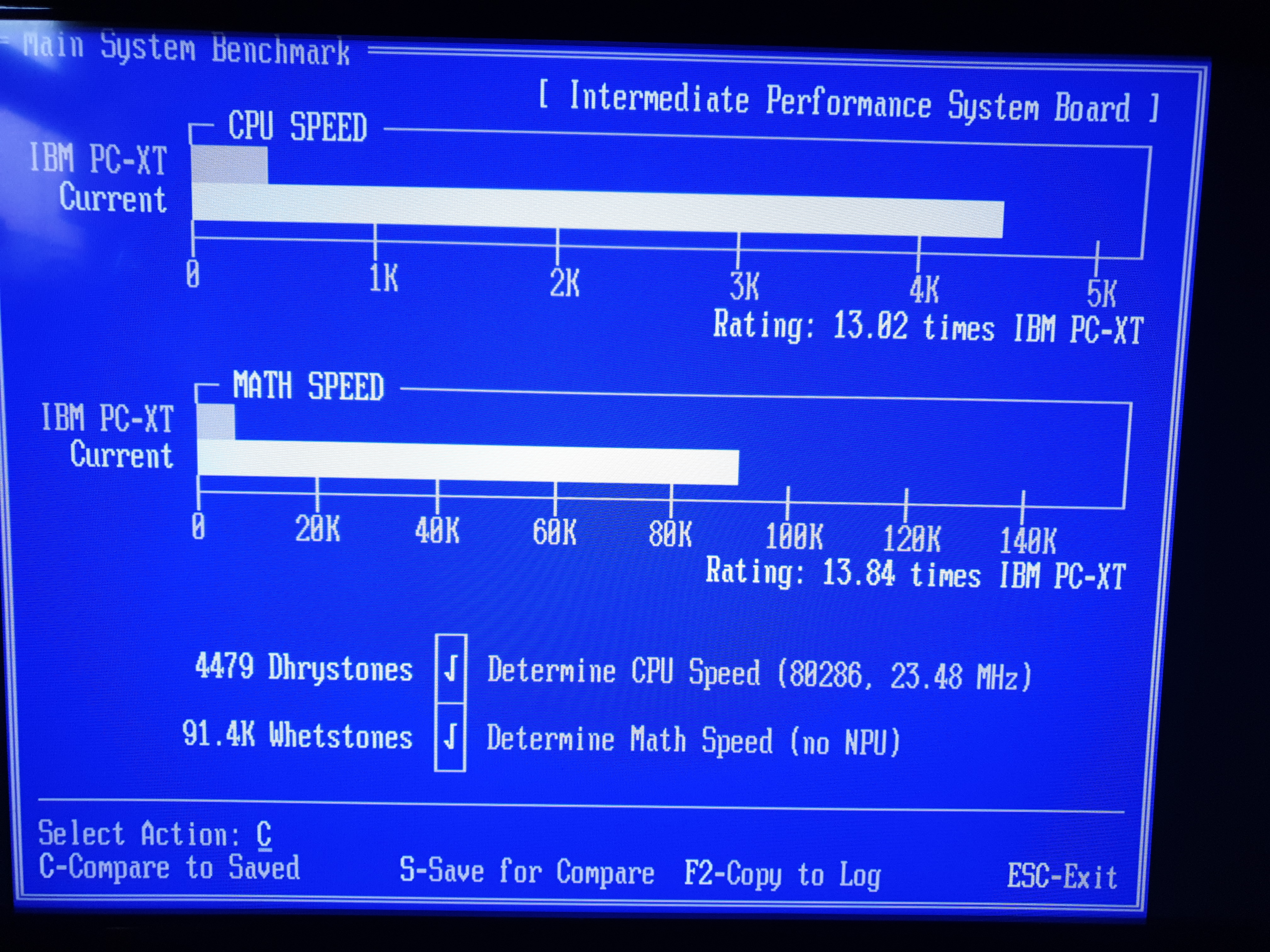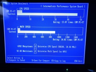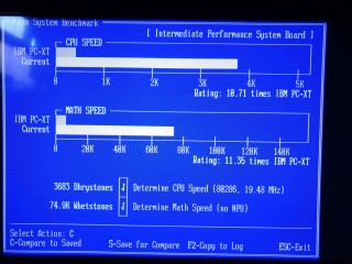 Now to swap out the 32 Mhz crystal for the 40 MHz one (so the CPU will be run at 20 MHz), and revert the BIOS settings back to their default of 1 wait state, these were the results: