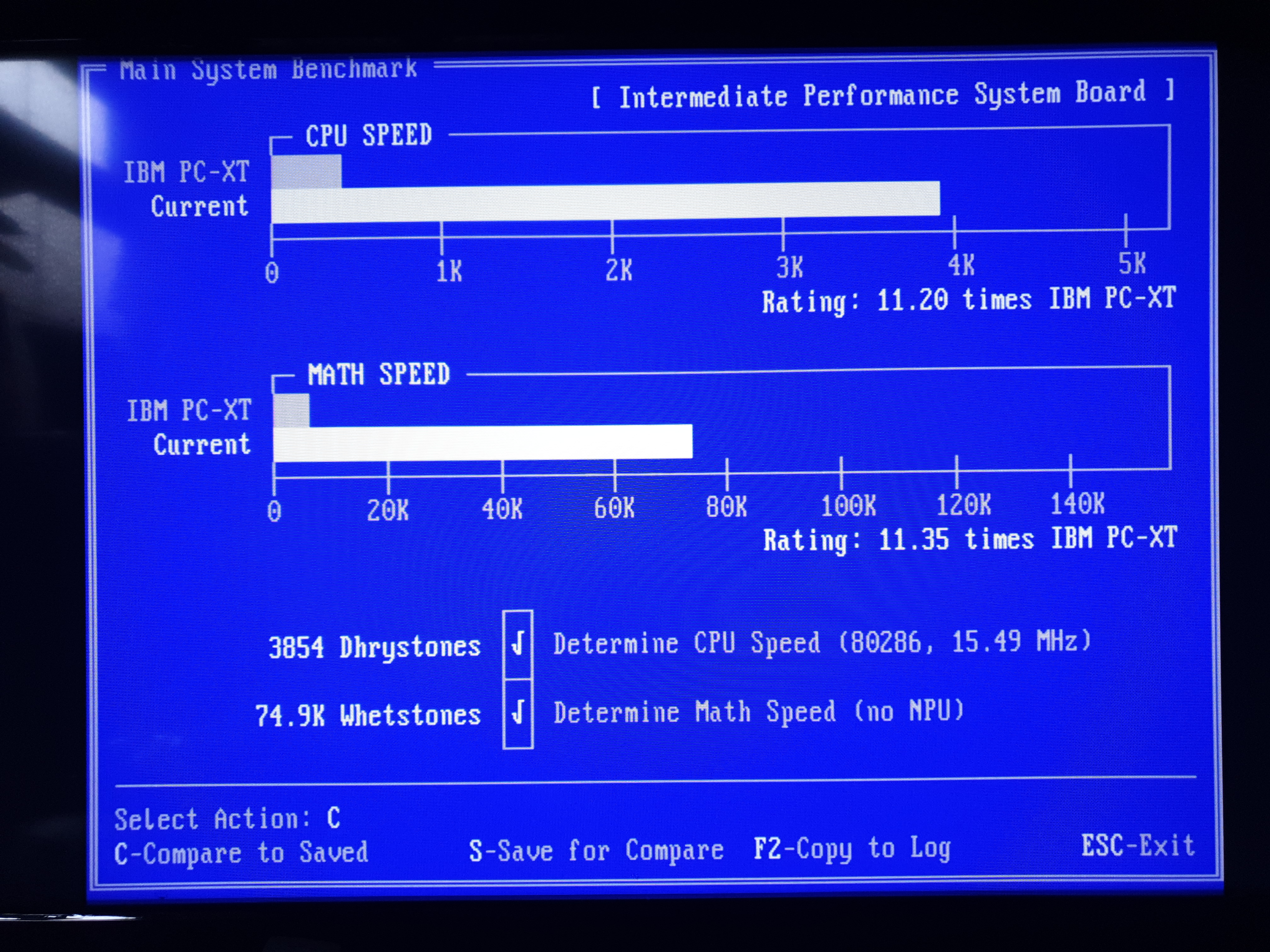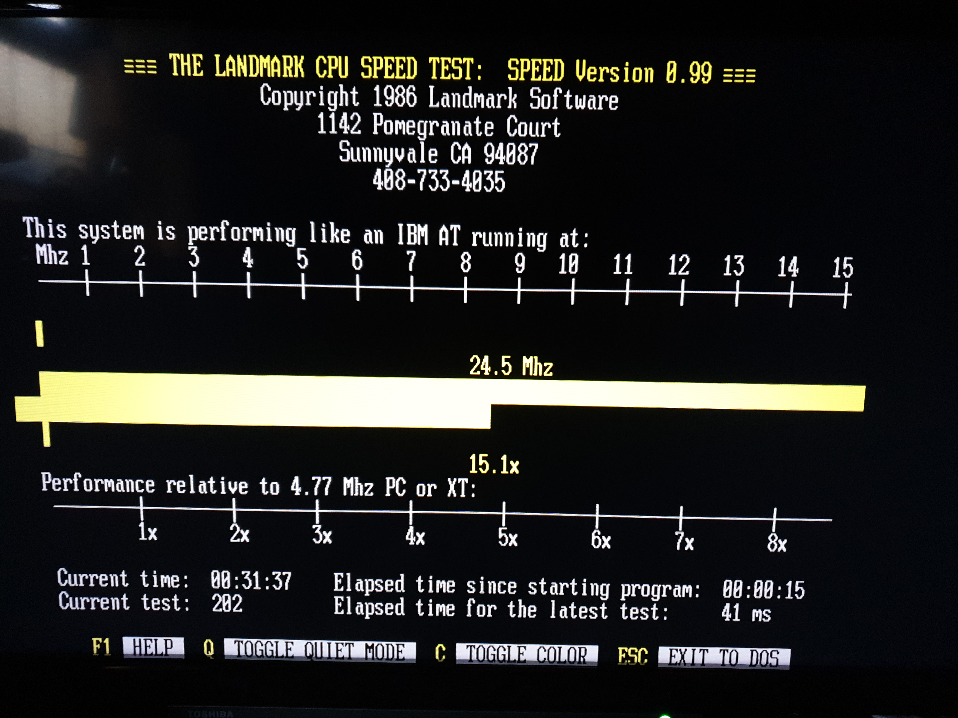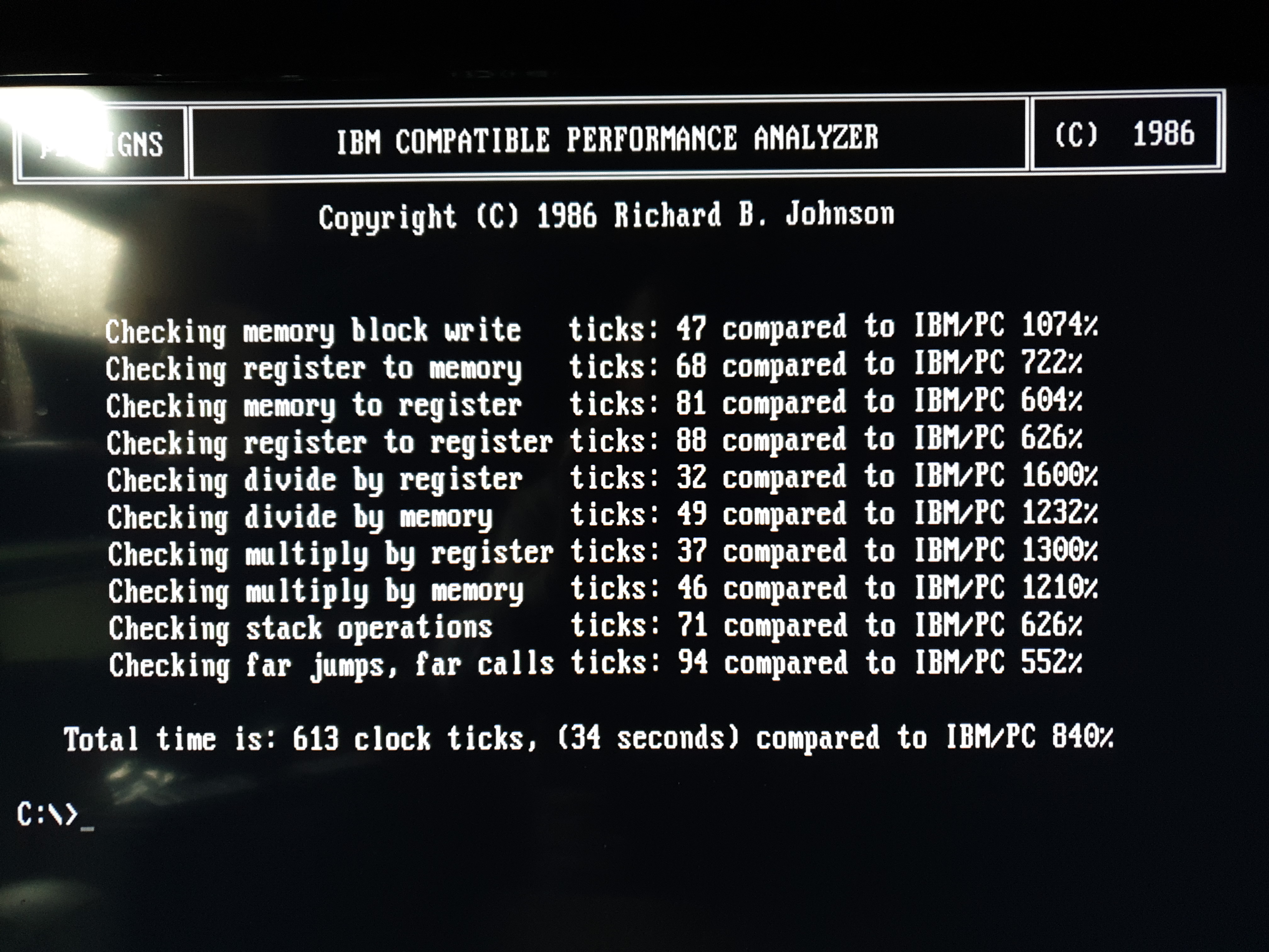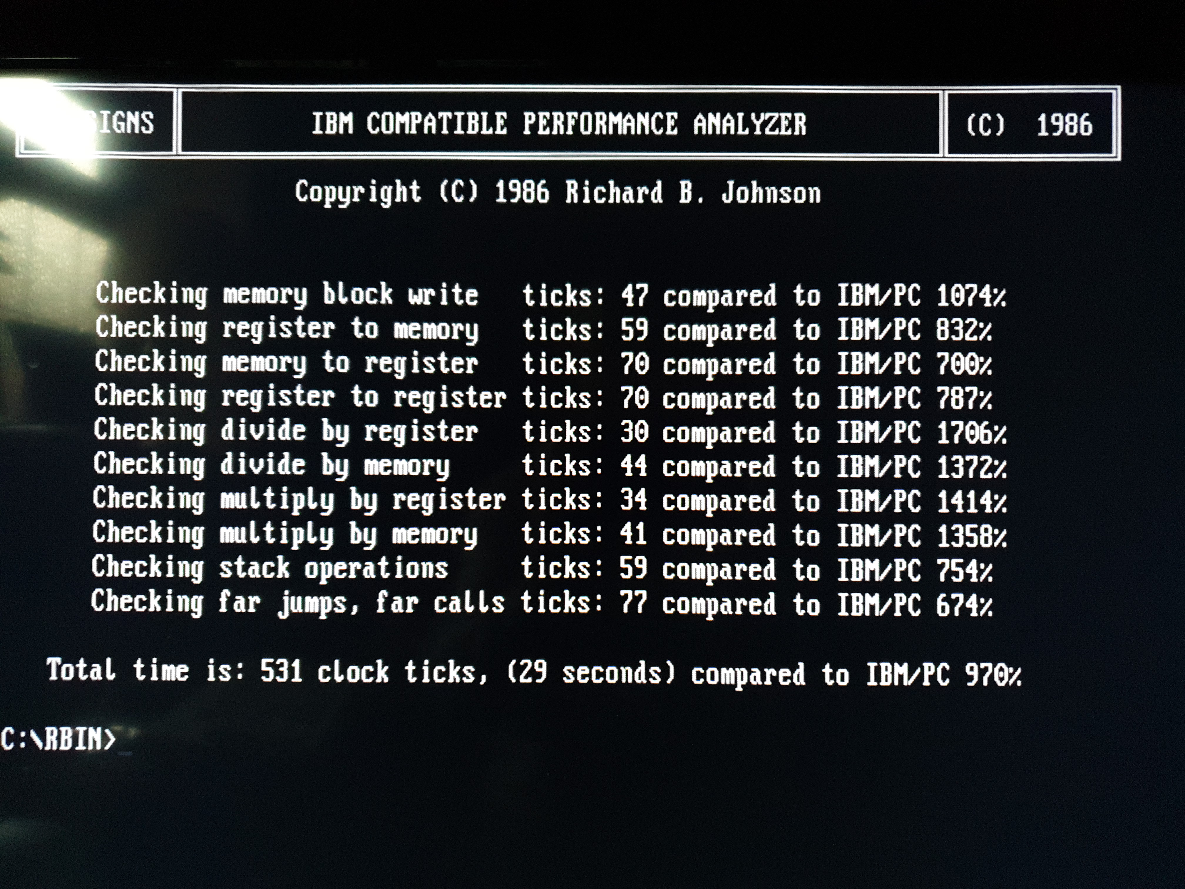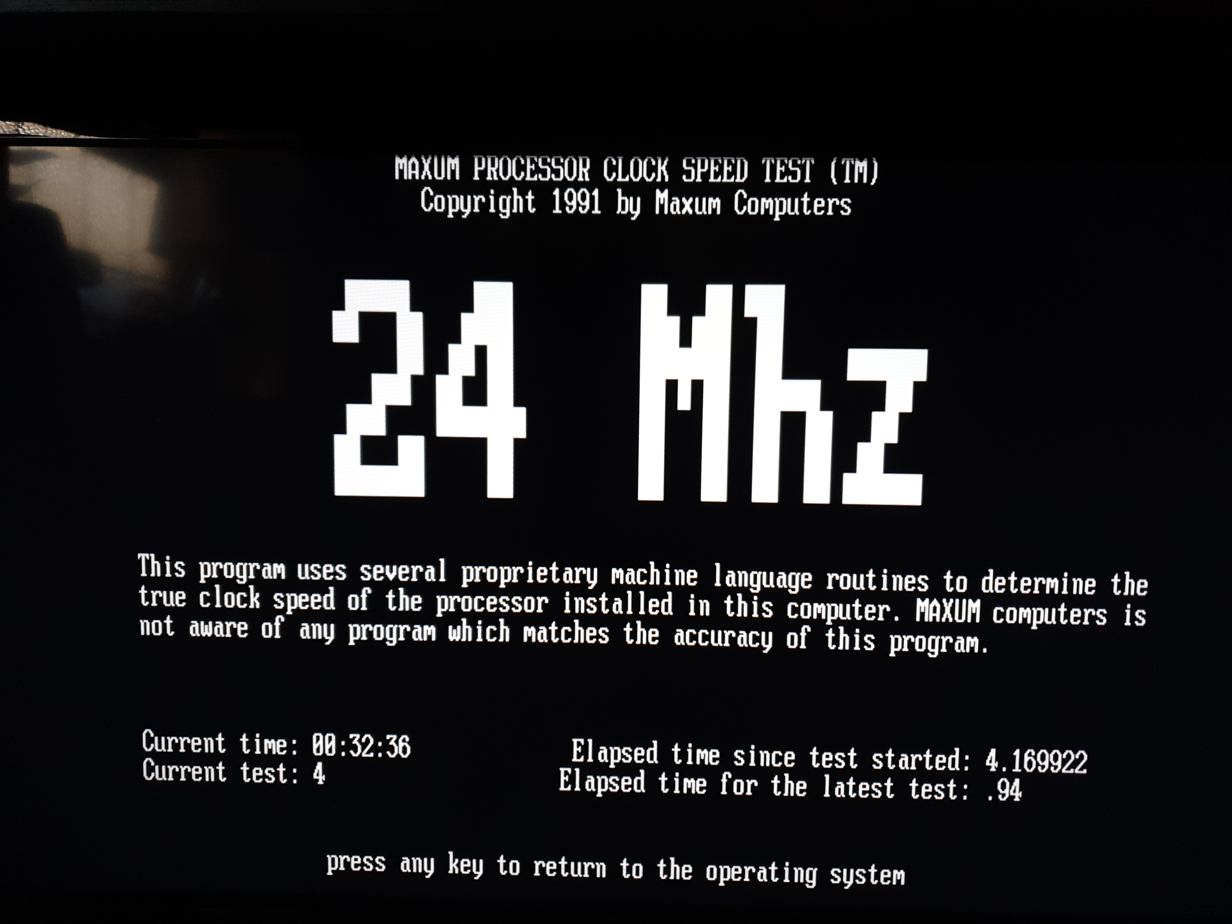Now to swap out the 32 Mhz crystal for the 40 MHz one (so the CPU will be run at 20 MHz), and revert the BIOS settings back to their default of 1 wait state, these were the results: