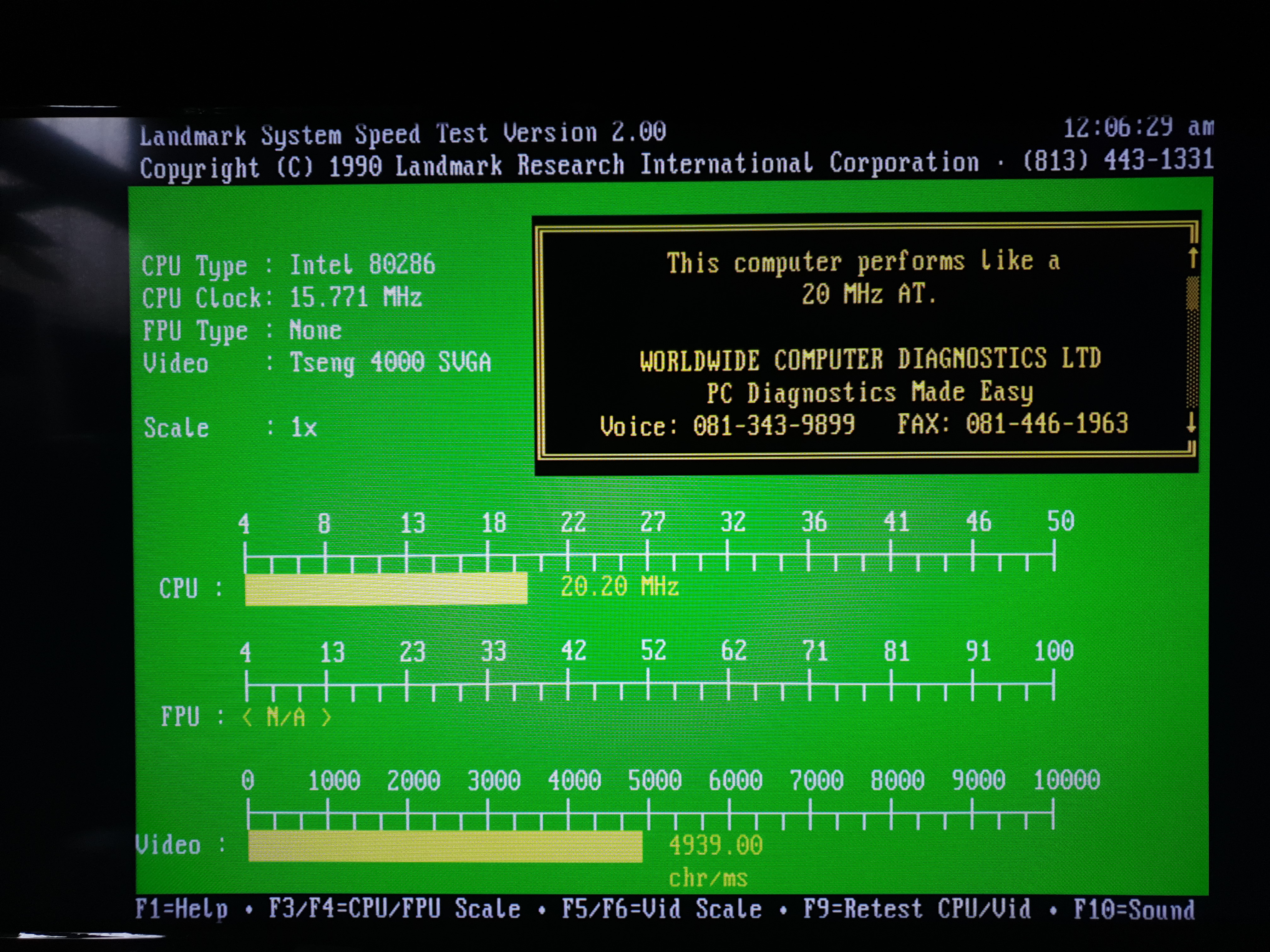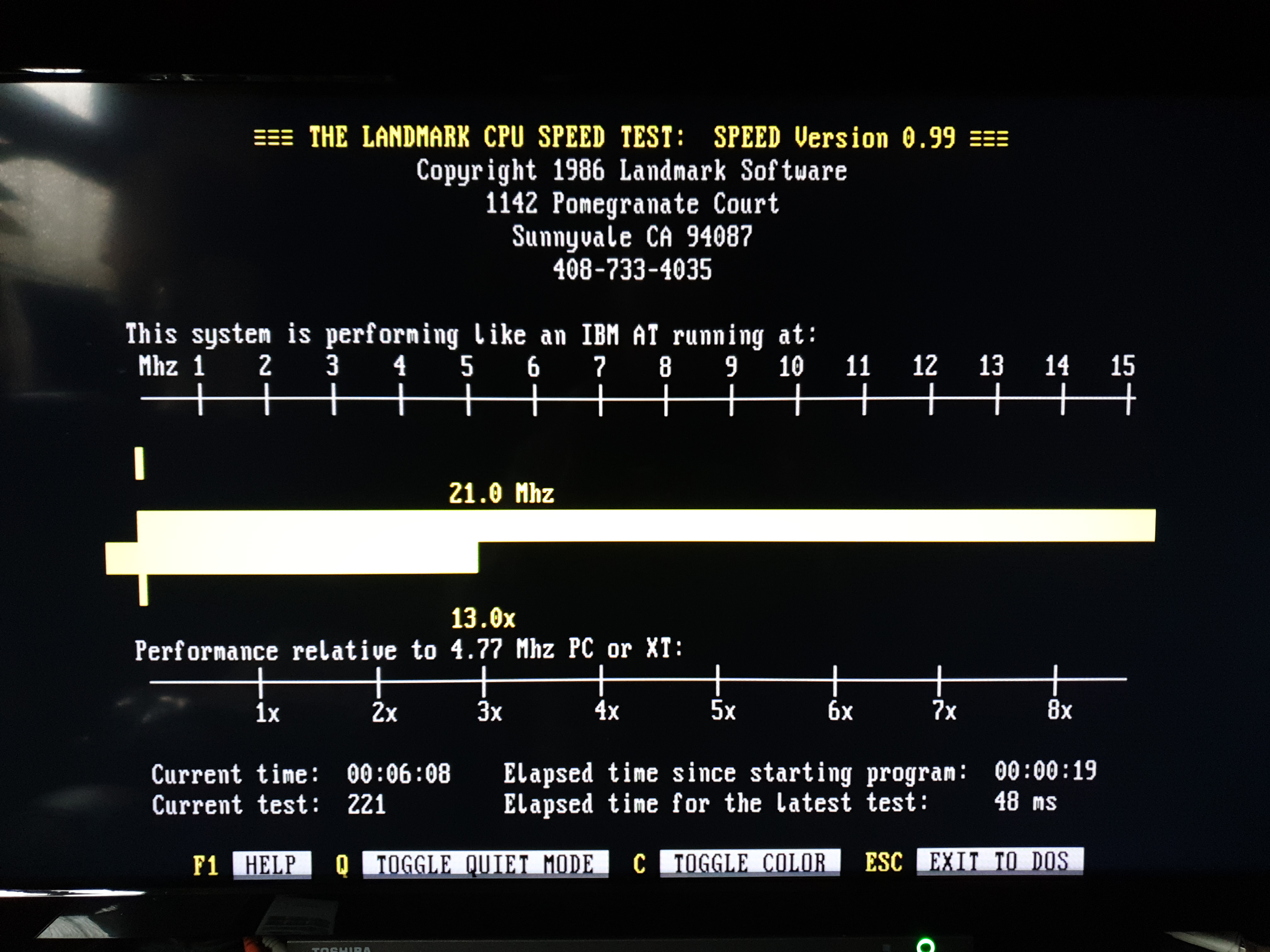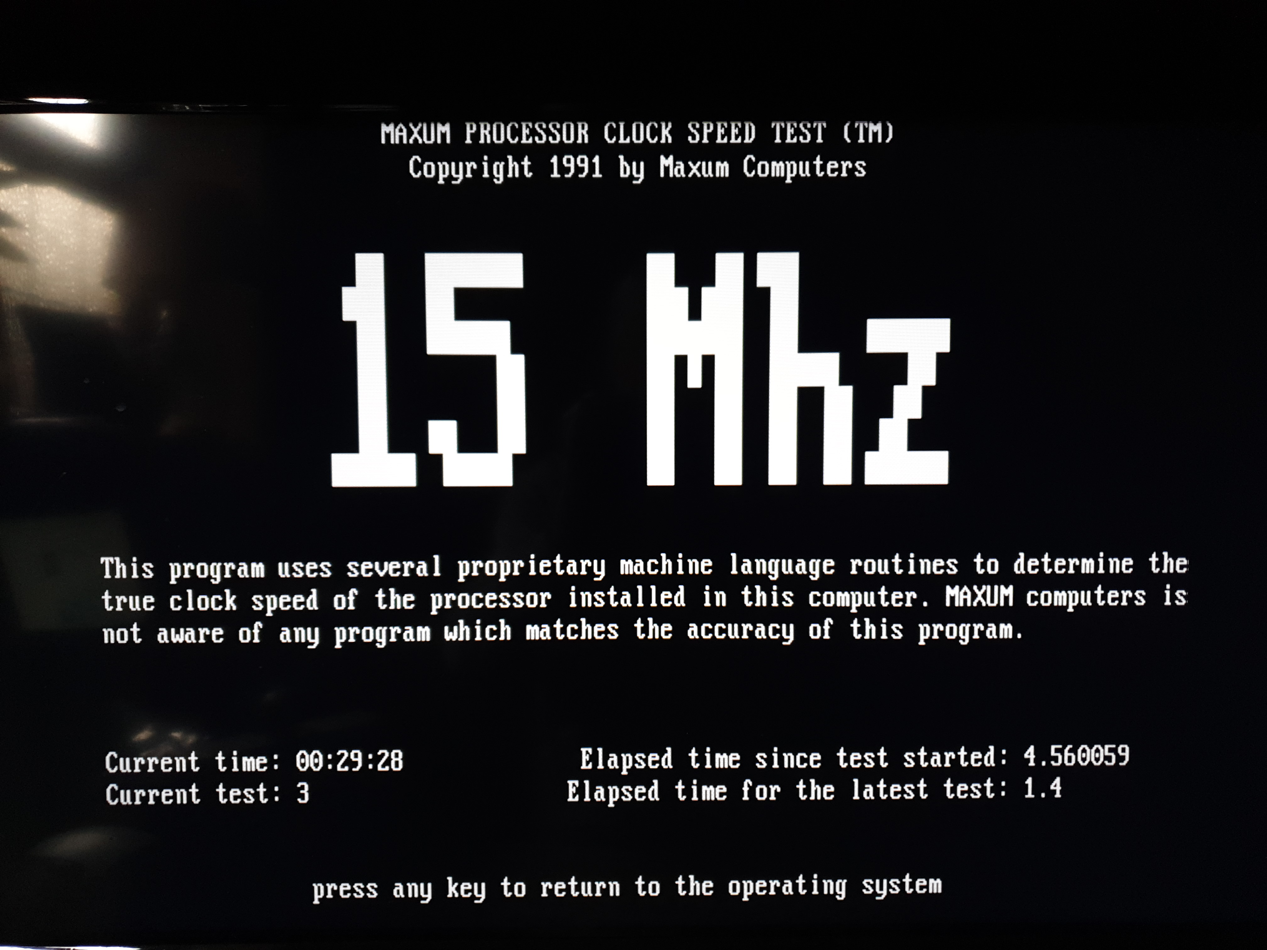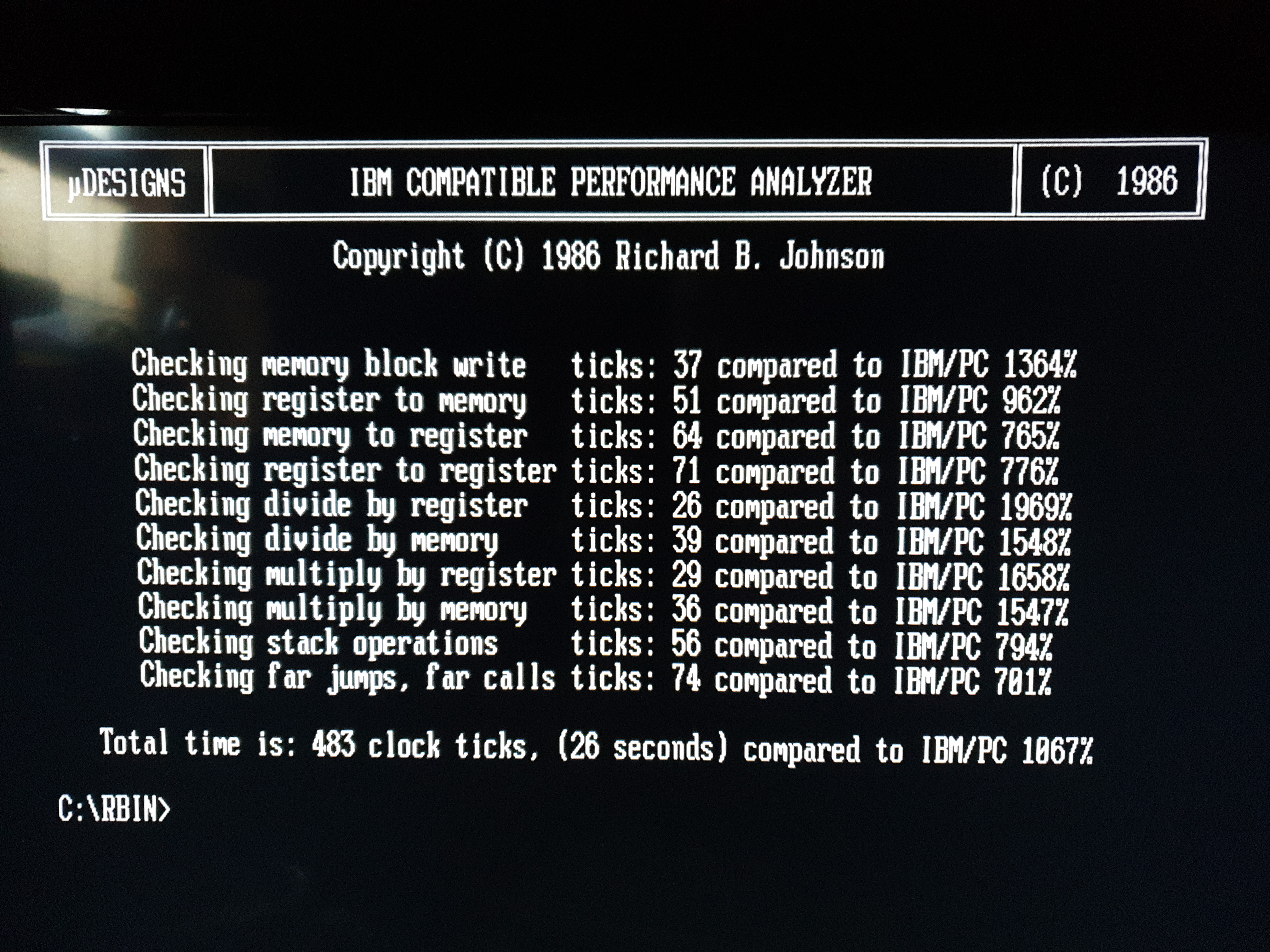 Now to swap out the 32 Mhz crystal for the 40 MHz one (so the CPU will be run at 20 MHz), and revert the BIOS settings back to their default of 1 wait state, these were the results: