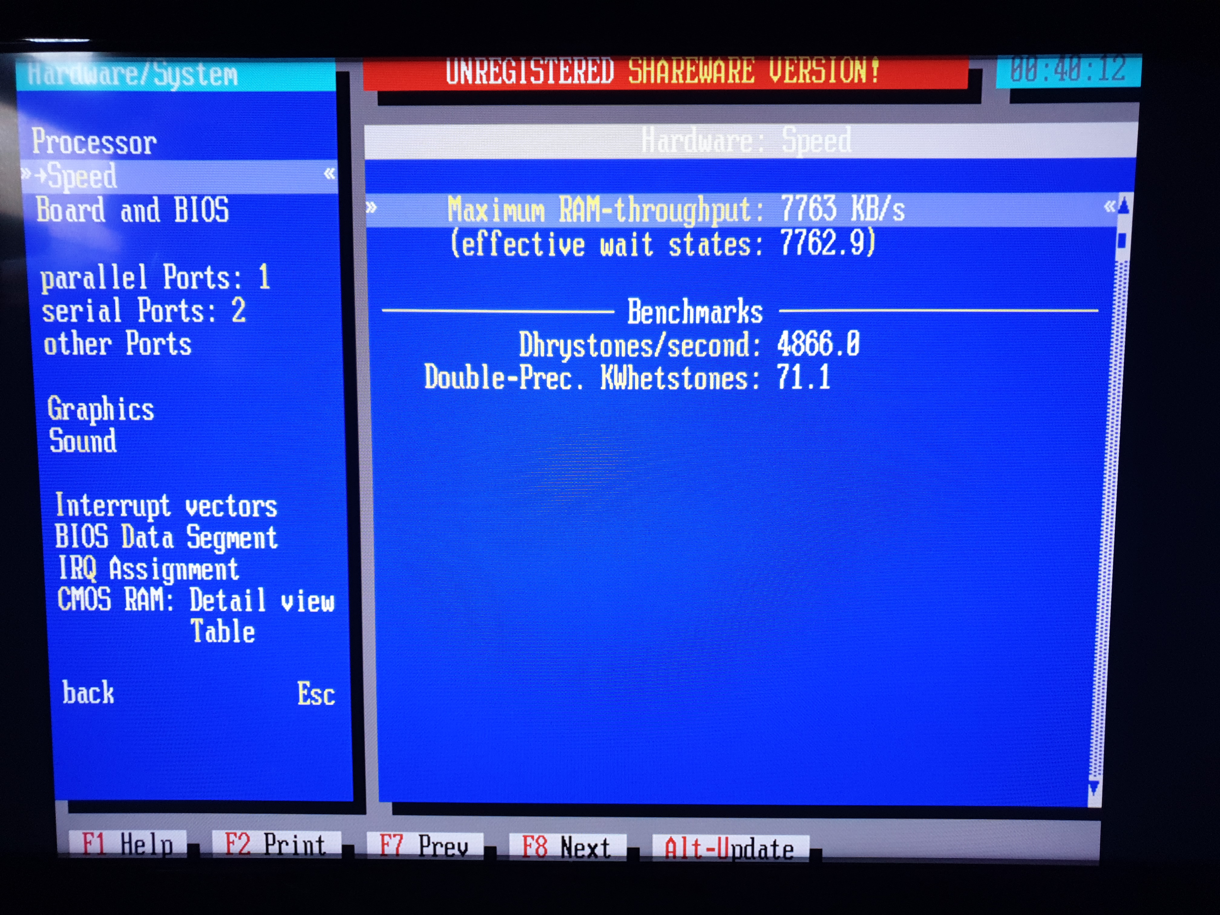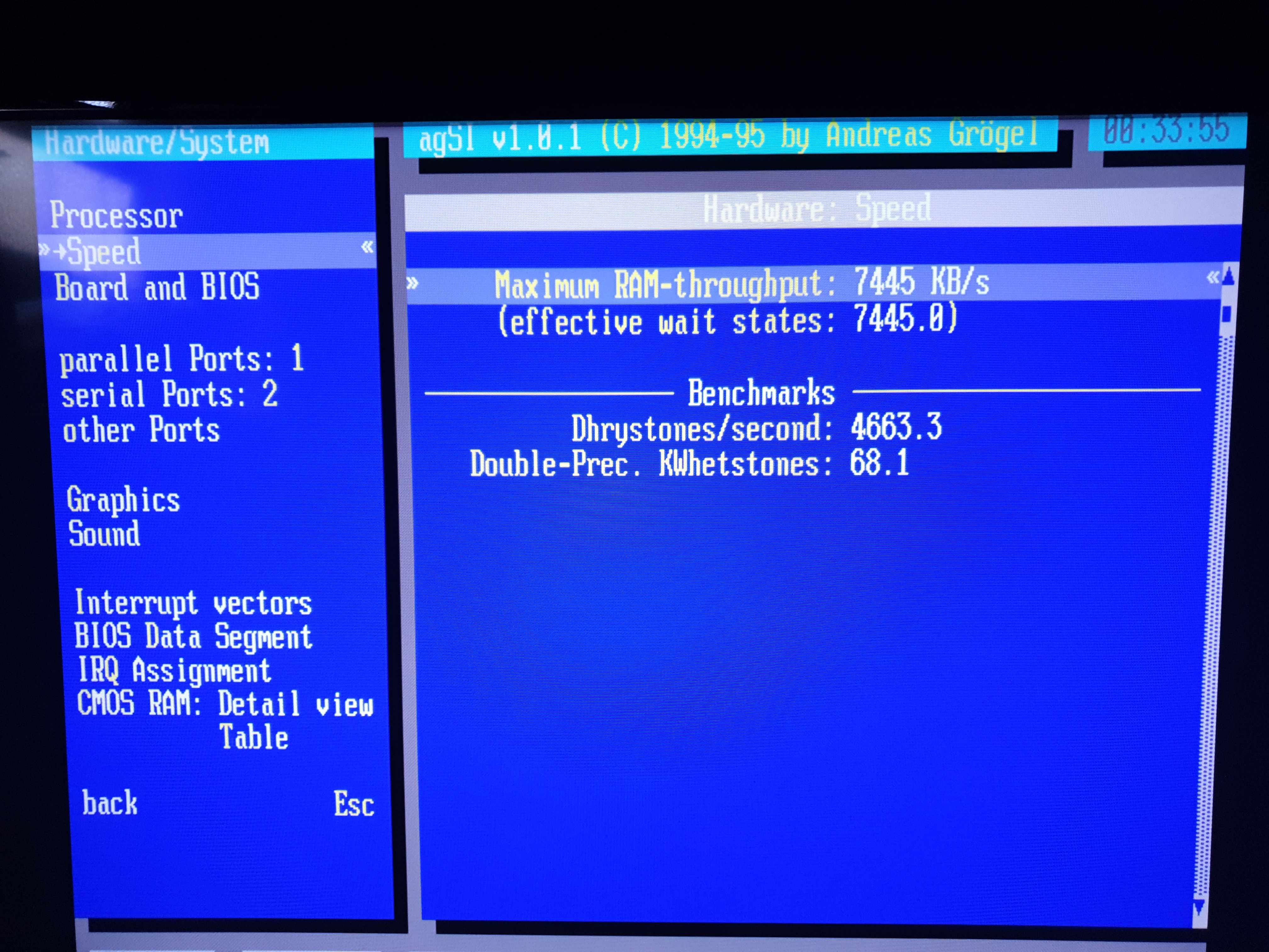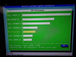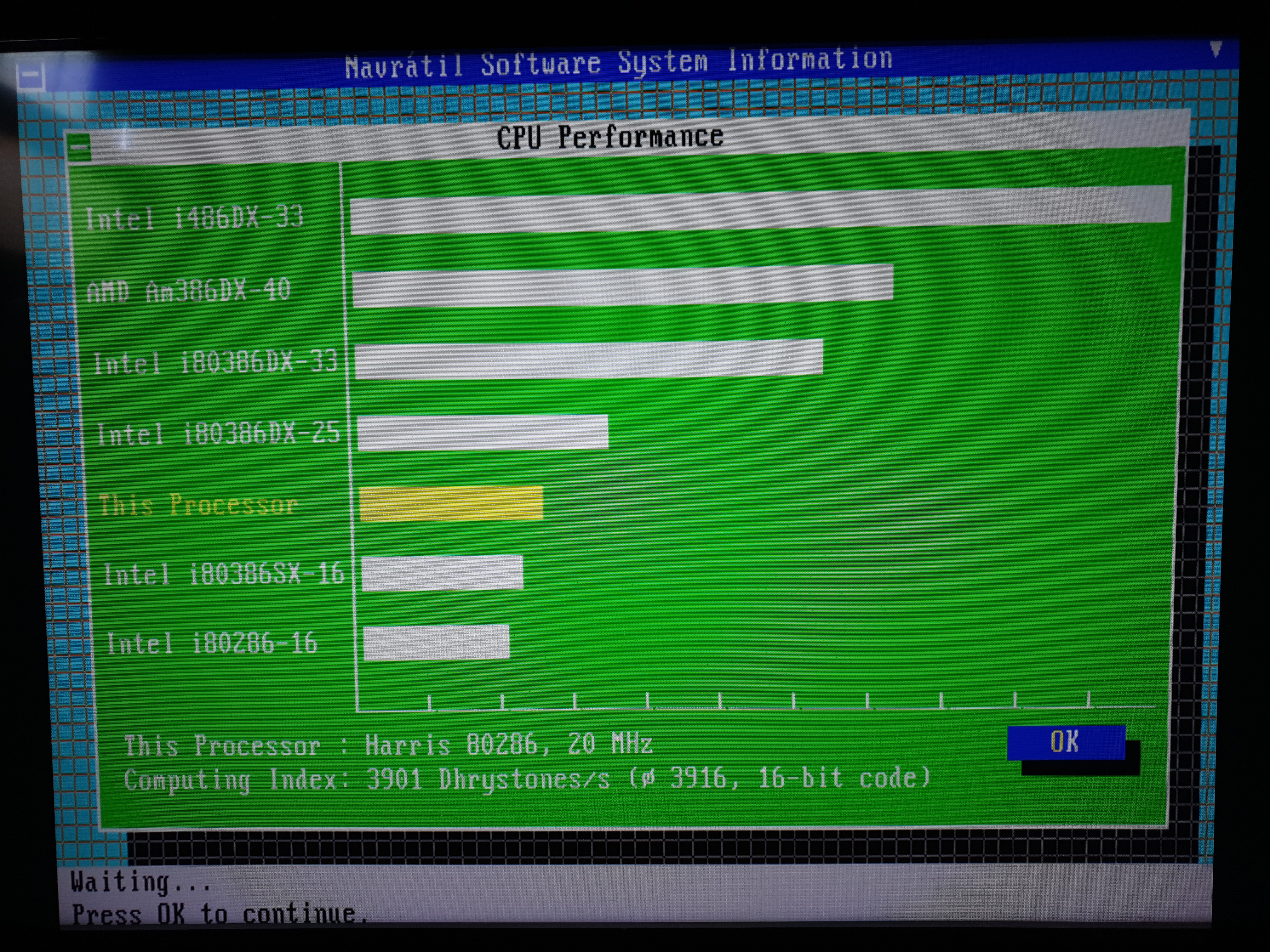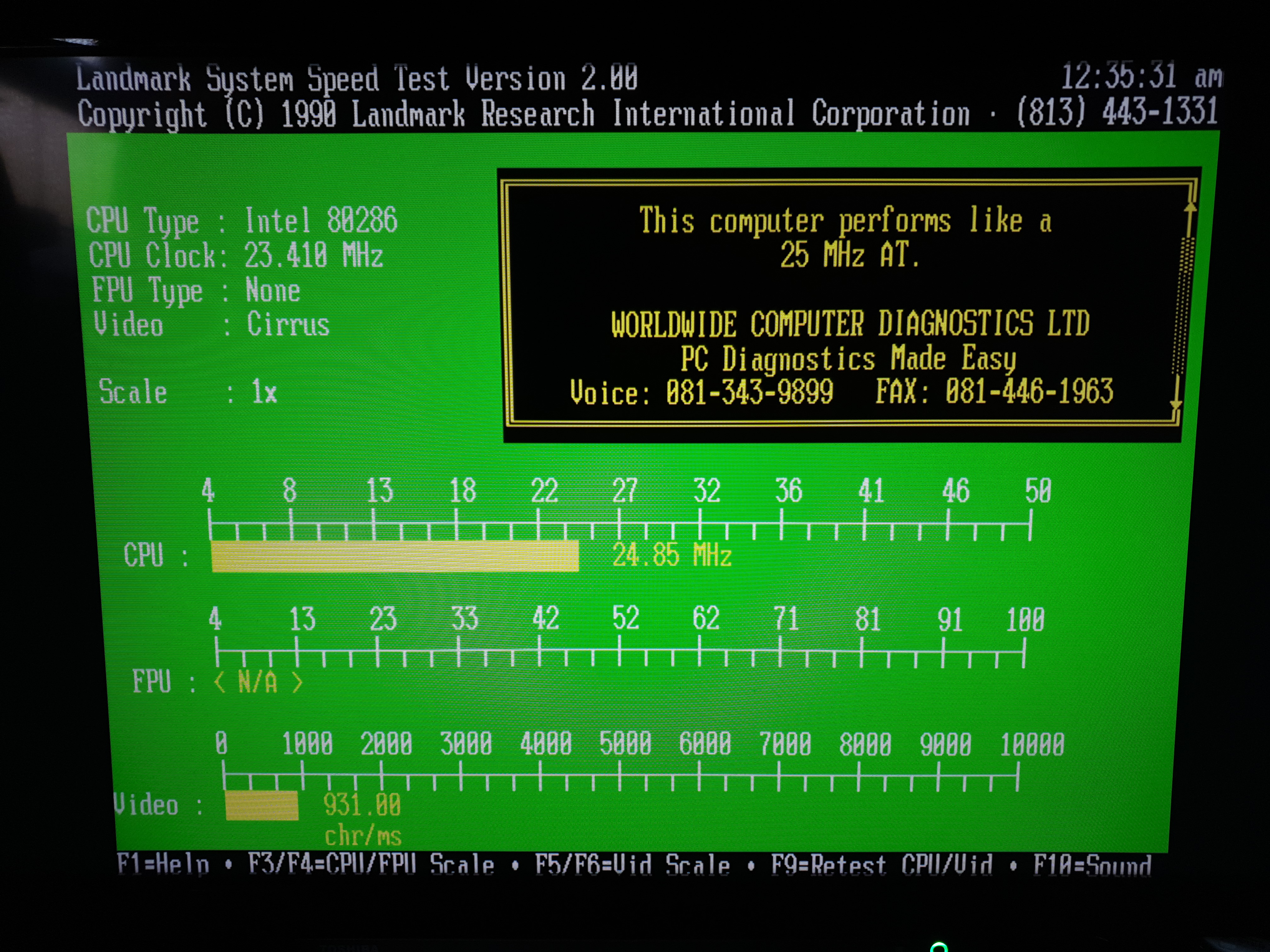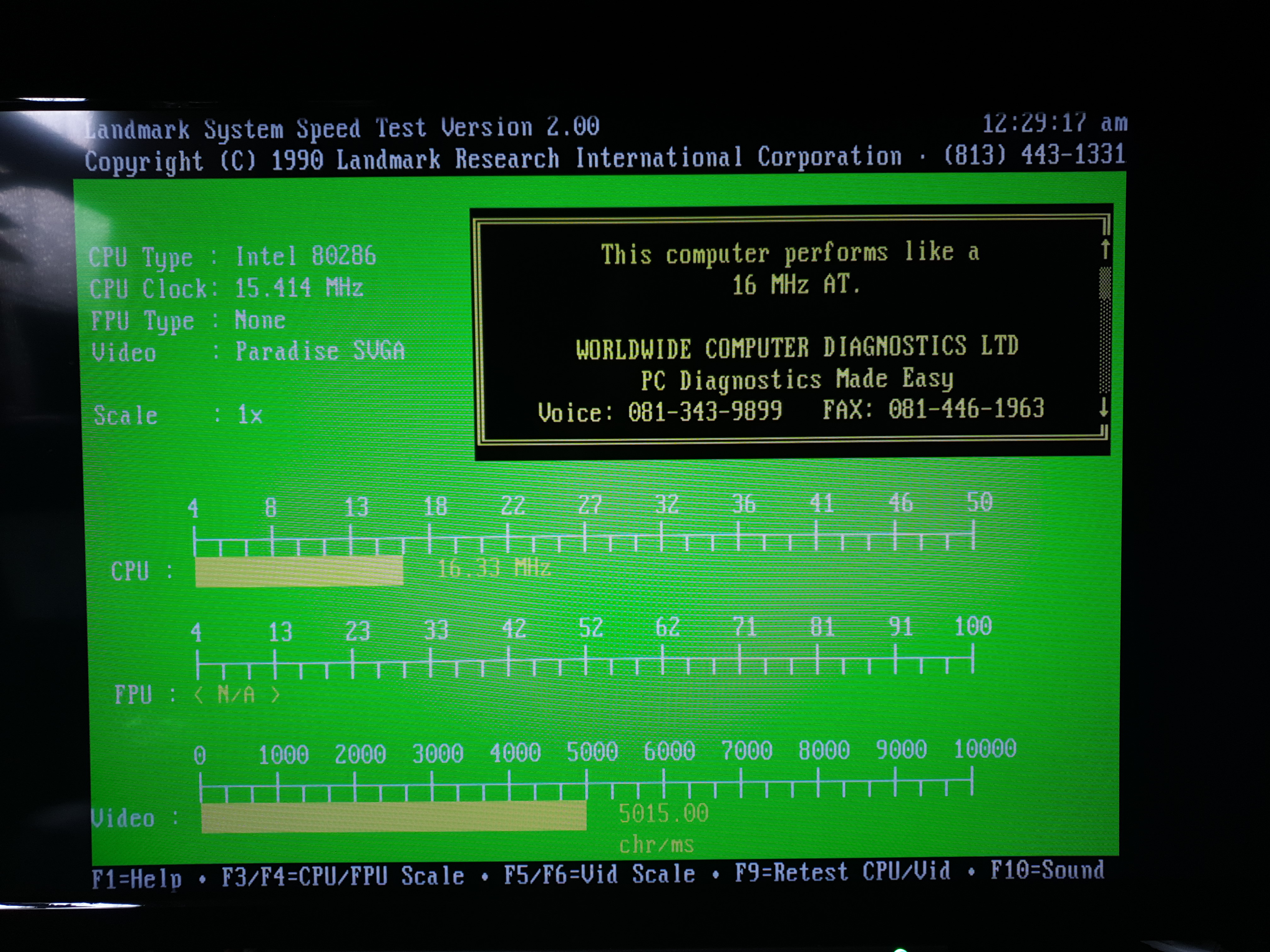 Now to swap out the 32 Mhz crystal for the 40 MHz one (so the CPU will be run at 20 MHz), and revert the BIOS settings back to their default of 1 wait state, these were the results: