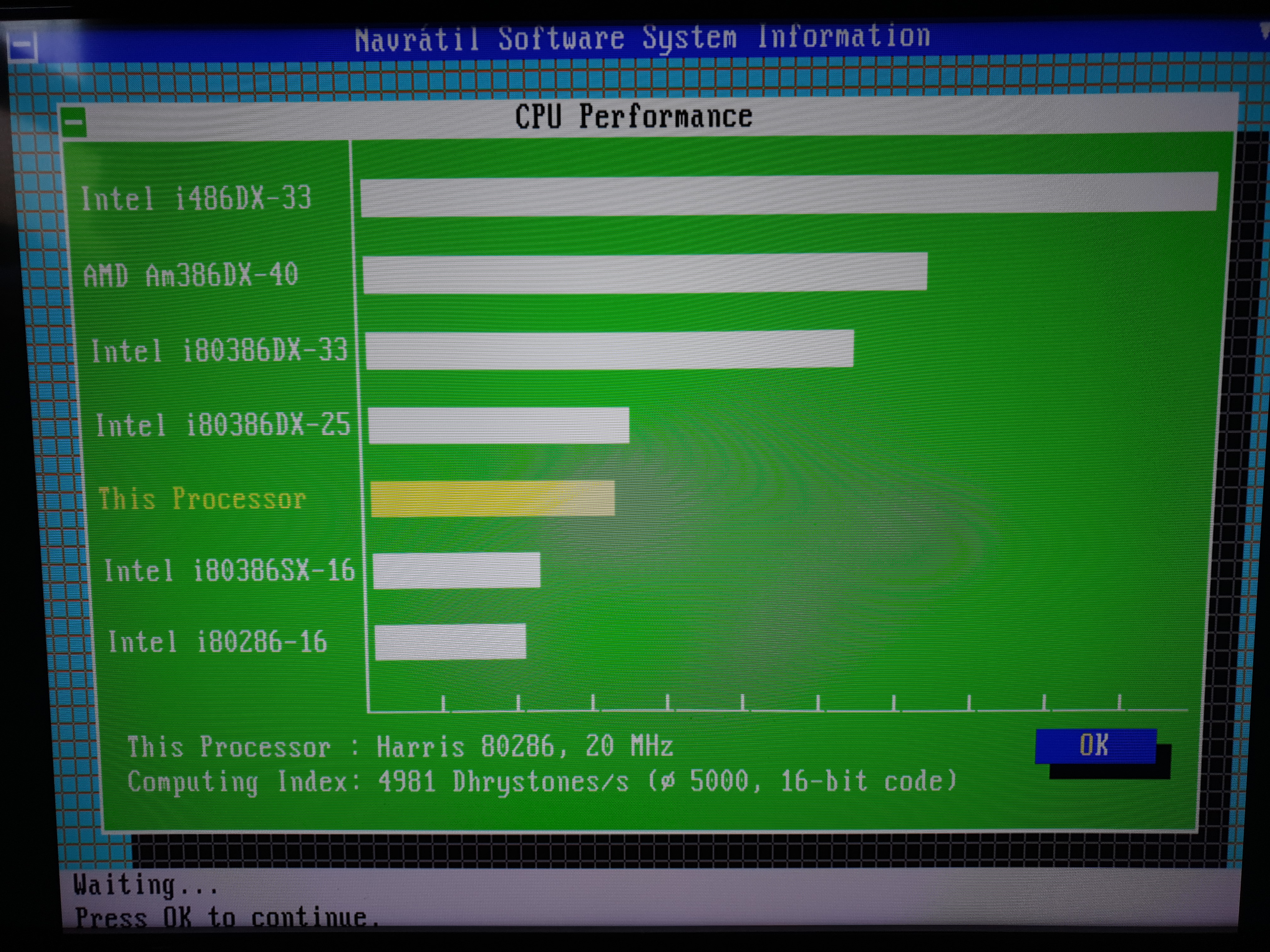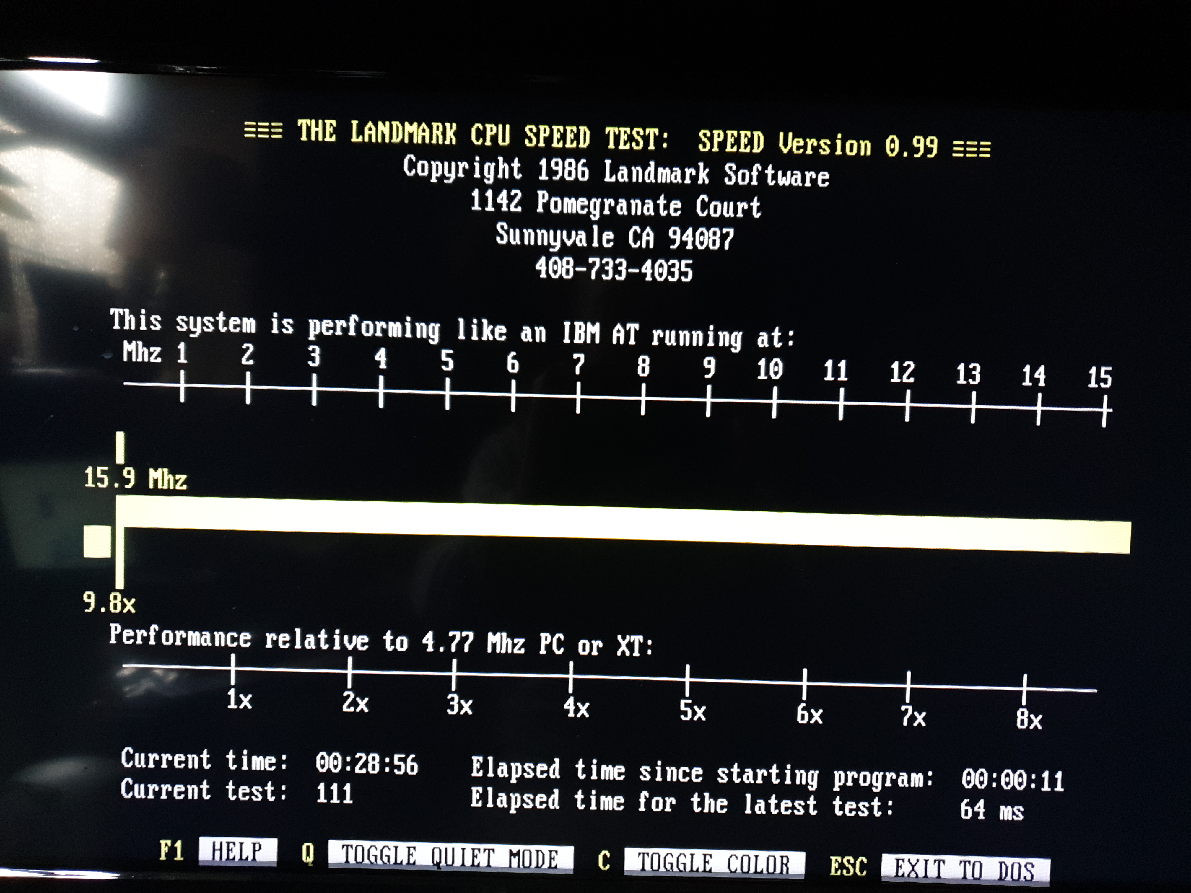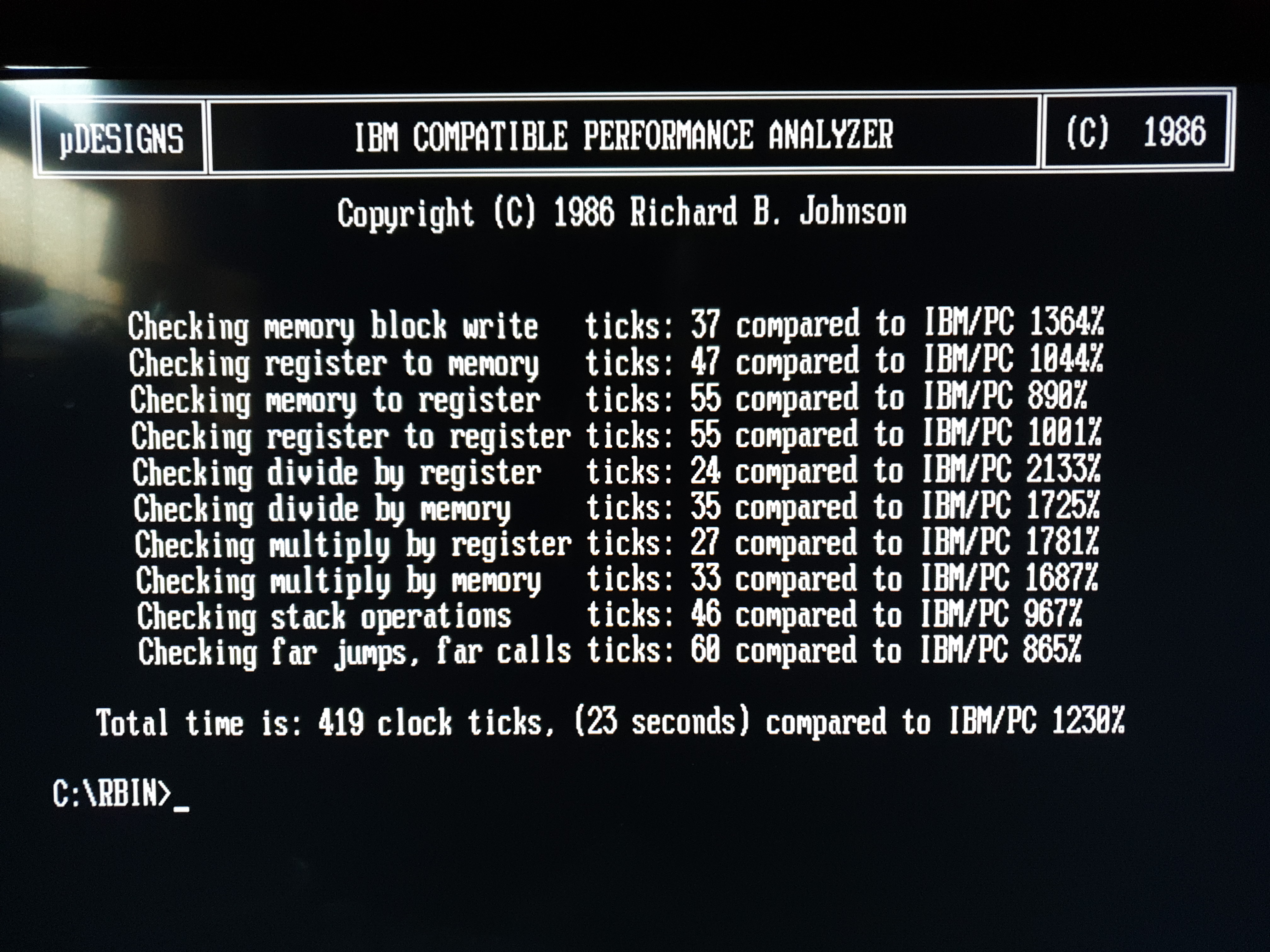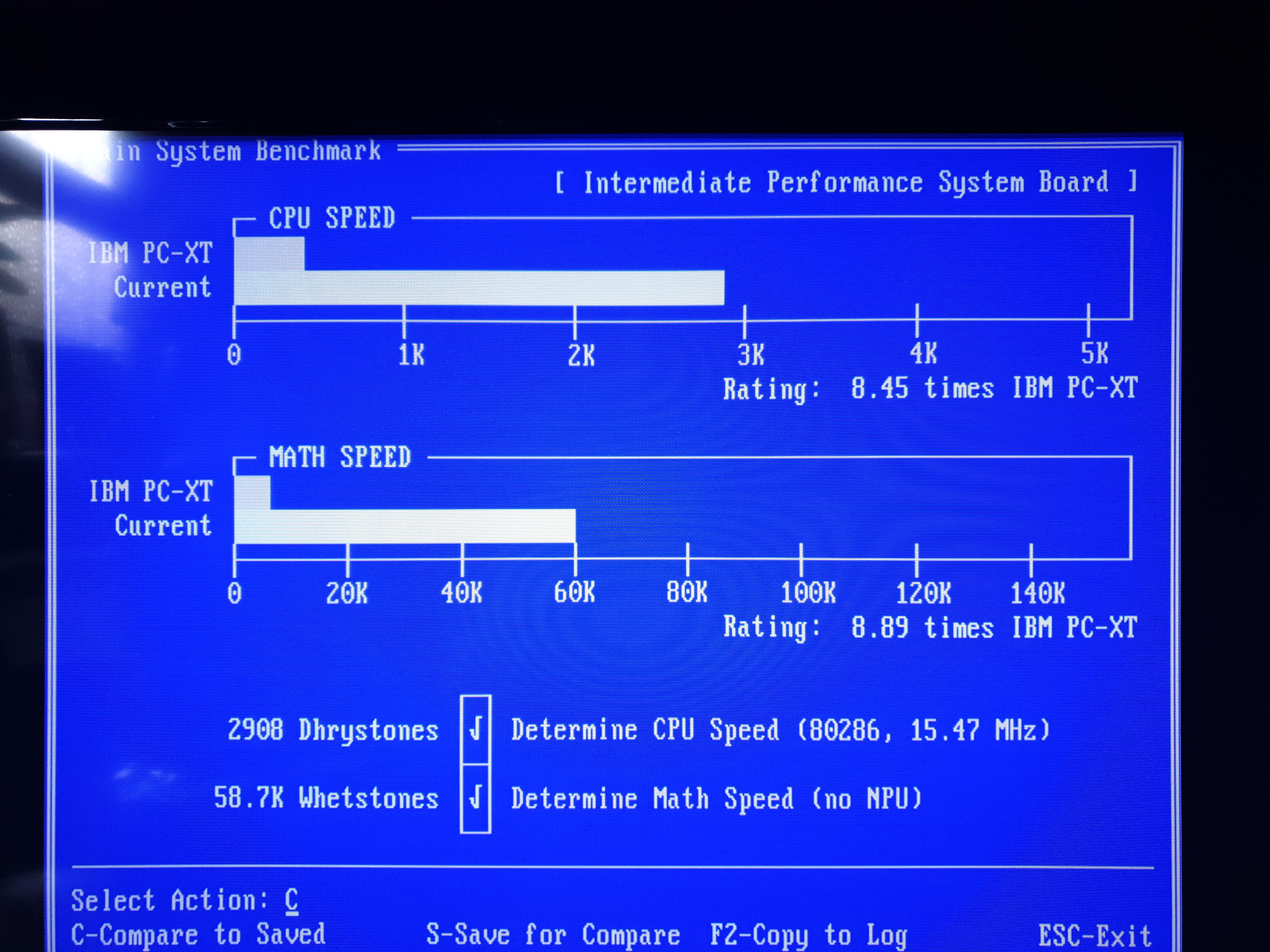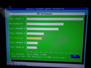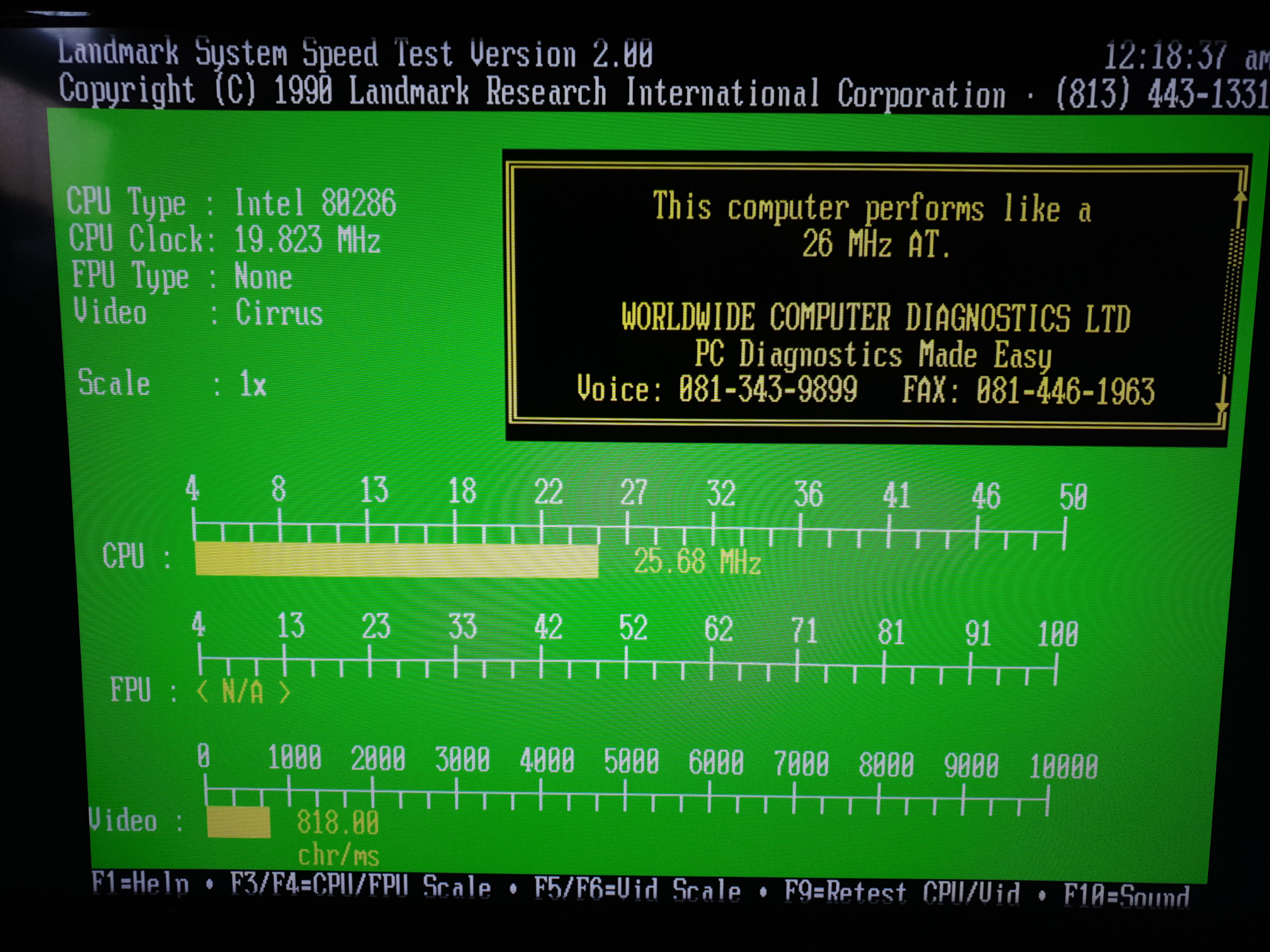 Now to swap out the 32 Mhz crystal for the 40 MHz one (so the CPU will be run at 20 MHz), and revert the BIOS settings back to their default of 1 wait state, these were the results: