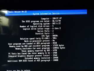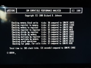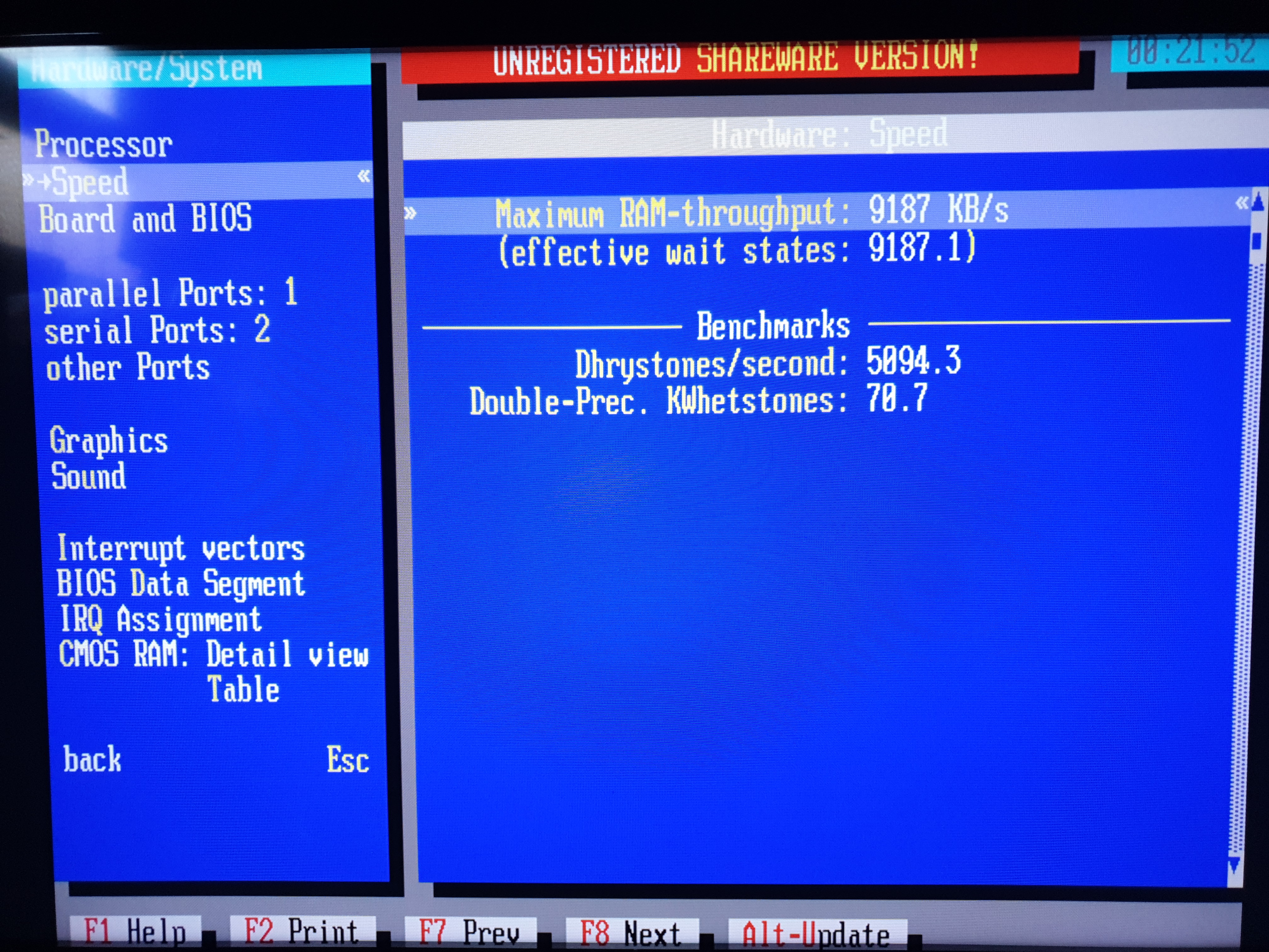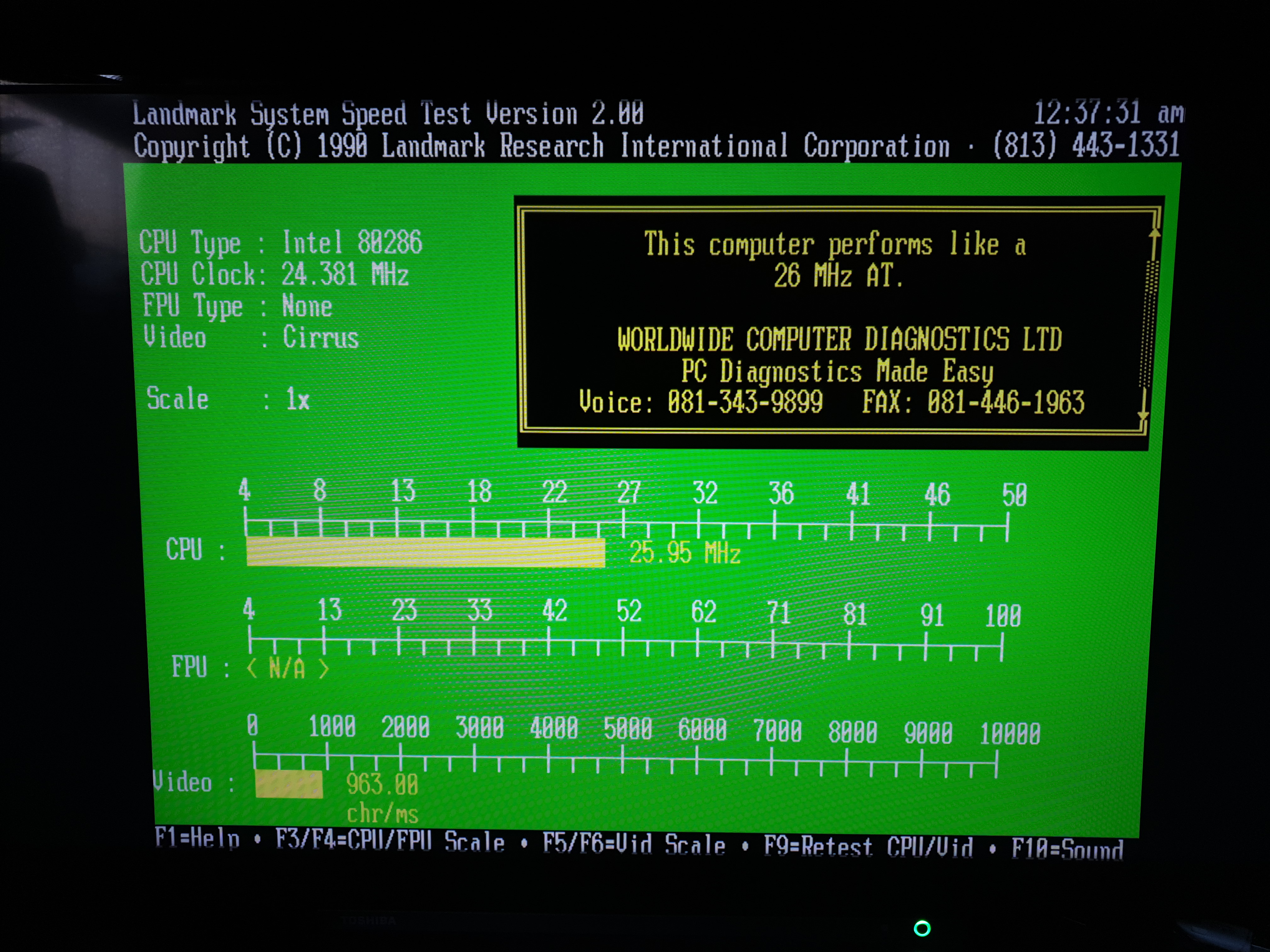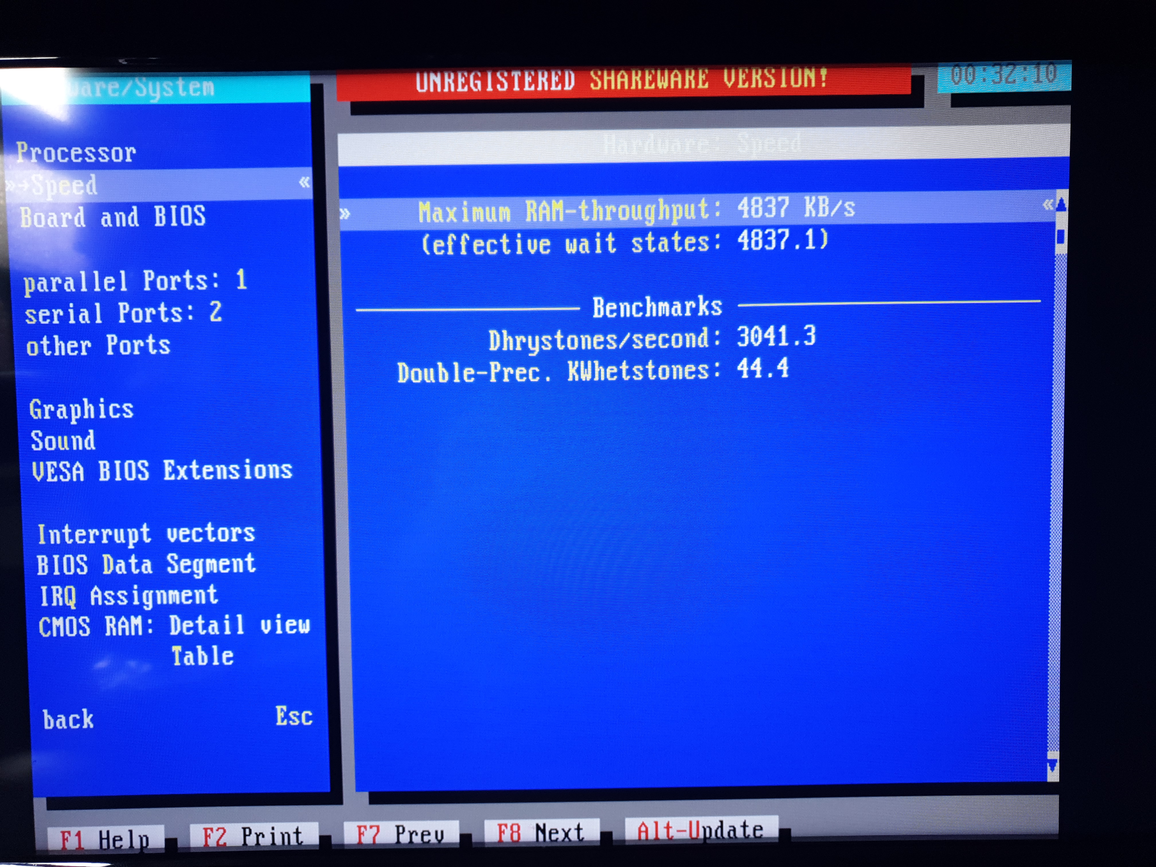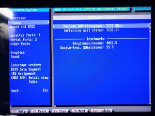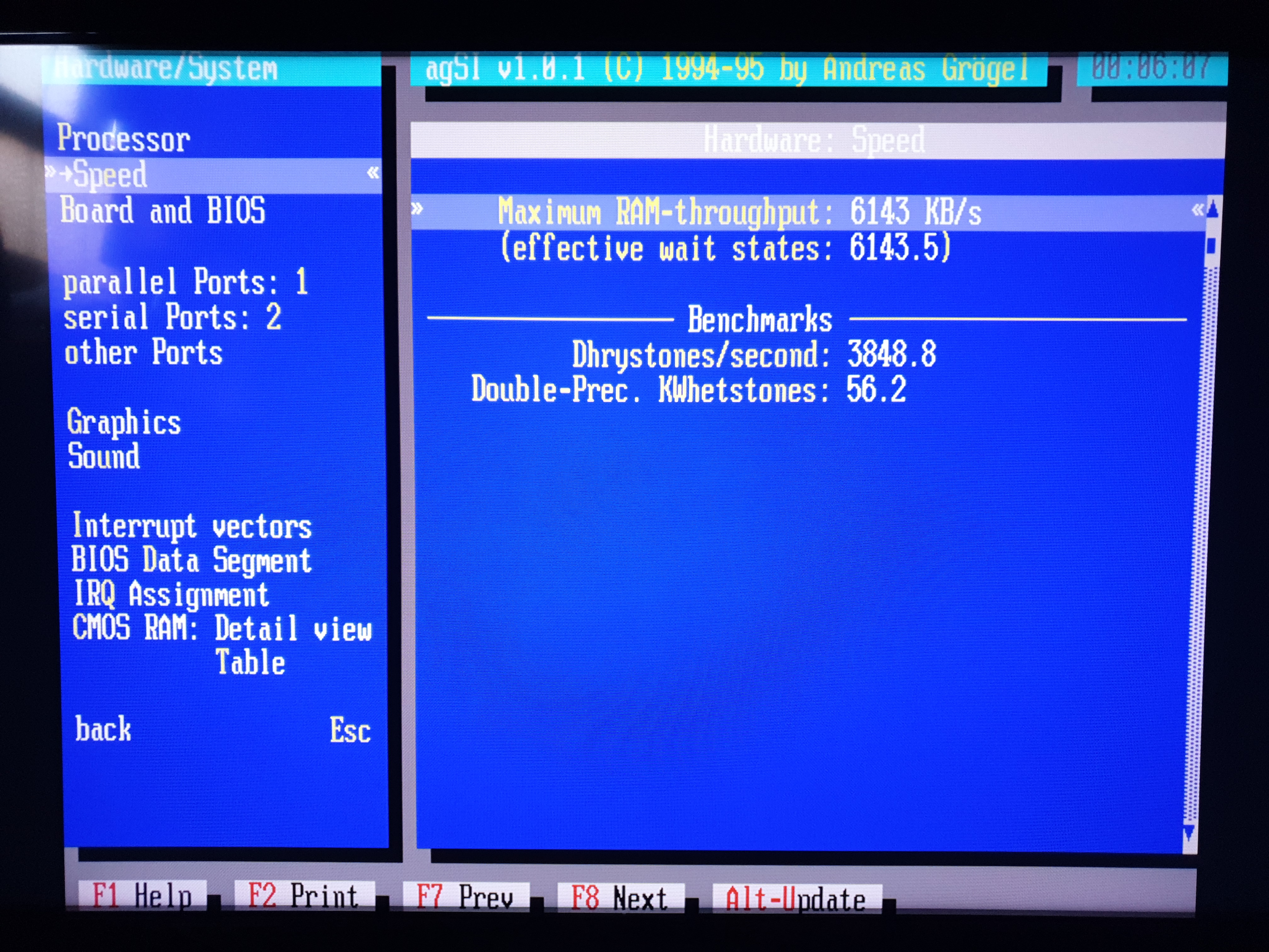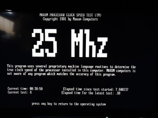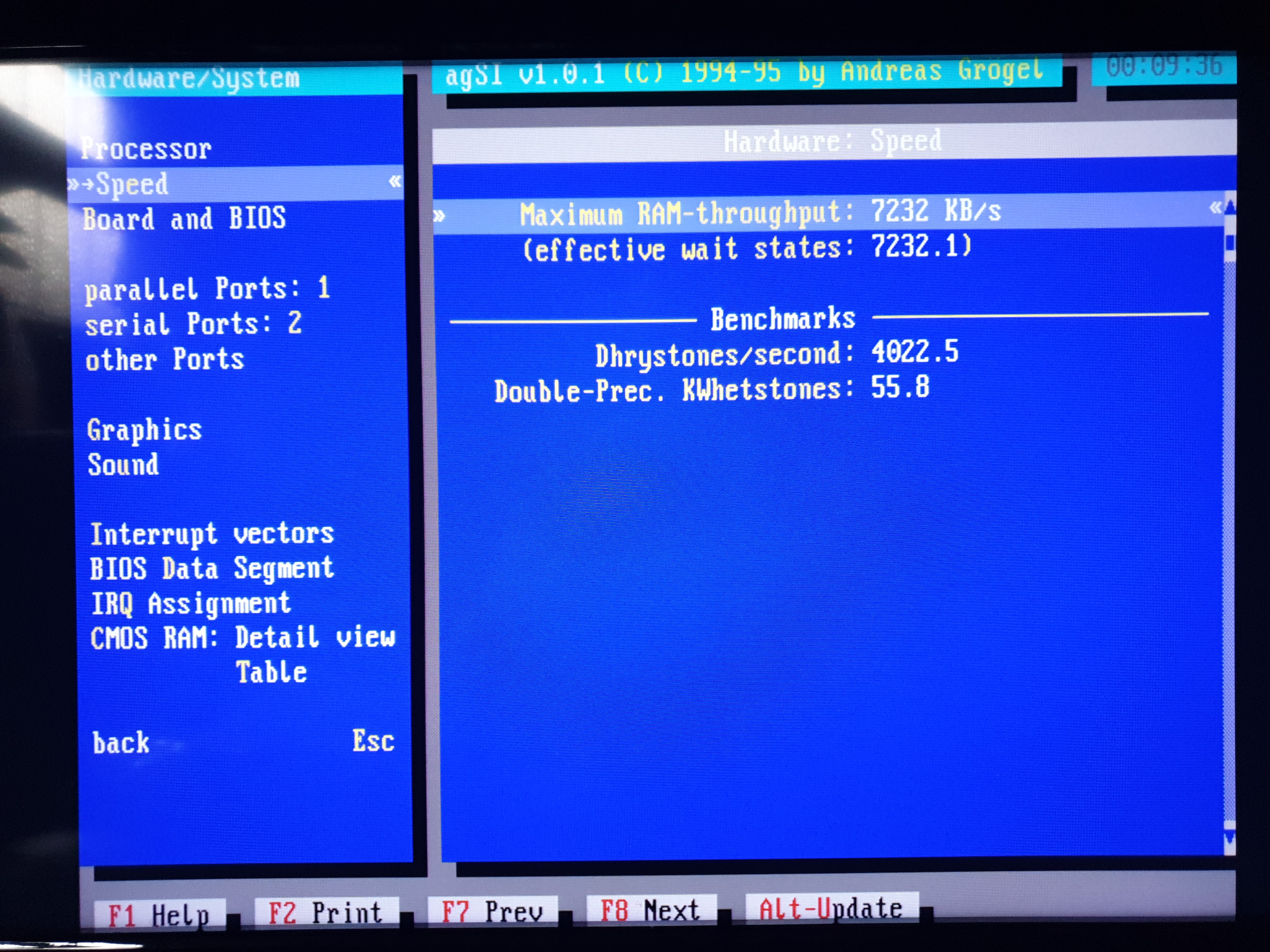Now to swap out the 32 Mhz crystal for the 40 MHz one (so the CPU will be run at 20 MHz), and revert the BIOS settings back to their default of 1 wait state, these were the results: