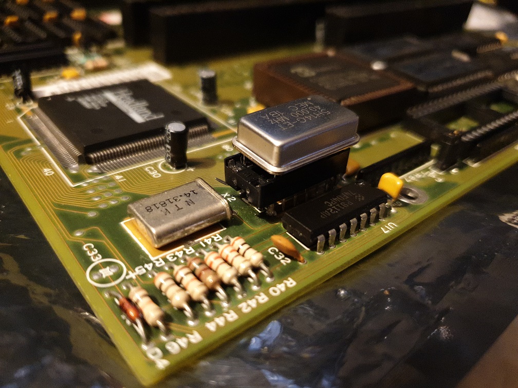 The 60ns DRAMs arrived, and after installing them and removing any SIMMs from the slots, I started off with the 32 MHz crystal. It booted successfully. Gradually I switched out the crystal for faster ones, but rather frustratingly it won't boot with 0 WS enabled, even on the 48 MHz crystal. There is of course a possibility that these are not true 60ns chips.
