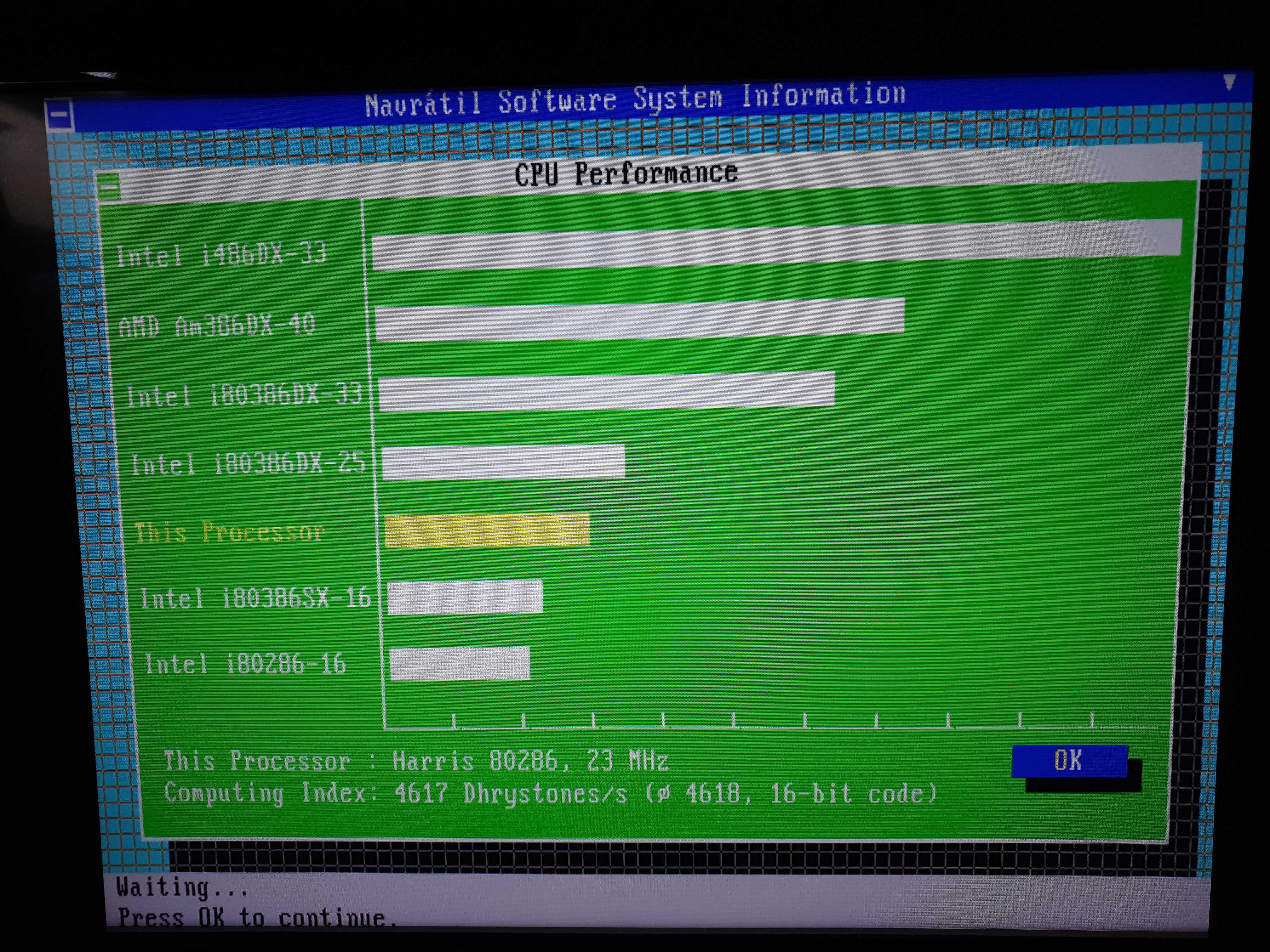 Compared to running the 12 MHz Siemens-branded 80286 with 1 wait state (WS), we see about a 28% uptick in synthetic benchmark performance with this Harris 286 running at 16 MHz (also with 1 WS), but about a 2% reduction in performance compared to the 12 MHz one running with 0 WS.