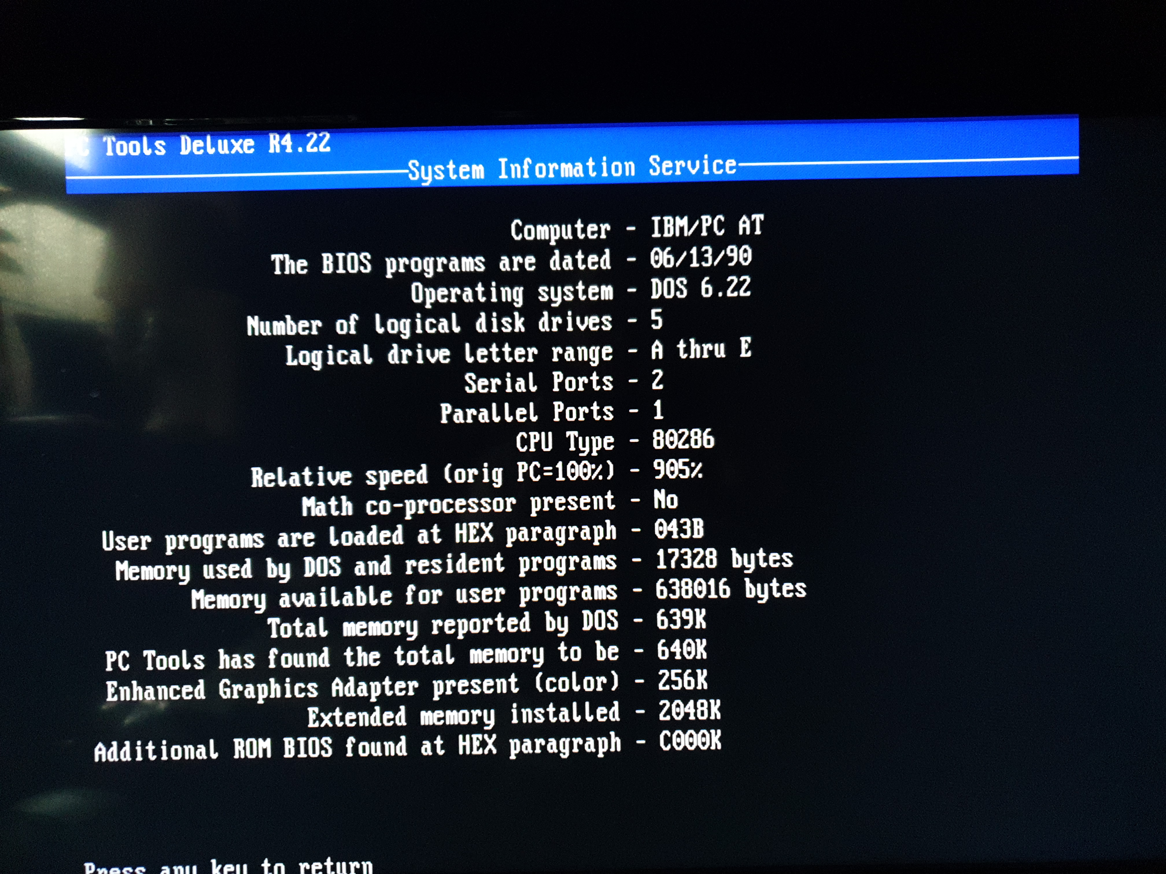 So in conclusion, the fastest I can get is 25 MHz with 1 wait state or 20 MHz with 0 wait states on this particular board. Is it actually faster than a 386, which was, after all, the purpose of this exercise?.... Yes and no - at least some 386s. If the 386 motherboard has no level 2 cache, the 286 can achieve similar performance to a 386DX-25. In real-world testing, my OPTi 386DX-20 with 0WS ran the Wolfenstein 3D timedemo at about 17 fps. Using the same video card on this 286 at the same 20 MHz clock speed and 0WS produced just under 15 fps. So it's close, but not quite there.