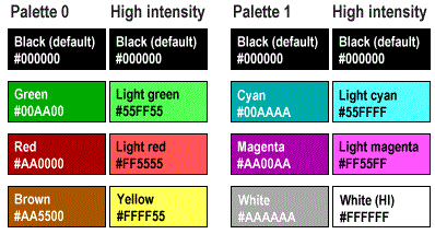 With its 16 KB of onboard video RAM, it could show 4 colours on-screen simultaneously at a graphical resolution of 320 x 200, or 2 colours at 640 x 200. You could choose from two palettes, which looked like this:
