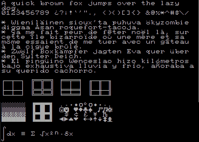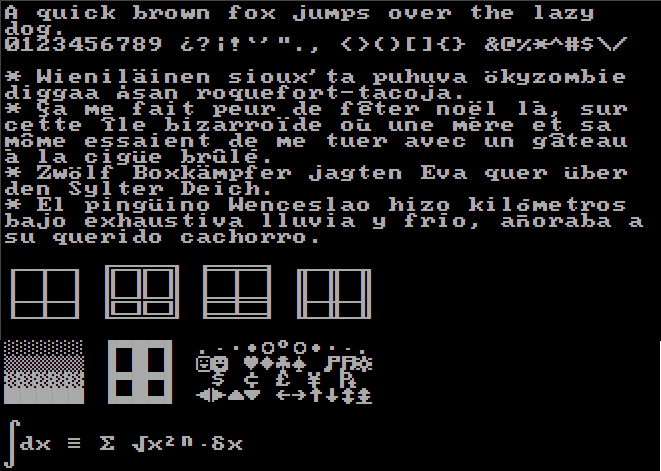 The character ROM contains two different character fonts, both of which are square 8 x 8 pixel blocks.