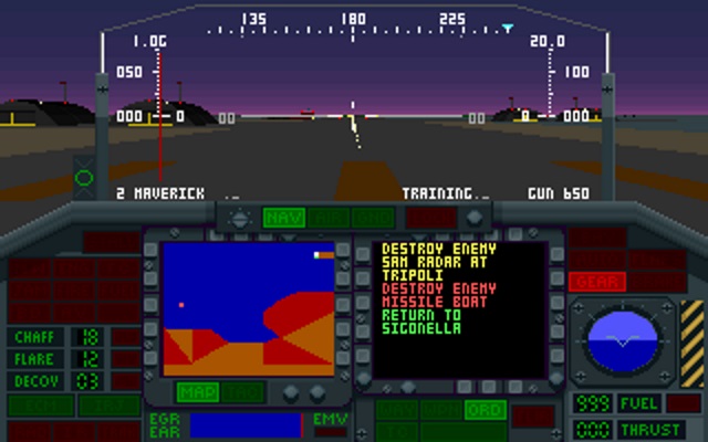 In 1989 MicroProse released F-15 Strike Eagle II, an excellent follow-up to F-19 Stealth Fighter from the year before, with VGA graphics and better audio support. The design goal for F15SE2 was to be more 'fun' and less 'sim', having recognised that F-19 was, for its time, a complex flight simulation, and perhaps perceived as difficult. F-15 had a more clear keyboard layout while retaining its core flight sim roots.