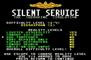 Silent Service was in development for 8 months and its creation was inspired by a fractal technological trick. Set in the Pacific Ocean during World War II, with the player assuming control of a U.S. Gato-class submarine for various war patrols against Japanese shipping. "Silent Service" was a nickname for the US Navy's submarine force in the Pacific during World War II. The player can choose when to attack from a range of realistic tactics, including the End Around and near invisibility at night (if the sub's profile is kept to a minimum). It allows four projectiles concurrently, a challenge when battling multiple destroyers. Real-time is accelerated when not in combat.