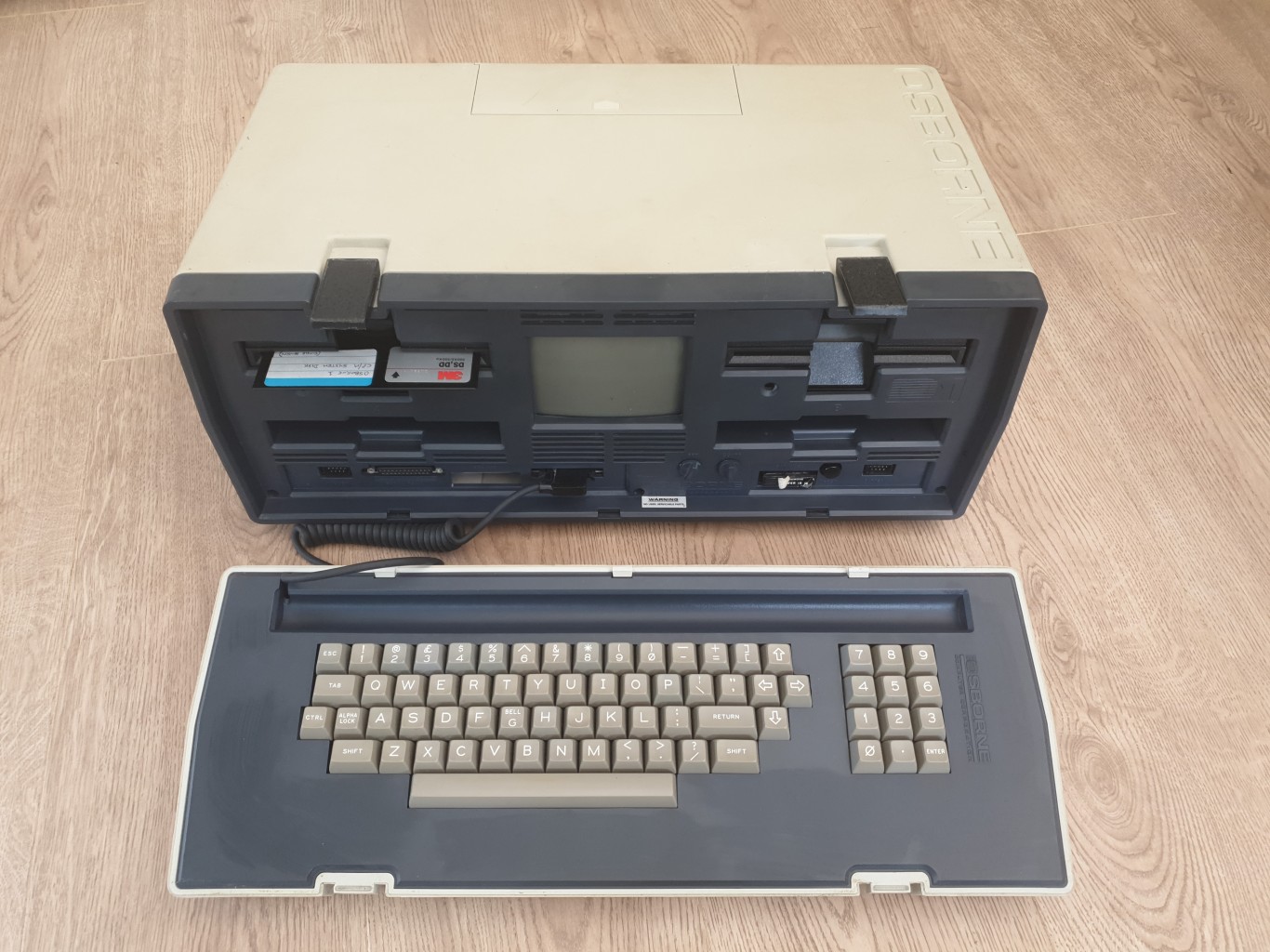 The Osborne 1 computer is widely viewed as the world's first portable computer, and was launched in April 1981 by Adam Osborne of Osborne Computer Corporation. It runs a Zilog Z80A microprocessor at 4 MHz and has 64 KB of RAM. Despite being called 'portable' it has no internal batteries (you have to plug it into the mains) and weighs in at 10 kg! Brand new it retailed for £1,250 plus tax, though it did come bundled with CP/M 2.2,the MicroPro WordStar word processor with MailMerge, and the SuperCalc spreadsheet. Because it ran CP/M, many thousands of applications were available to run on it, making it hugely popular.