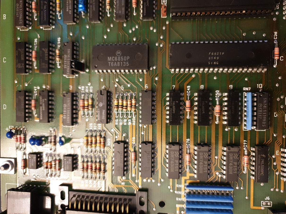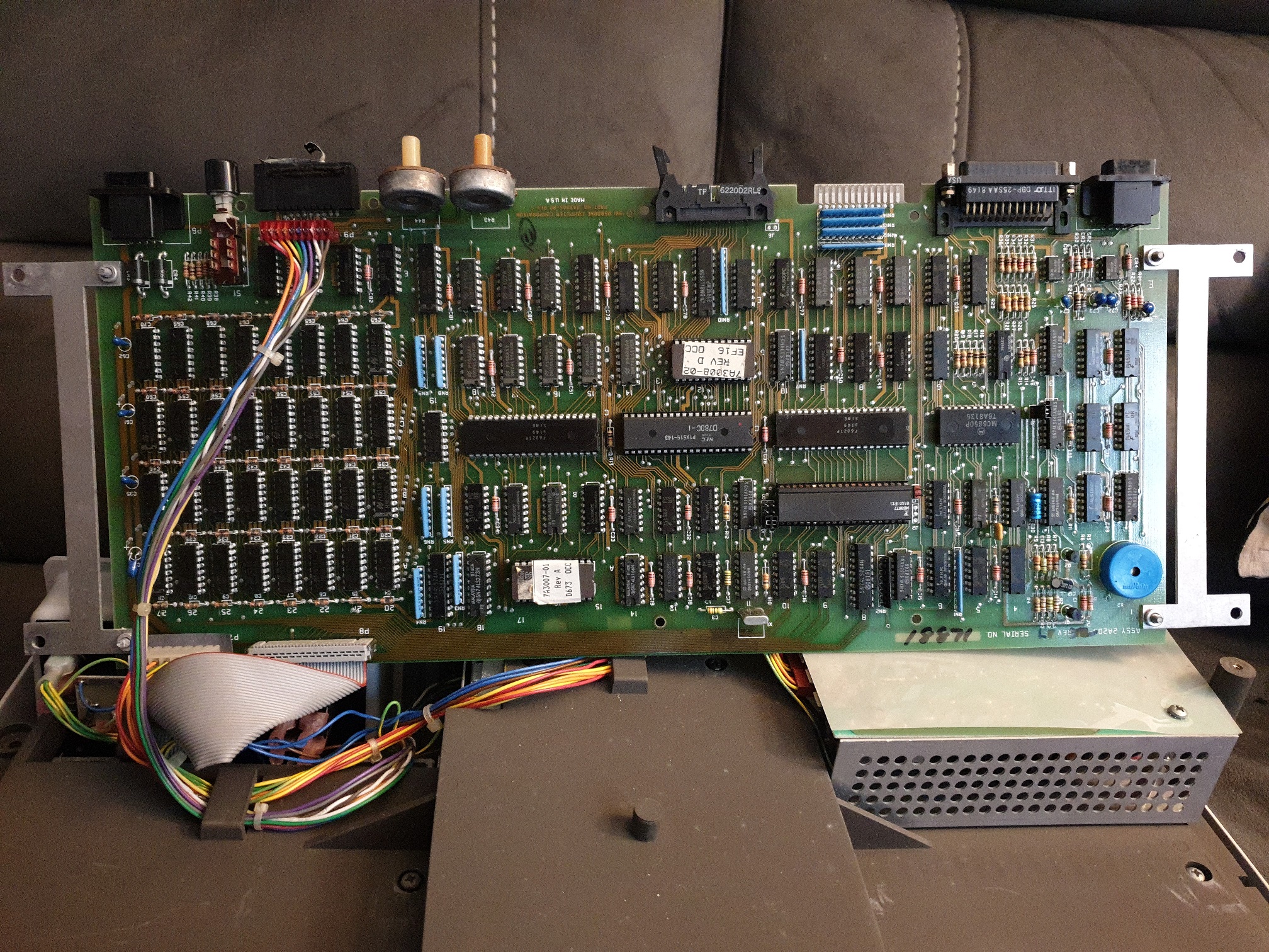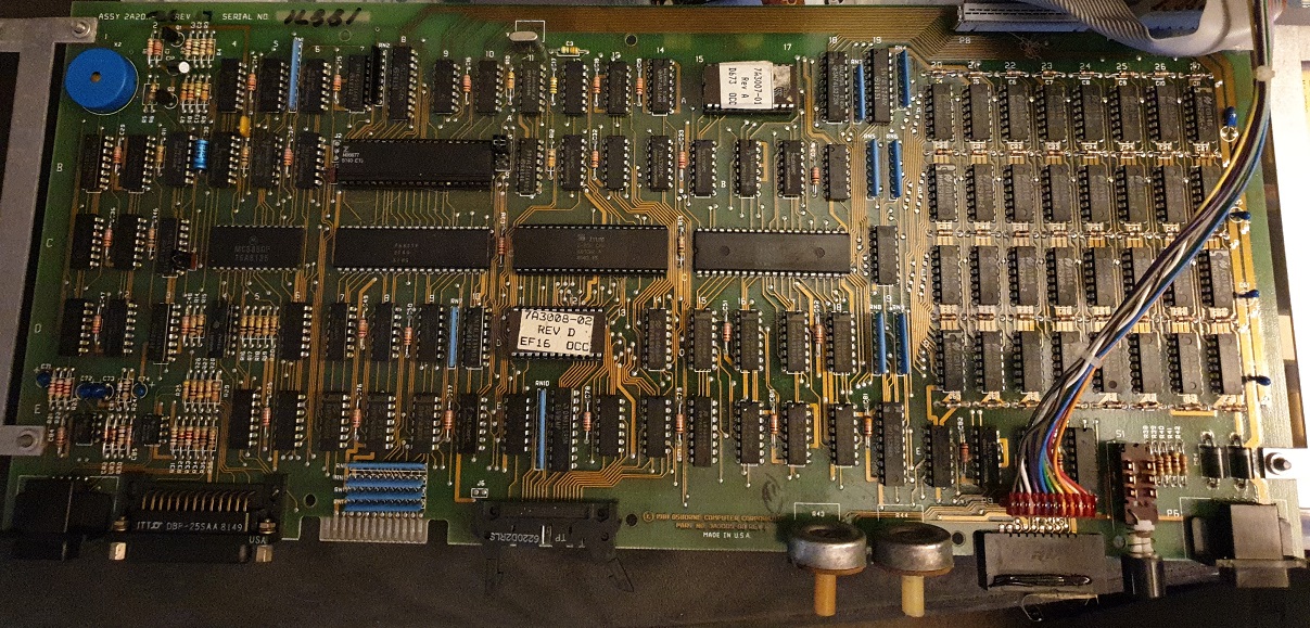 The latest date code on the main logic board is 8149 (week 49 of 1981). All the memory ICs are the same National Semiconductor MM5290N-2 chips, which are 16,384 x 1 bit, meaning that each chip holds 16384 divided by 8 = 2048 bytes = 2 KB. Since we have 32 chips on the board that makes a total of 64 KB. It's a good sign that all RAM chips are the same as it implies nothing's been tampered with from its original factory state.