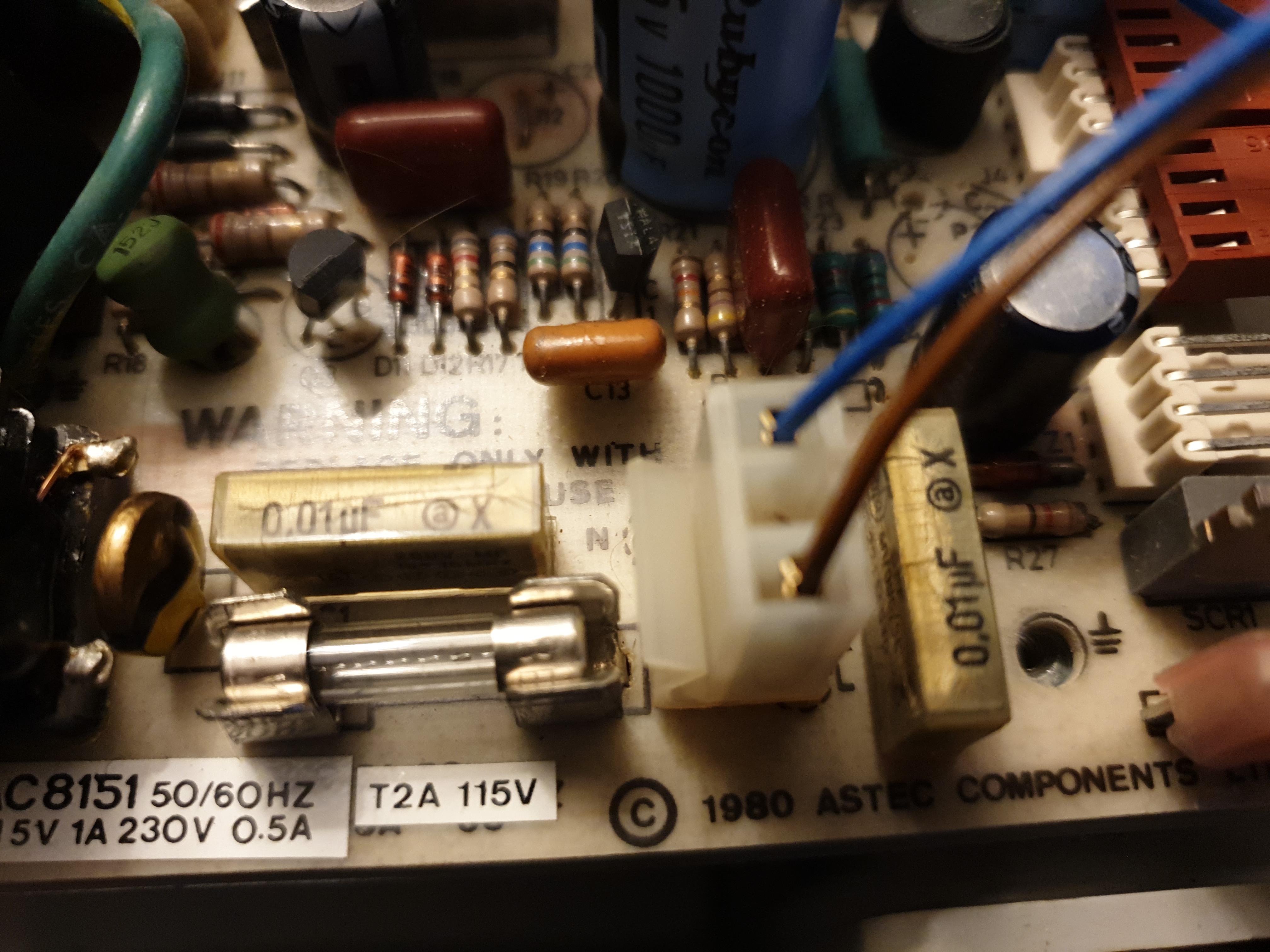 The cause? A blown filter capacitor in the Astec power supply. This a very common point of failure on these Osborne 1s, and there are several reports of this on the internet.