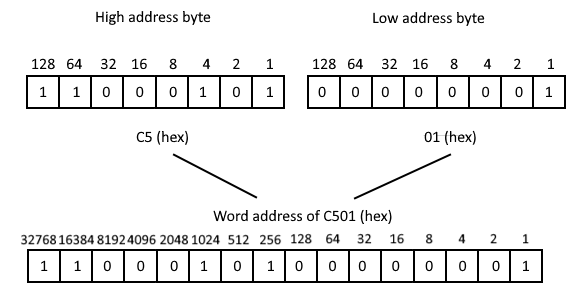 The byte at word address C5:01 is accessed using an address high byte of C5 and an address low byte of 01.