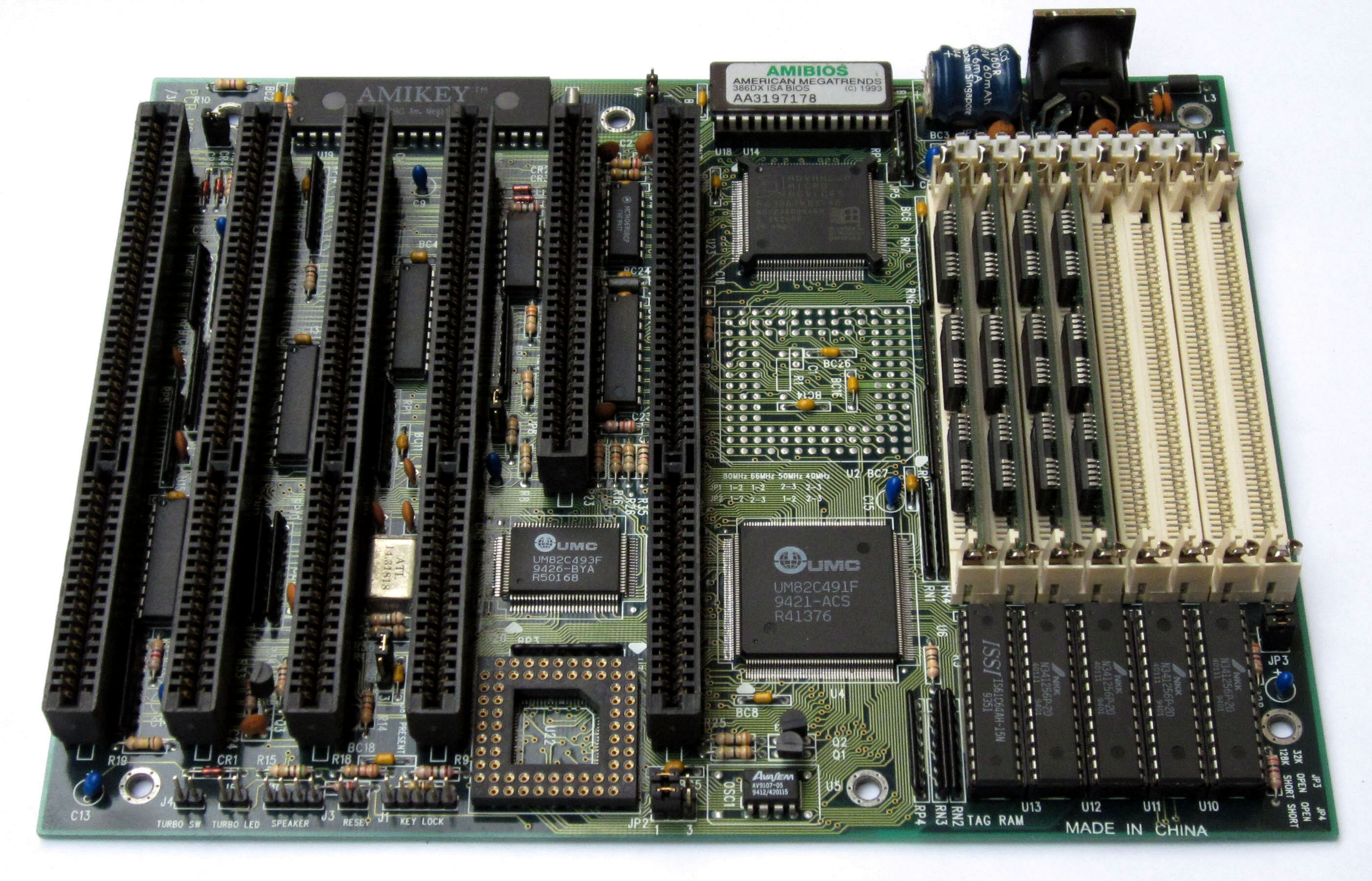 A 386 motherboard with one 8-bit and five 16-bit ISA slots