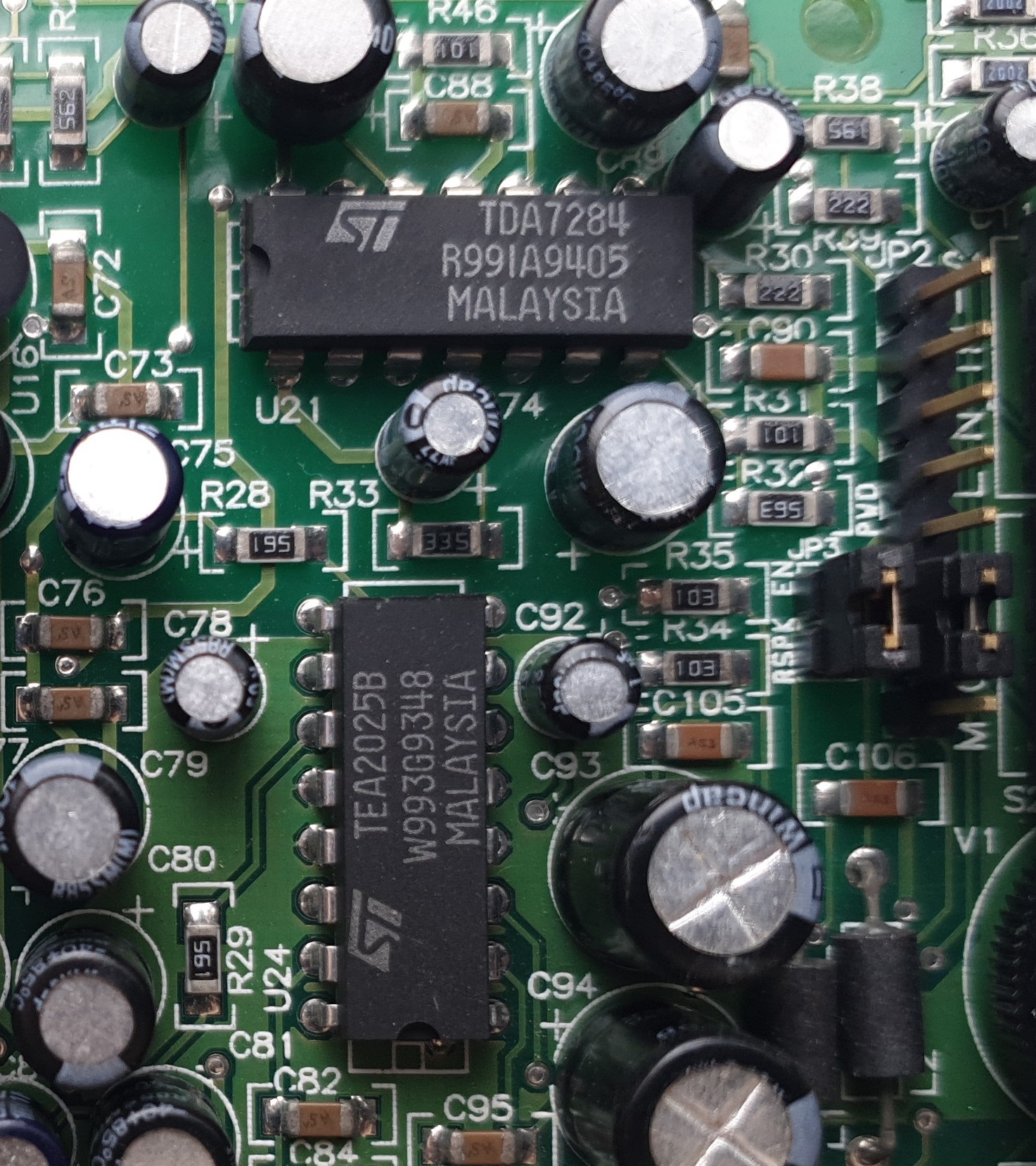 The IC above the amplifier is a TDA7284, which is more commonly found in audio cassette recorders, and handles the switching from recording to playback, and has Automatic Level Control (ALC) circuitry.