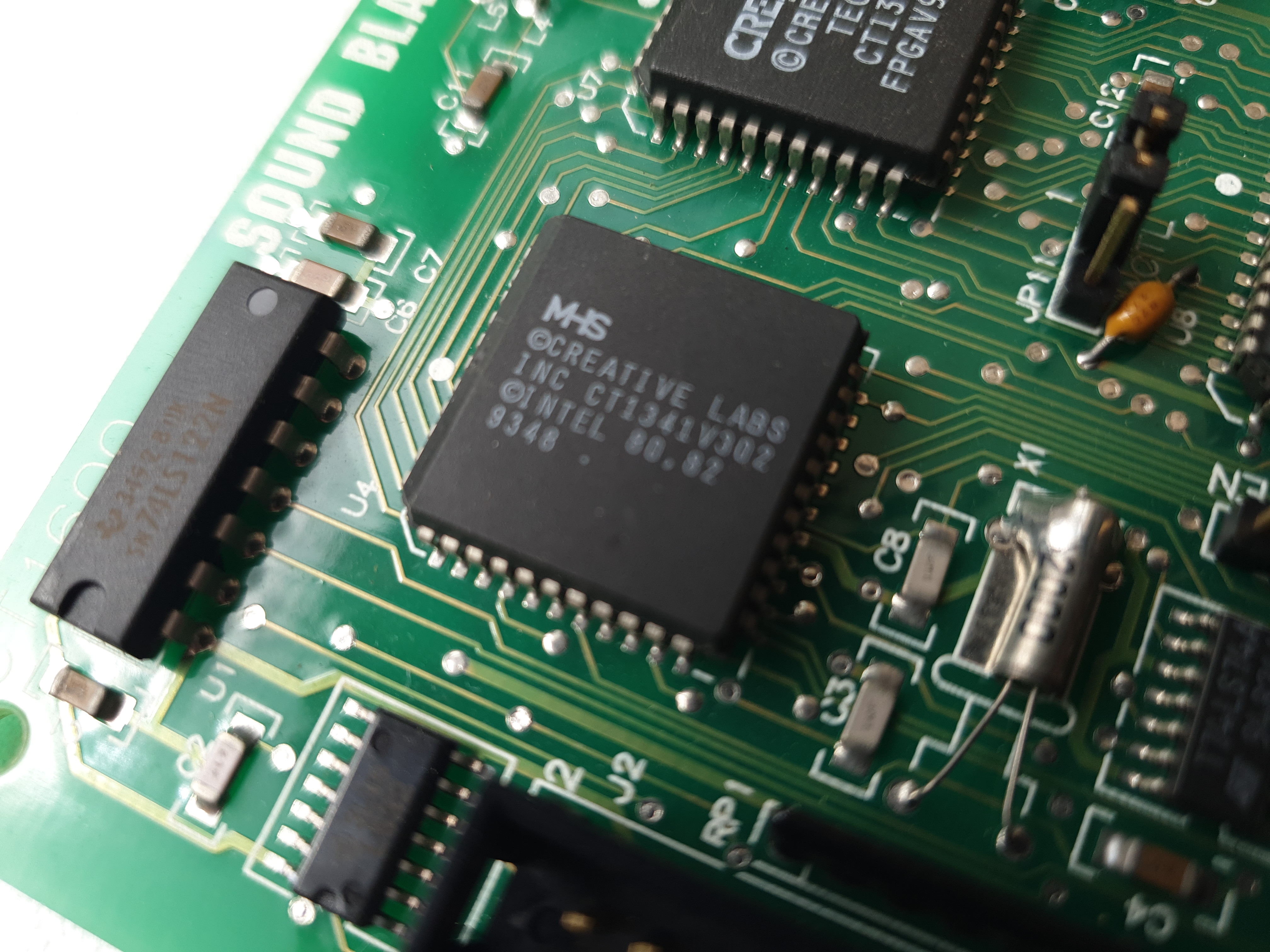 Date-wise, the most recent date stamp on the card's chips is week 48 of 1993, so the original manufacturing date of this Sound Blaster Pro II was certainly no earlier than the last week of November 1993. This puts it in the middle of the lifetime of the CT1600 - the Sound Blaster Pro 2 continued to be updated and sold alongside the Sound Blaster 16 for most of the SB16's life before Creative switched to the much more tightly-integrated ViBRA chip.