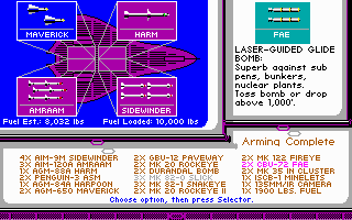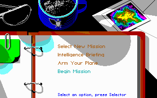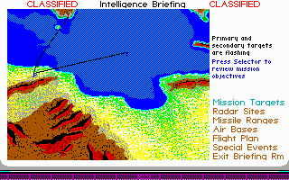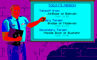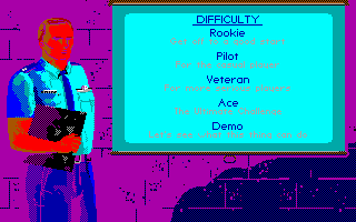 From the Microprose team, F-19 Stealth Fighter was the last flight simulator Sid Meier worked on. It is an interesting title to check out in EGA. I say this because many of the missions are set at night (you are, after all, trying to remain undetected in your stealth fighter!), meaning the colour palette while you are airborne is often dark. They did actually put in a good number of daytime missions too, possibly for the reason that the solid black sky might be offputting to some. The gameplay however really helps come to the rescue in this easily-accessible flight simulator. EGA is the highest graphics option, despite the box sticker and startup screen claiming to offer you a VGA/MCGA option - they're all in 16 colours.