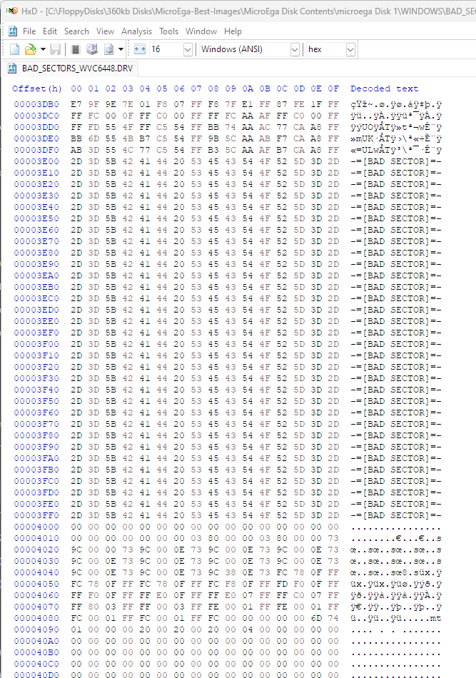 Octek MicroEGA Disk 2 Bad Lotus 1-2-3 132-column text mode driver file (LOTUS\LT132M.DRV) and the 640x480 driver file (LOTUS\LG64X48.DRV). Also bad Windows 1.x 640x480 driver (WINDOWS\WVC6448.DRV) and Windows 2.x 640x480 driver (WINDOWS\W2VC8060.DRV). |