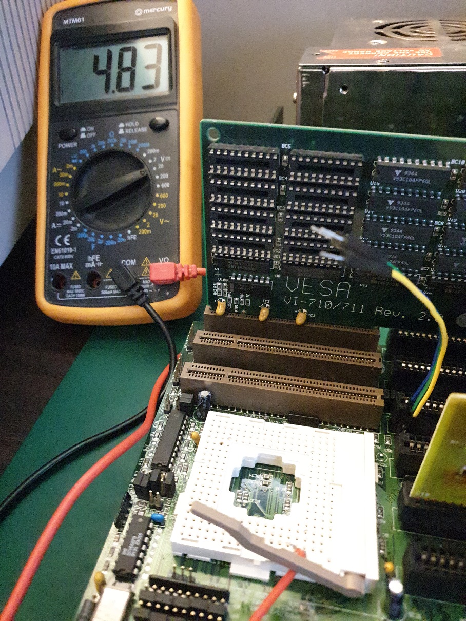Step 1 is to identify what each of those 3 pins on the board actually does. To do so, I will use some wires and my multimeter to check the voltage levels at each pin. The motherboard is currently configured to send 5V to the CPU socket, and my assumption is that these 3 pins take the 5V and ground from the main 5V rail so we should have at least a 5V and a GND, and maybe the third wire also showing 0V at this time because there is no regulator: