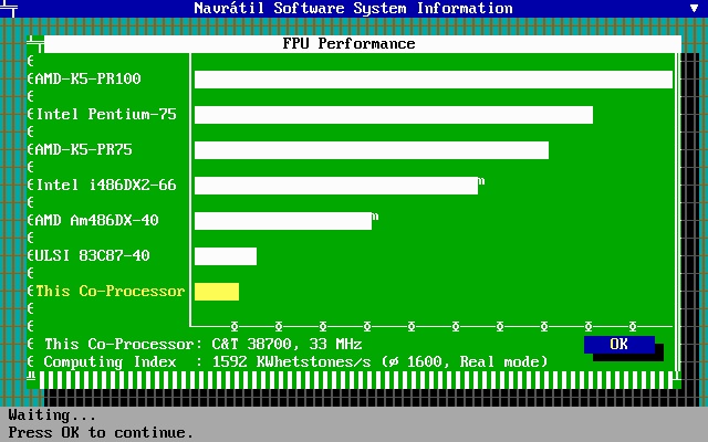 Interesting that it detects my Cyrix CX-83D87 FPU as a Chips & Technologies 38700 - the C&T one, also called "Super Math" is a different design entirely, but is also 100% compatible with the Intel 80387.